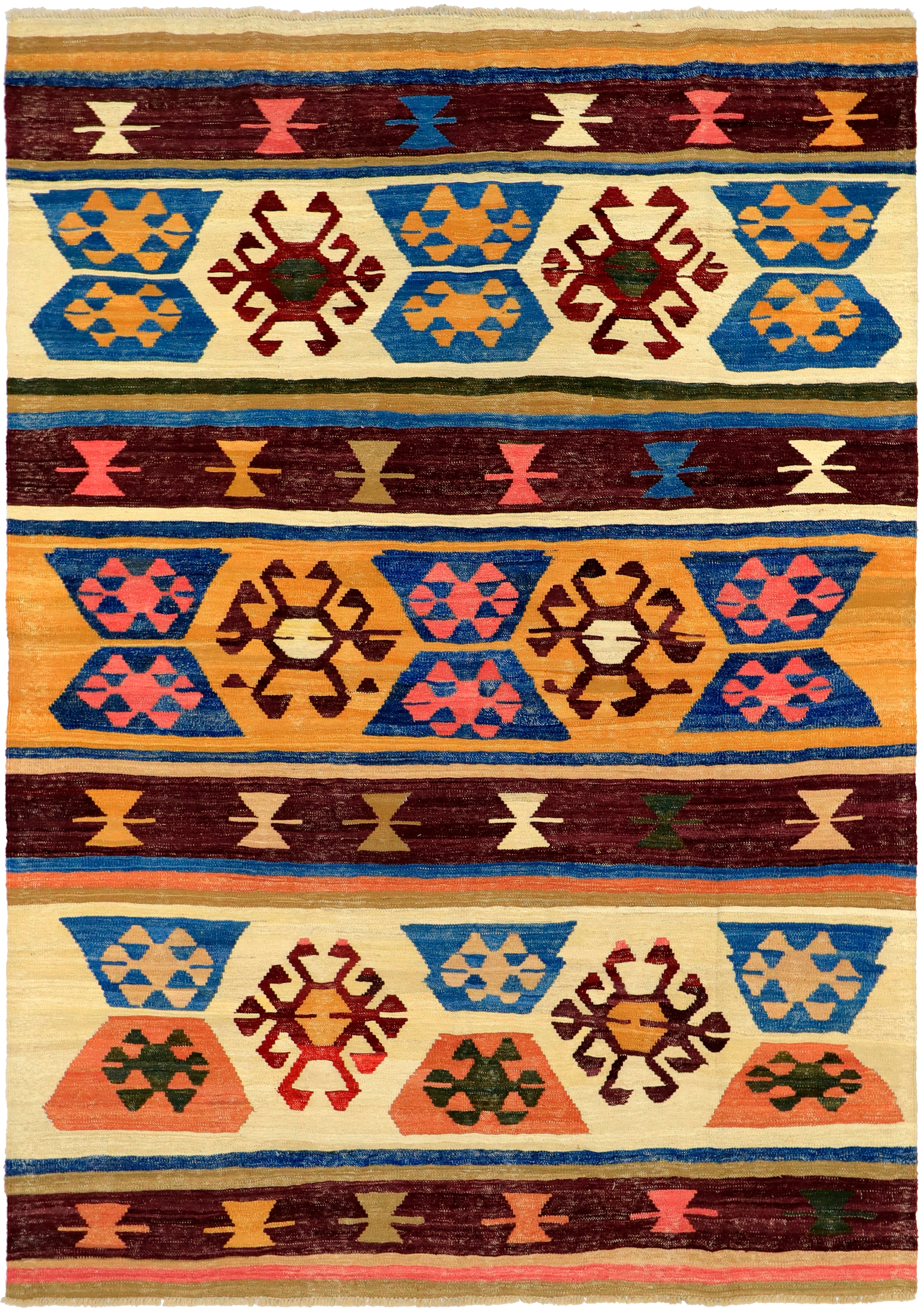 Maimana kilims are celebrated for their tightly woven construction, geometric tribal designs, and bold, earthy colour palettes. Their patterns are often rooted in the nomadic traditions of the region, reflecting a mix of Turkmen, Uzbek, and Pashtun influences.