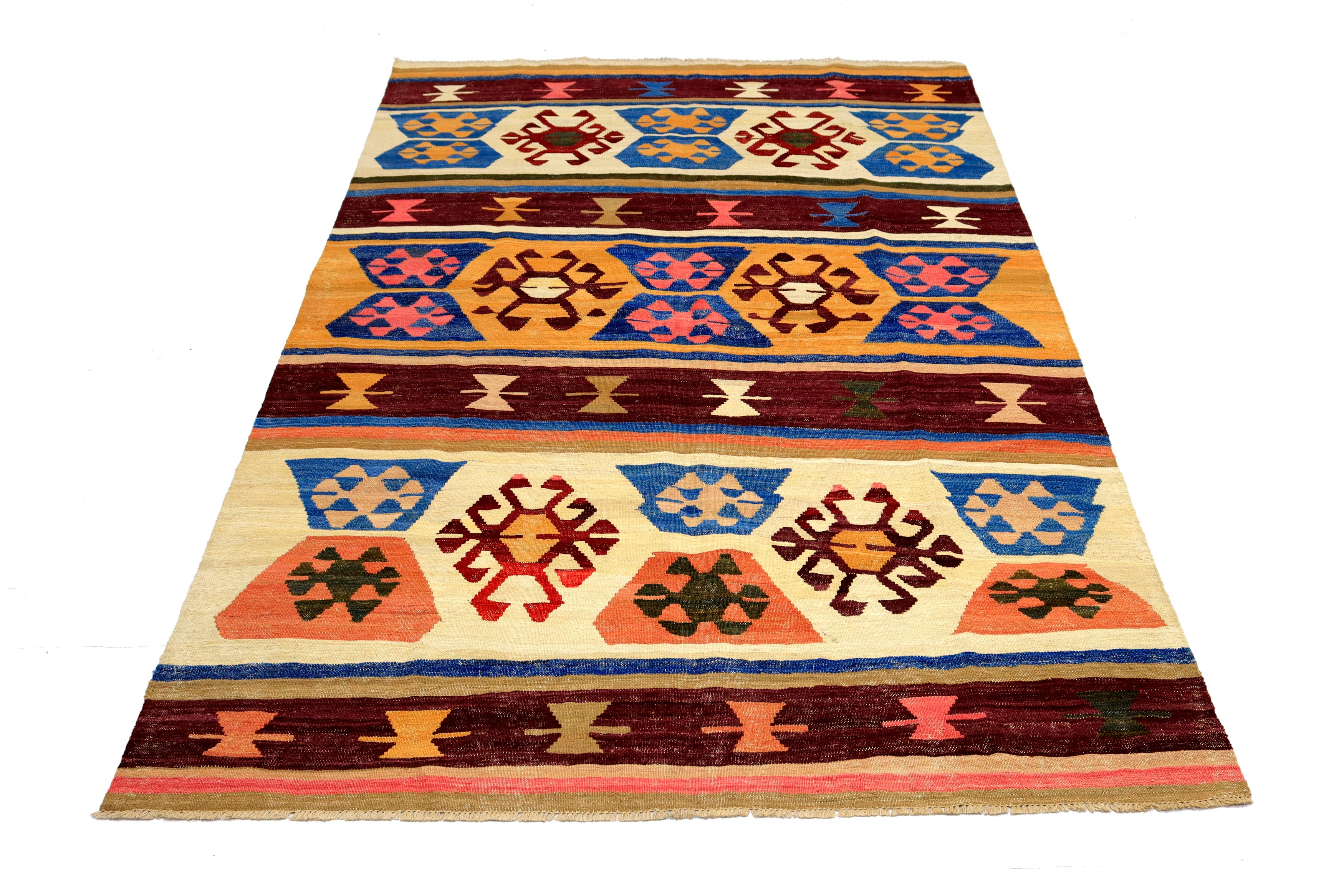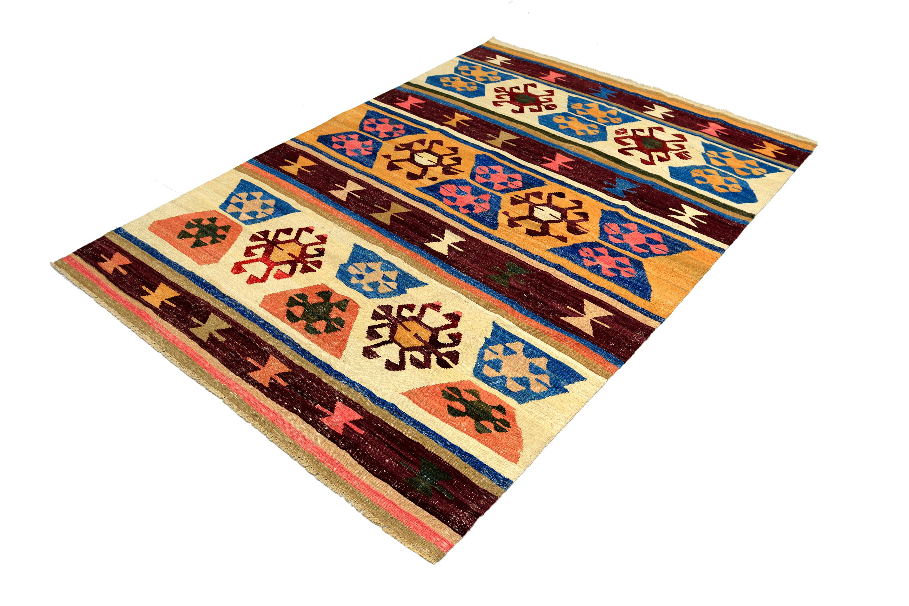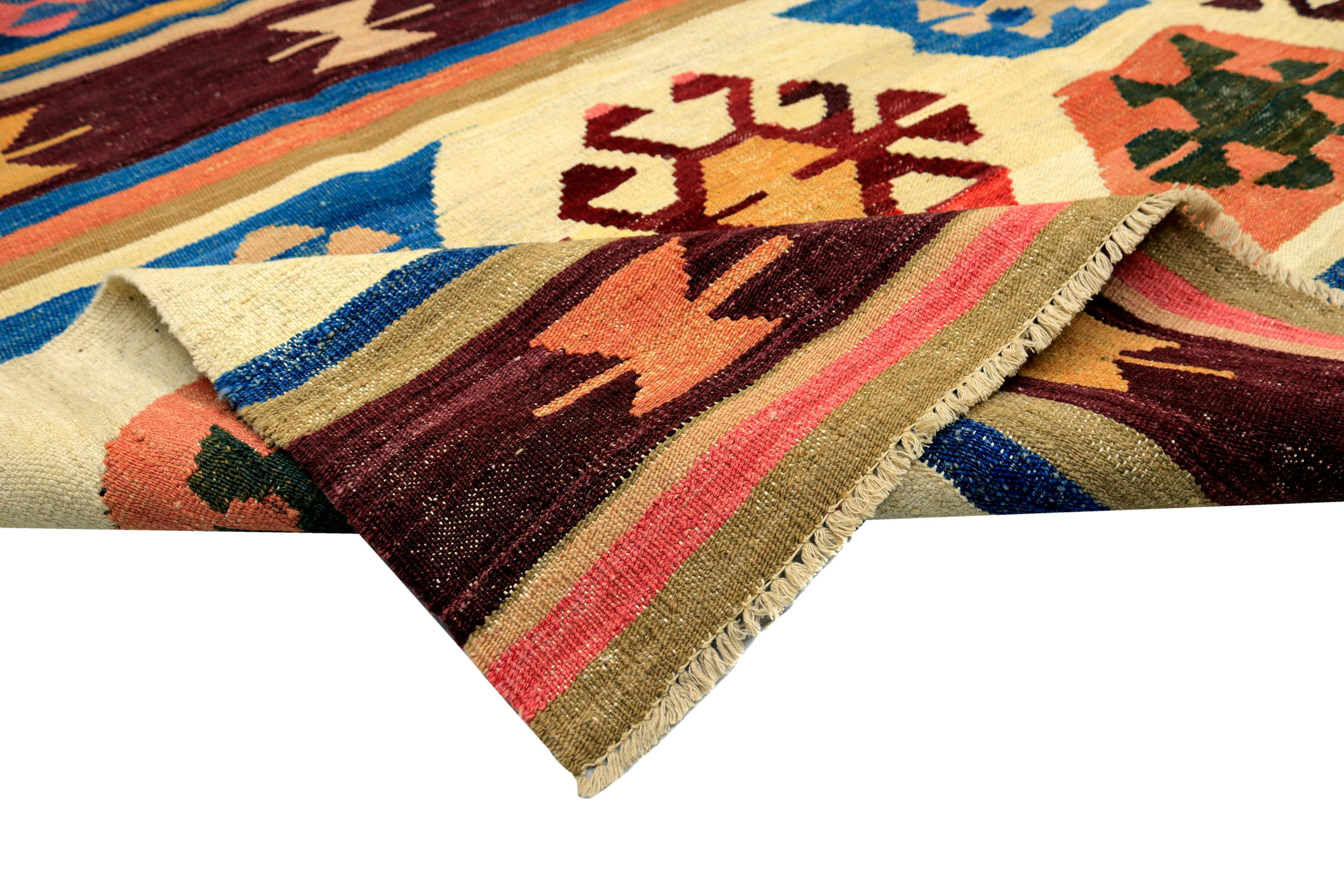 This handmade wool kilim comes from Maimana, a provincial capital in northern Afghanistan known for producing some of the country's most distinctive flatweave rugs. The weaving tradition in this region dates back centuries, with each kilim woven on horizontal ground looms using local wool and age-old techniques passed down through generations.