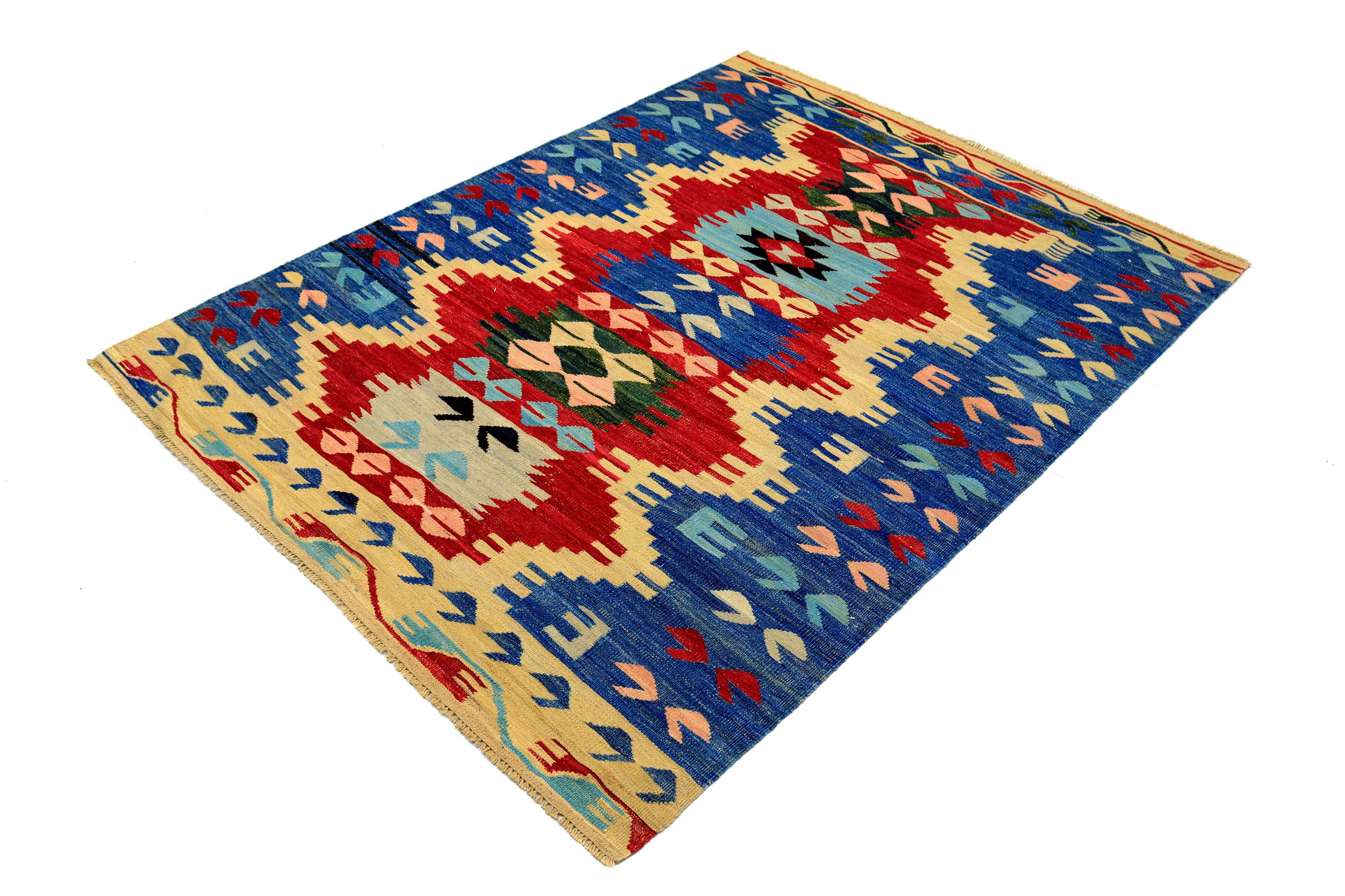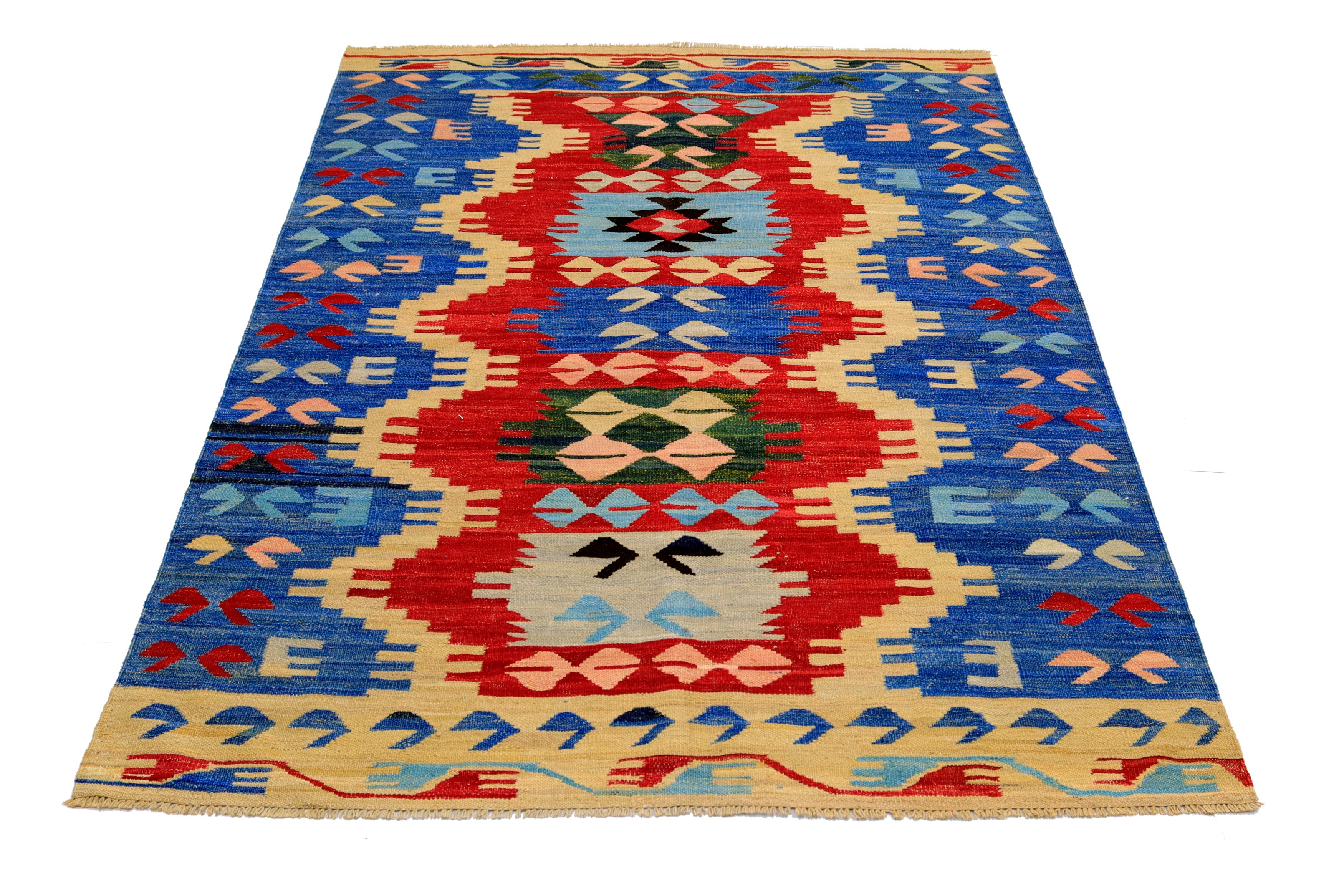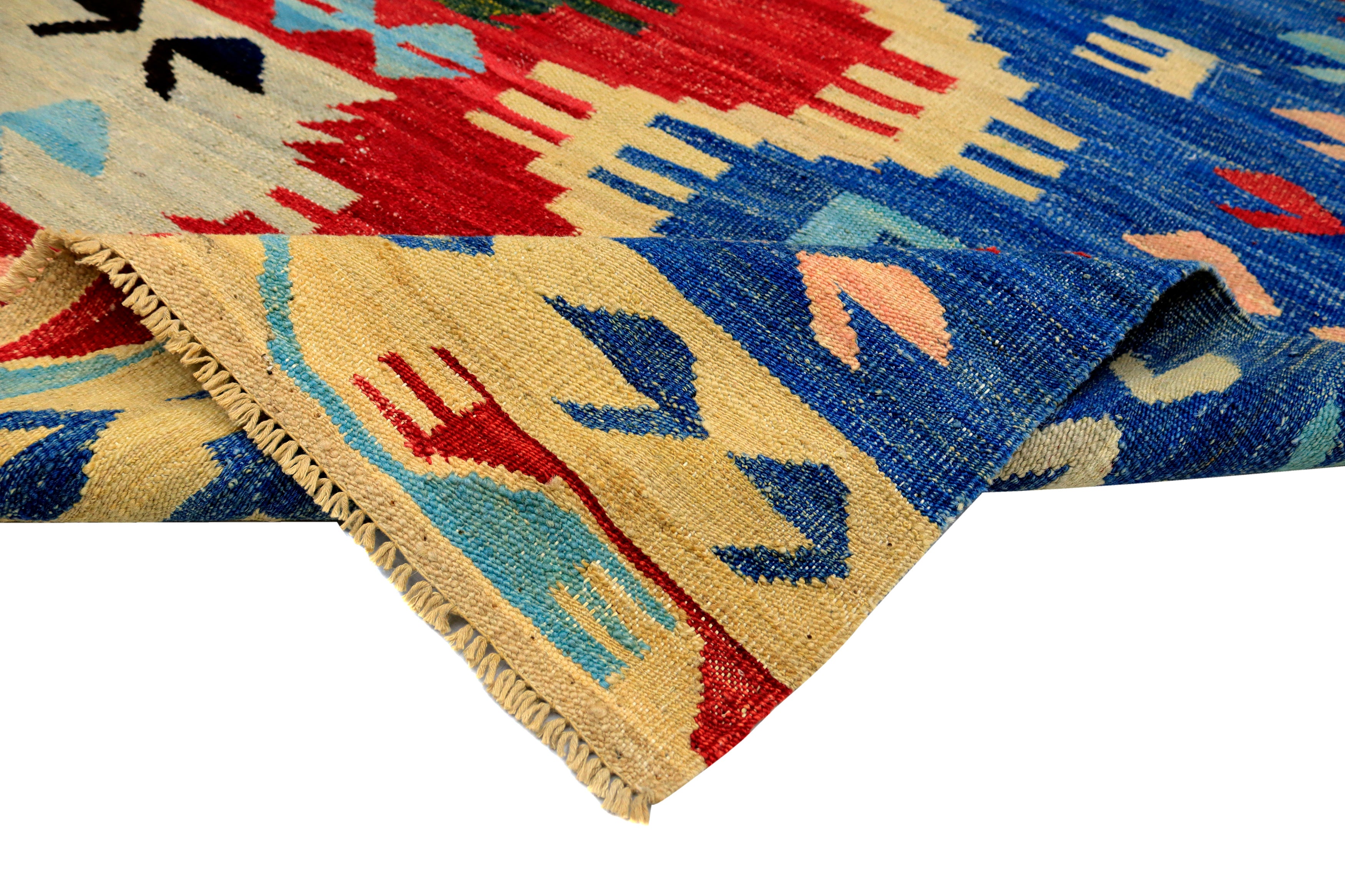 This handmade wool kilim comes from Maimana, a provincial capital in northern Afghanistan known for producing some of the country's most distinctive flatweave rugs. The weaving tradition in this region dates back centuries, with each kilim woven on horizontal ground looms using local wool and age-old techniques passed down through generations.