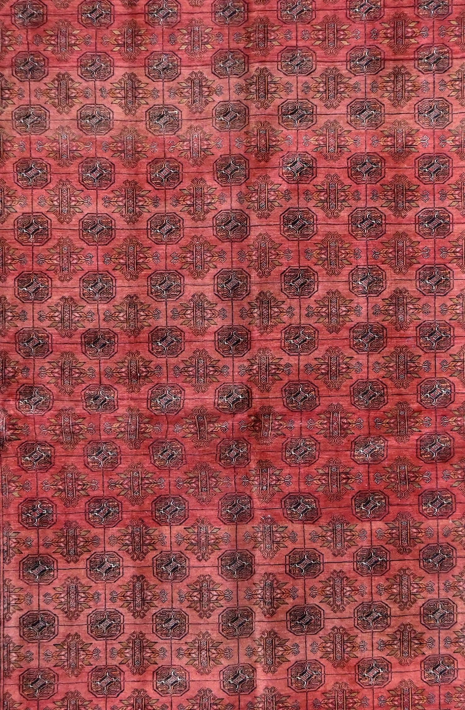 The field is structured with repeating geometric medallions known as guls, arranged in neat rows across the rug. These motifs are the signature of Turkmen weaving and give the rug its strong sense of rhythm and order. The palette is built around rich, deep reds, a colour historically achieved with natural dyes and favoured across Turkmen tribes, with darker accents that help define the pattern.