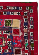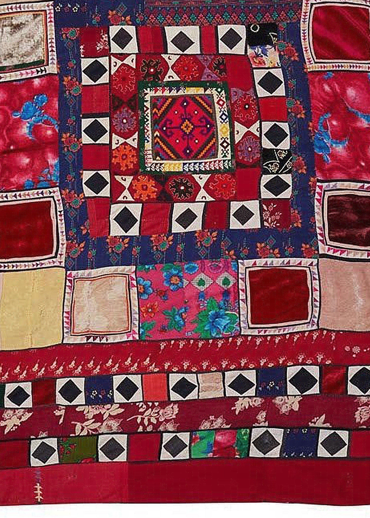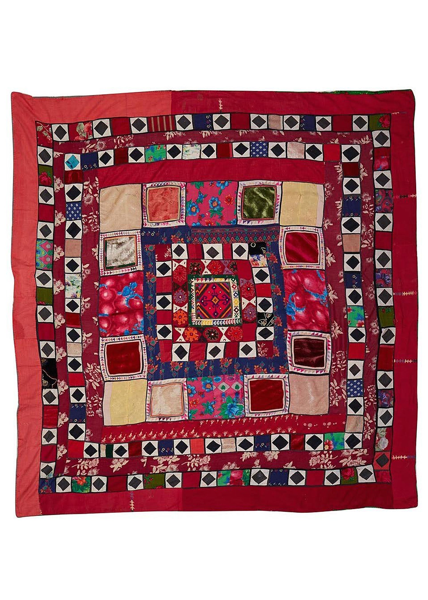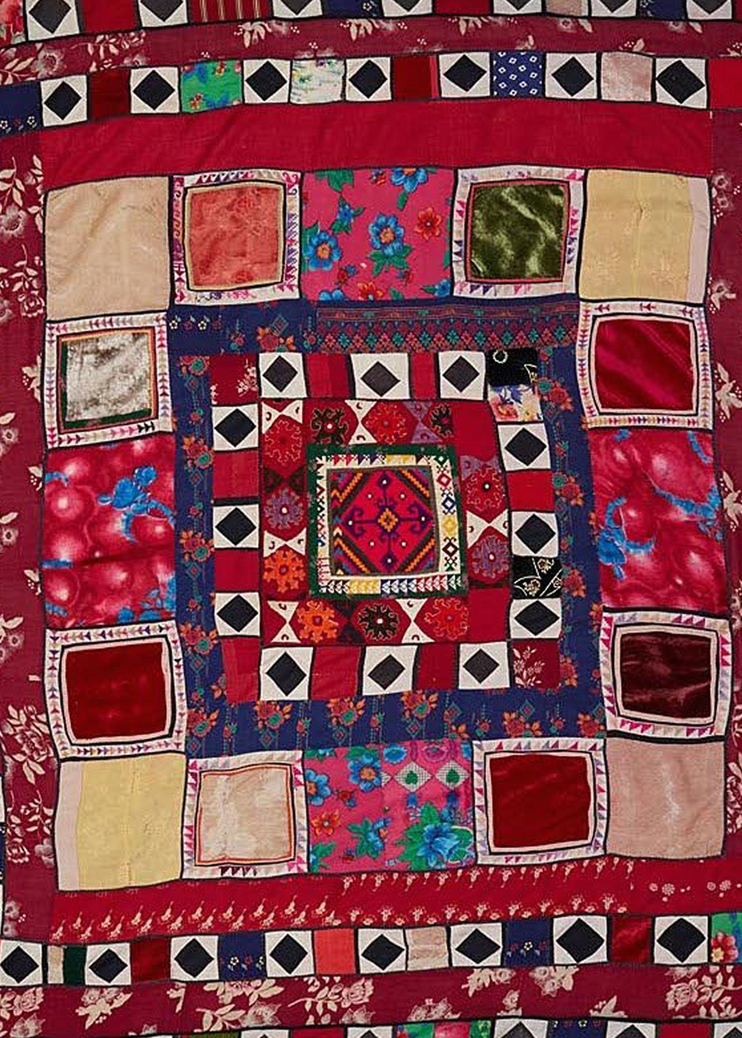 This piece is made in a patchwork format, with different panels joined together, each showing slight variations in colour, material and stitching. The central medallion is bold and floral, while the surrounding borders shift between geometric motifs and rich blocks of velvet and cotton.