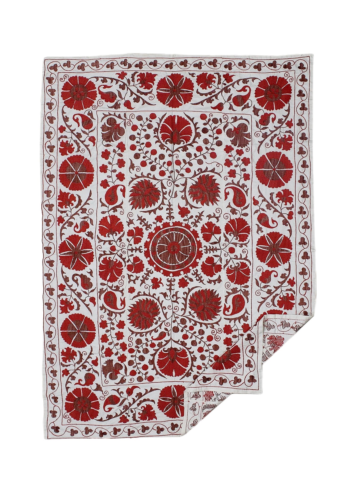 The design features traditional Suzani motifs such as blooms, leaves, fruits and celestial emblems, each symbolising prosperity, joy and protection. Every stitch whispers of the artisan’s hand, their patience and the generations of skill passed down to create it.