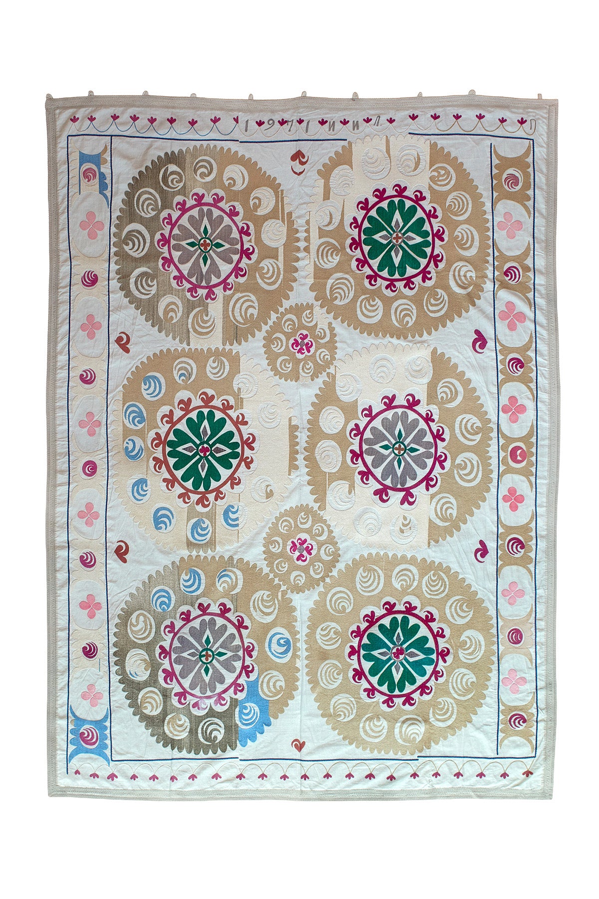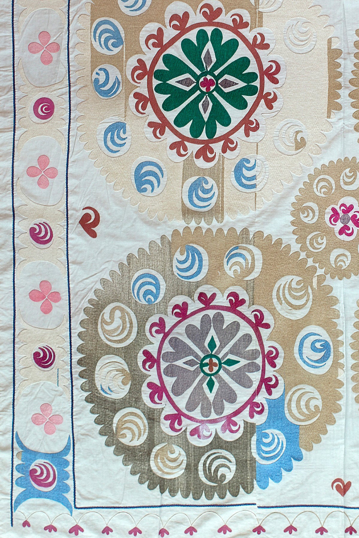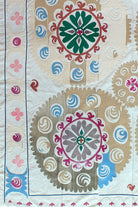 A beautifully balanced Suzani with a gentle yet distinctive colour palette that feels both traditional and quietly modern.