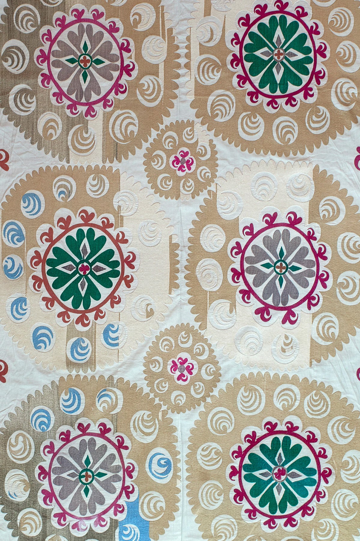 This Uzbek Suzani is embroidered on a cotton ground and features a bold arrangement of large circular medallions set within a beautifully balanced composition. Suzani textiles have long been an important part of Central Asian domestic life, traditionally created by women as part of a bride’s dowry and used to decorate the home.