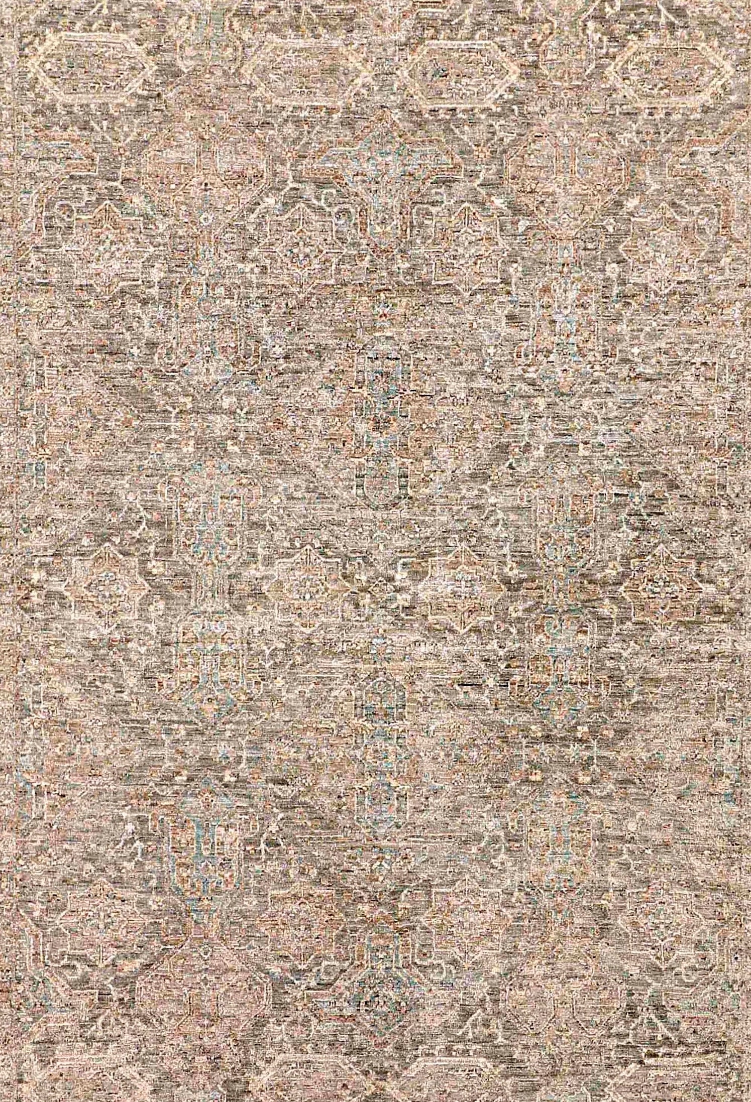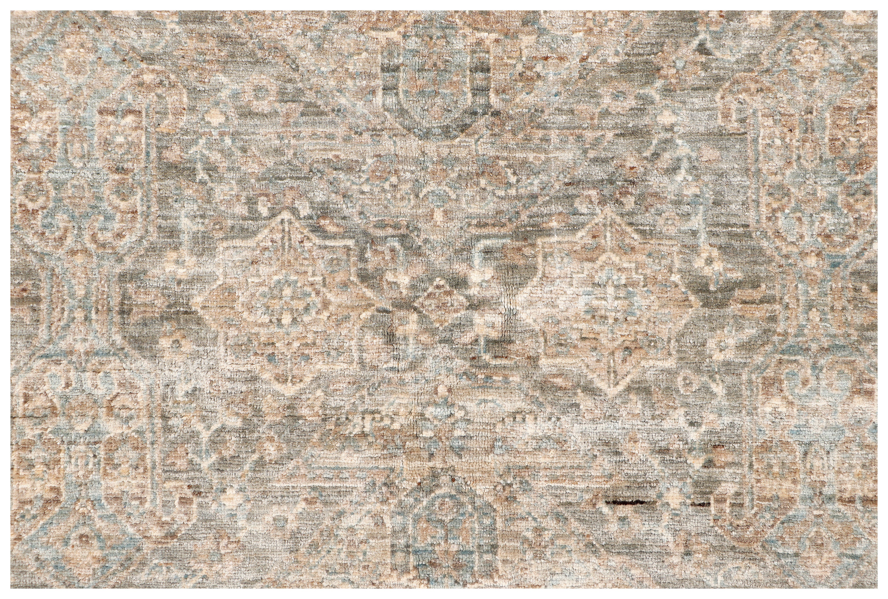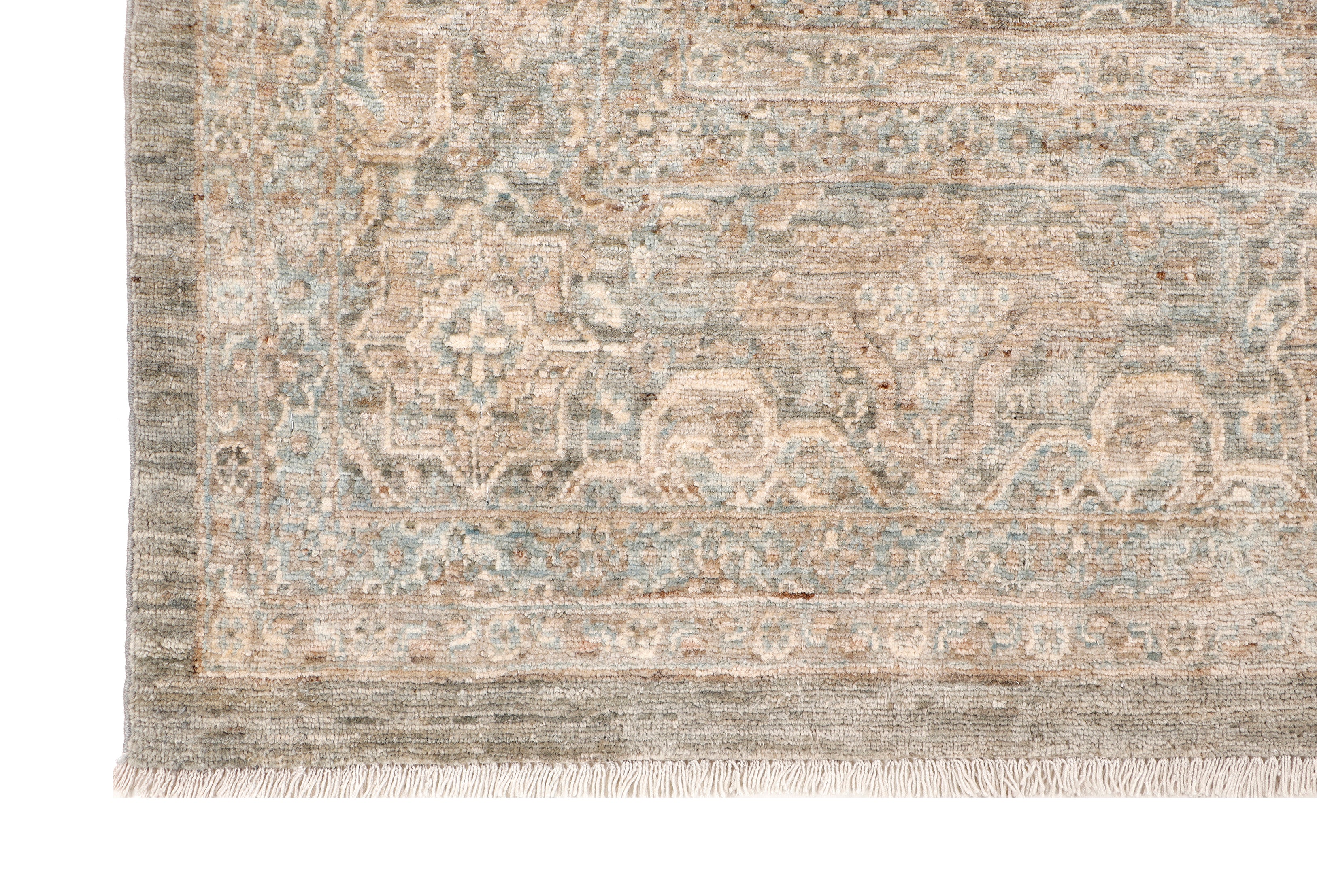 This rug has been woven with a tightly packed knot structure, giving it a fine, durable finish and allowing for greater detail in the design. The wool is hand-spun using traditional methods and selected for its quality, softness, and natural strength. It holds onto its lanolin, which gives the rug a silky sheen and that smooth, velvety feel underfoot.
