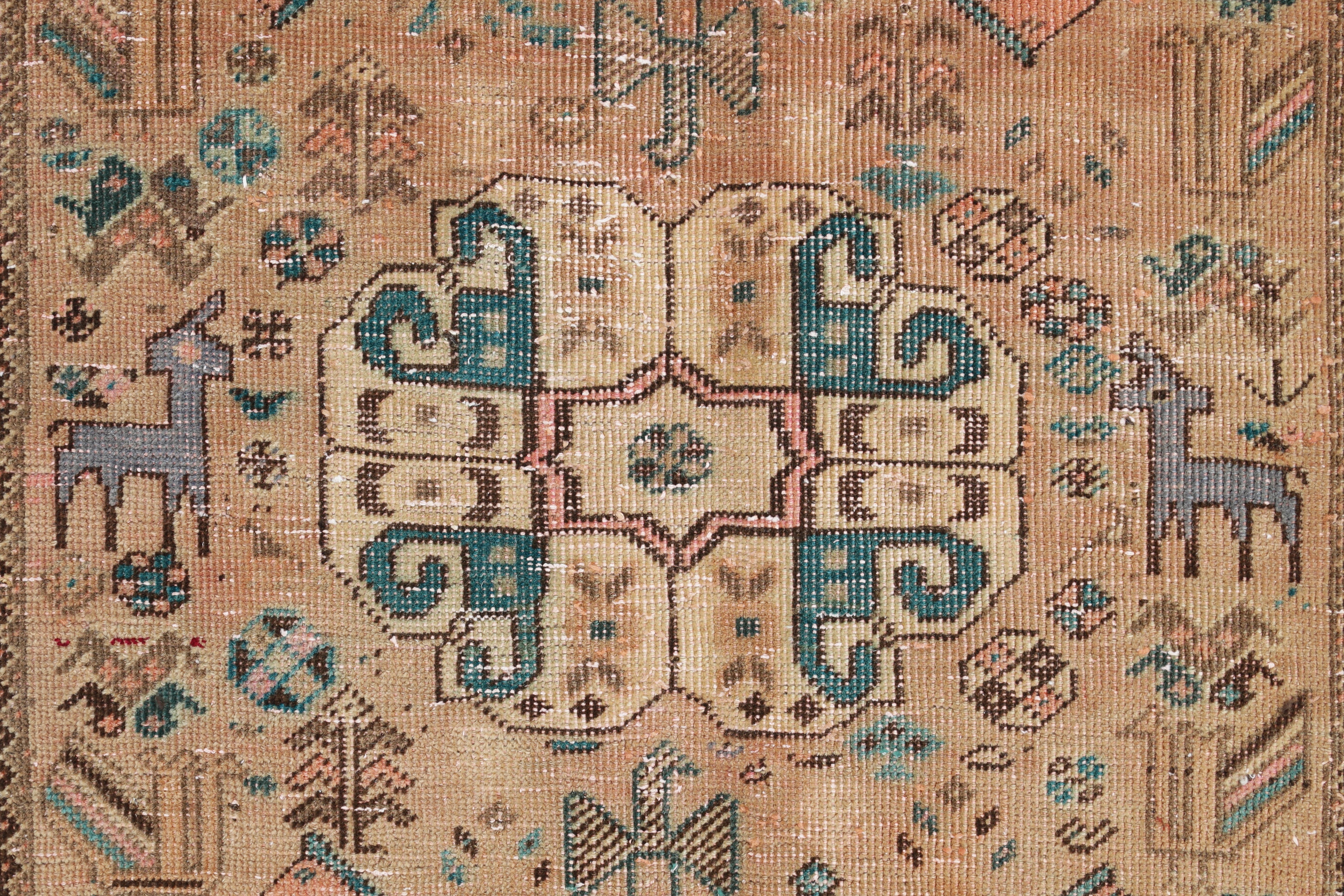 Designs are bold and geometric: central diamond medallions, interconnected diamond patterns, stylised animals, tribal symbols. Common motifs include the tree of life, nightingales (representing contentment and happiness), and sometimes depictions of Cyrus's horse. Borders typically feature bands of pine and palm leaves.