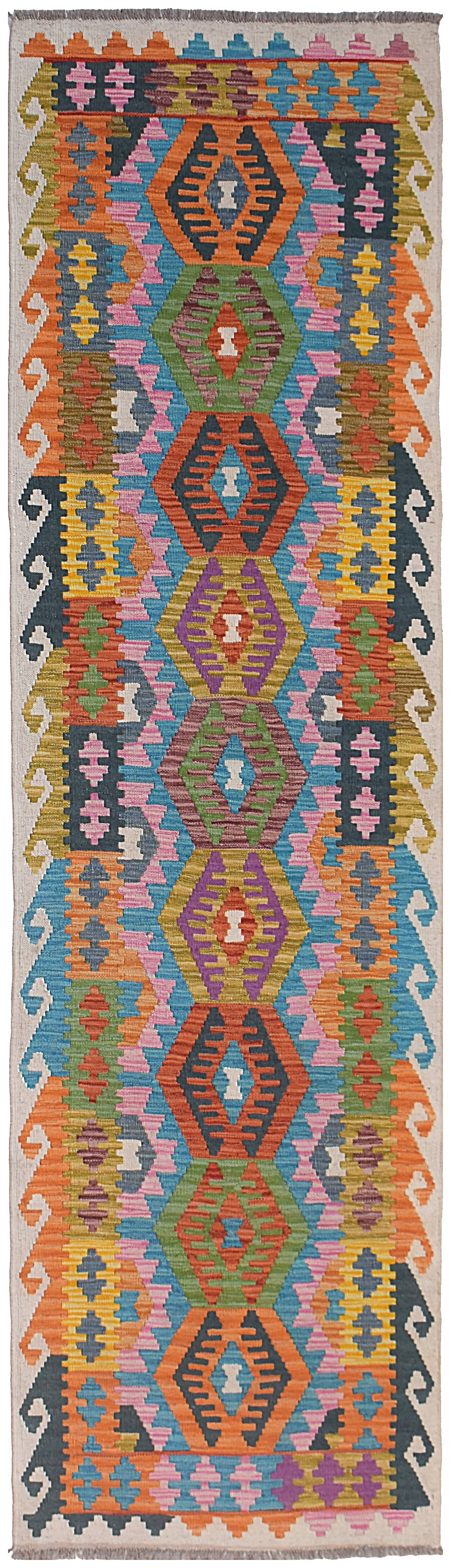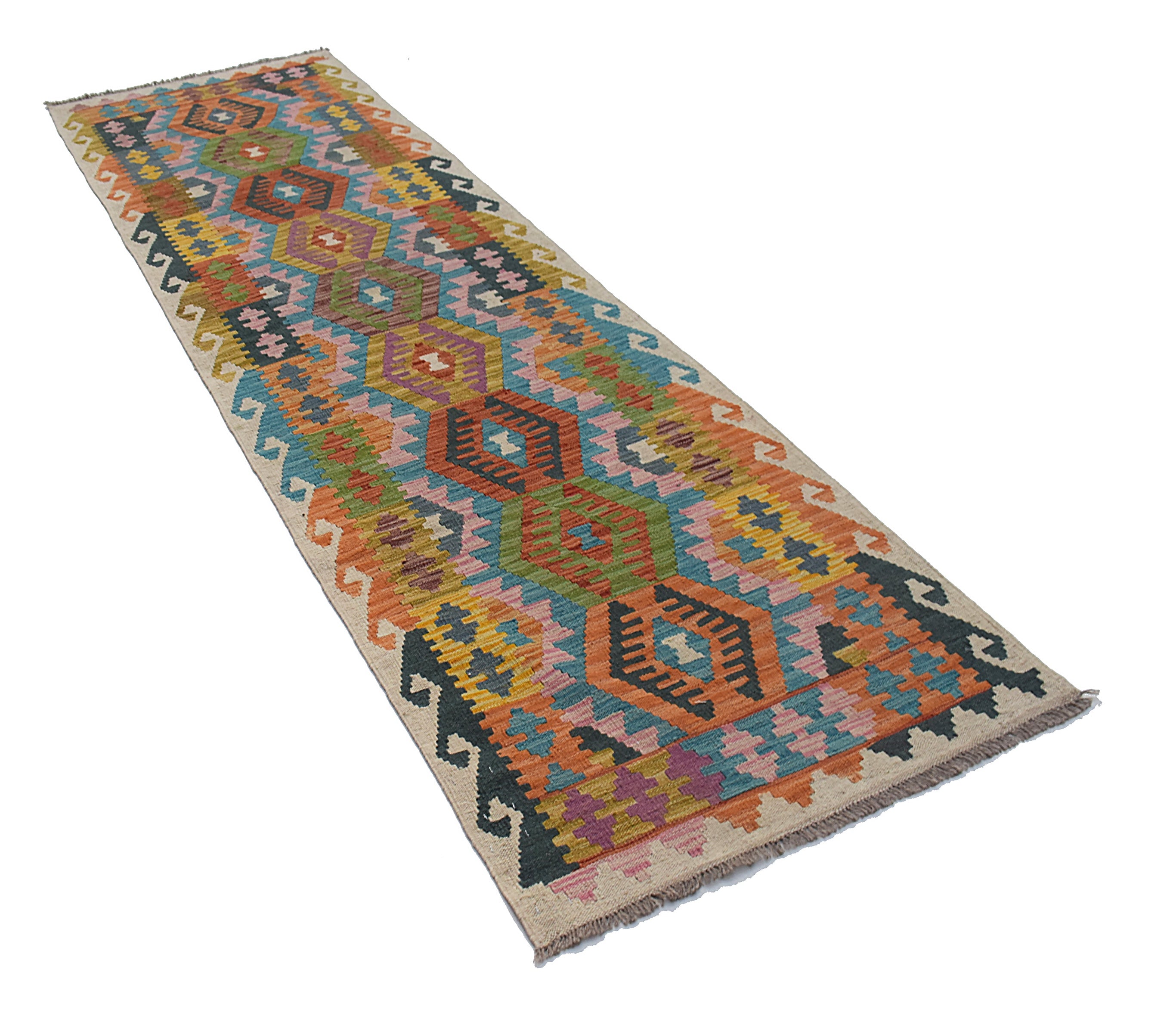 Maimana kilims are a proud product of the Frayab province in northern Afghanistan, with their name derived from the historic city of Maimana, a key trading hub along the ancient Silk Road. These kilims reflect centuries-old weaving traditions passed down through generations of tribal artisans. Their distinctive geometric patterns and bold designs are influenced by the nomadic lifestyle of the region, where practicality meets artistry in textile creation. The Maimana region is known for its semi-arid landscapes, where the weavers source high-quality wool from local sheep, spin it by hand, and dye it using natural substances, often inspired by the earthy hues of their surroundings. These kilims are flatwoven without a pile, a technique that makes them lightweight, reversible, and perfect for diverse applications, from floor coverings to wall hangings.