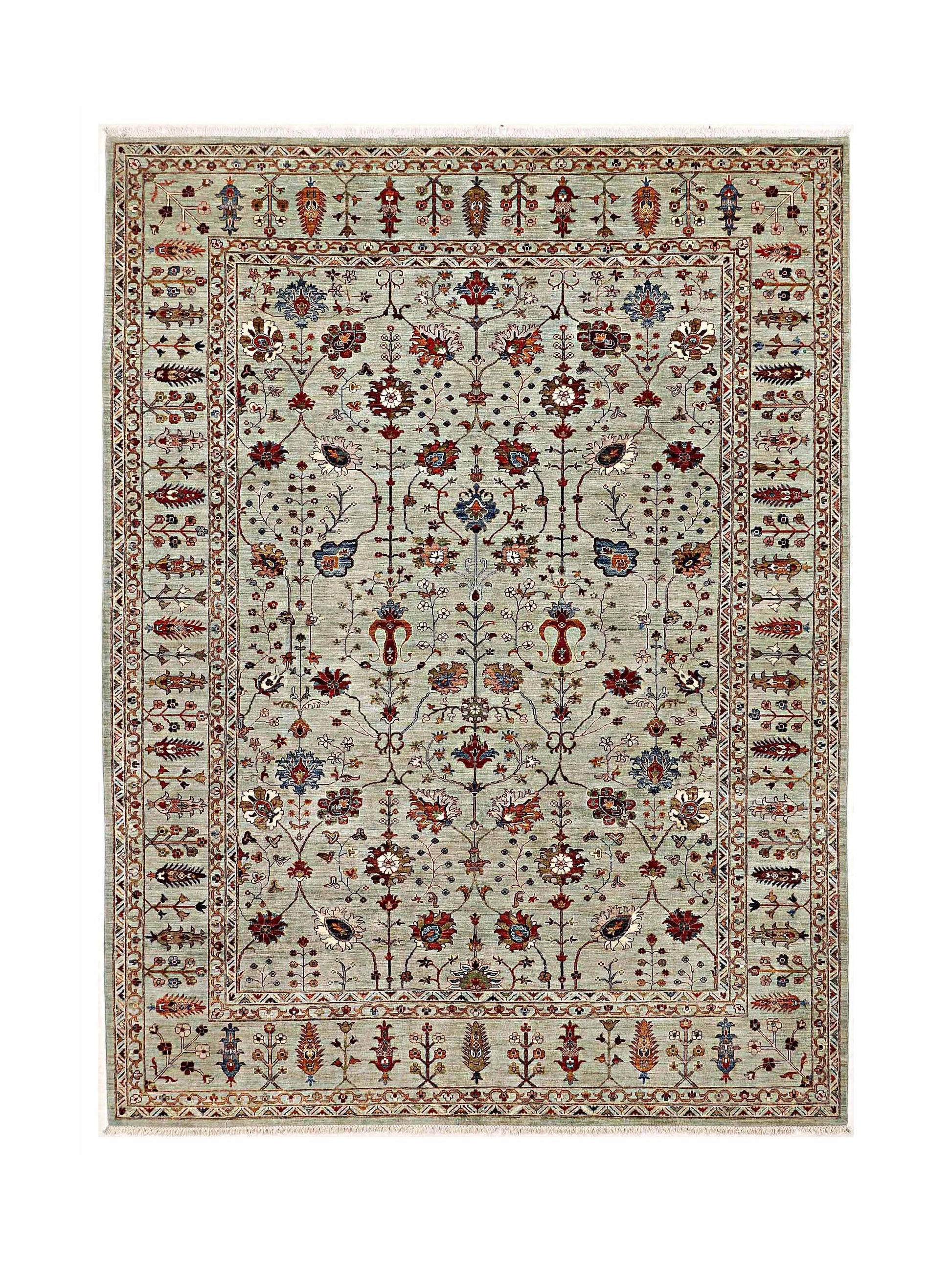 This rug has been woven with a tightly packed knot structure, giving it a fine, durable finish and allowing for greater detail in the design. The wool is hand-spun using traditional methods and selected for its quality, softness, and natural strength. It holds onto its lanolin, which gives the rug a silky sheen and that smooth, velvety feel underfoot.