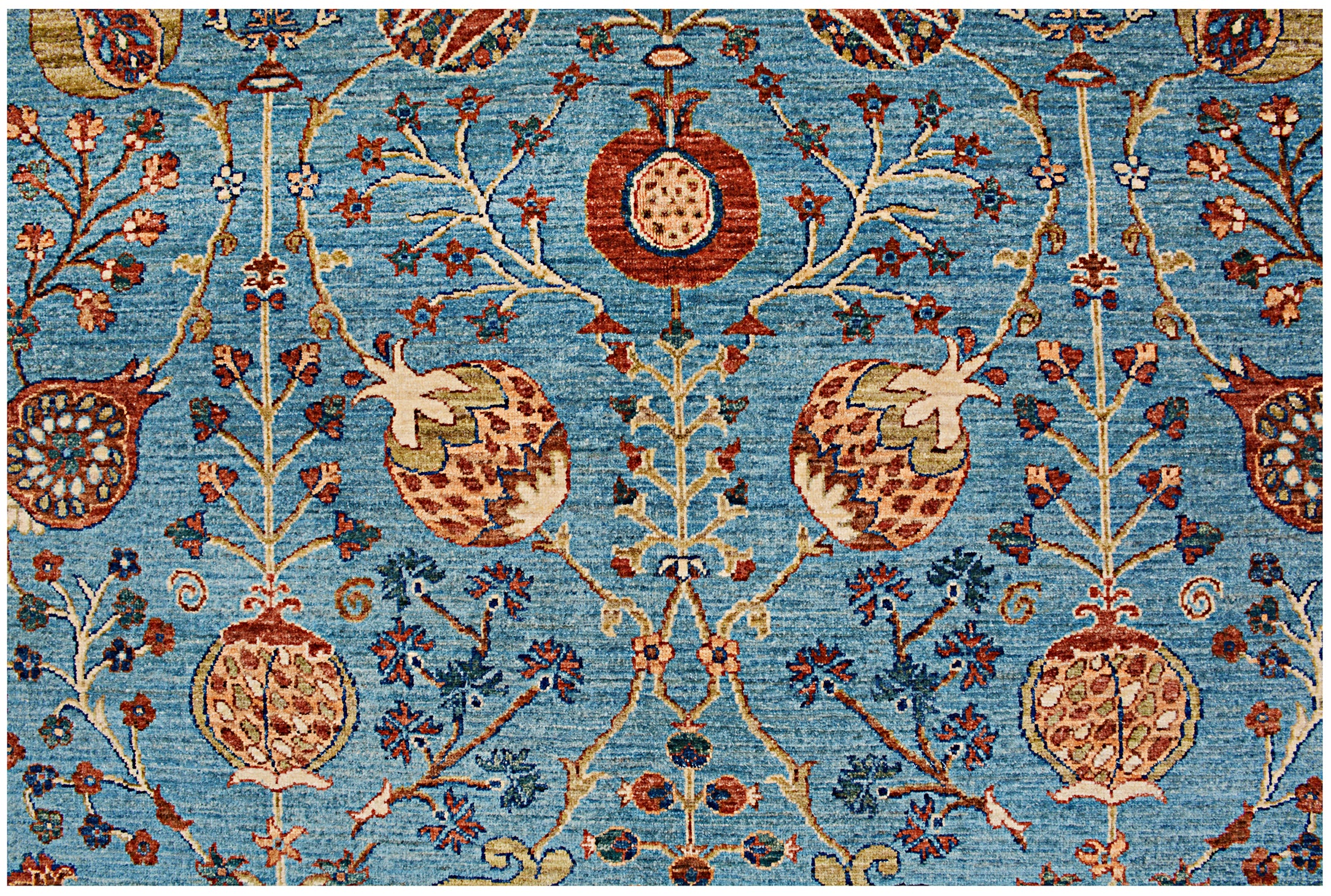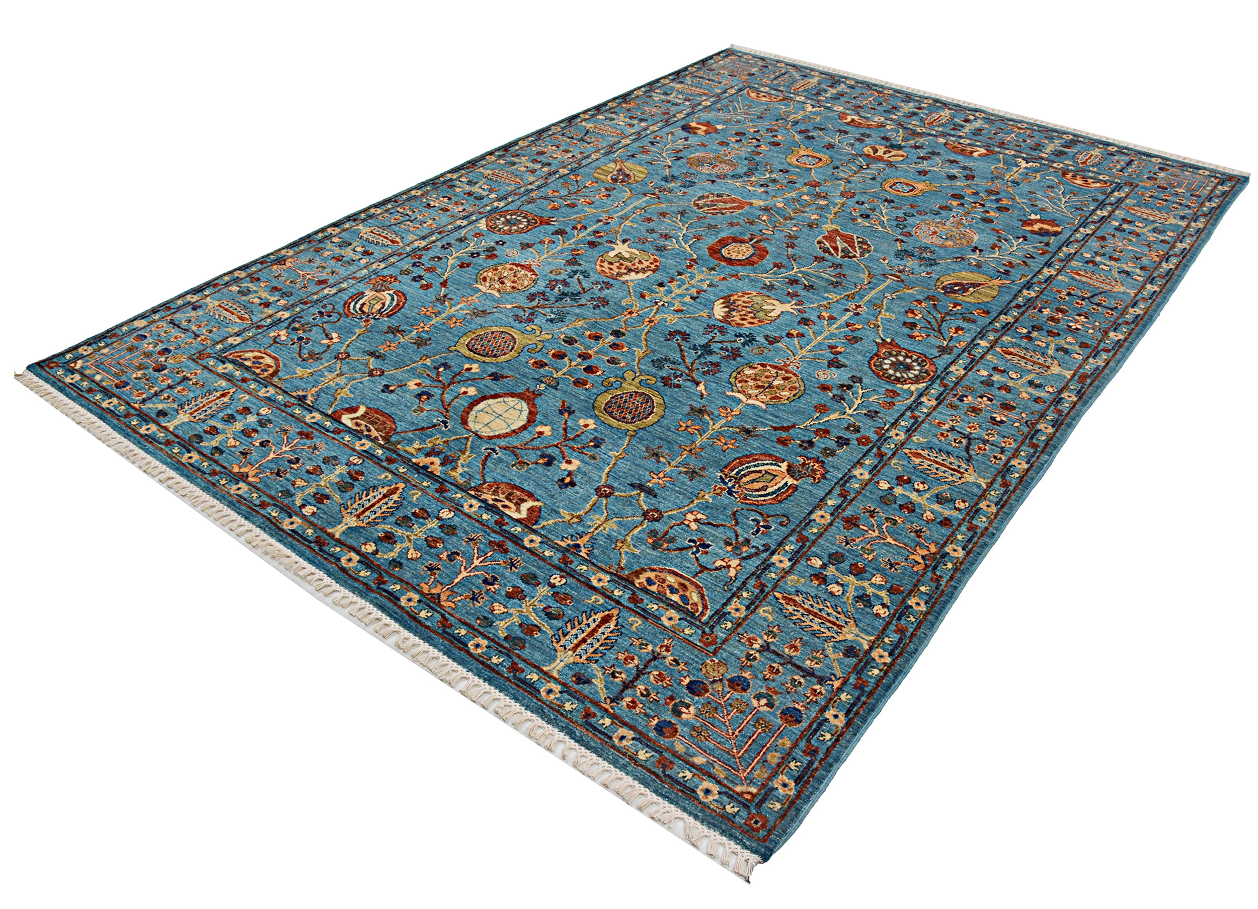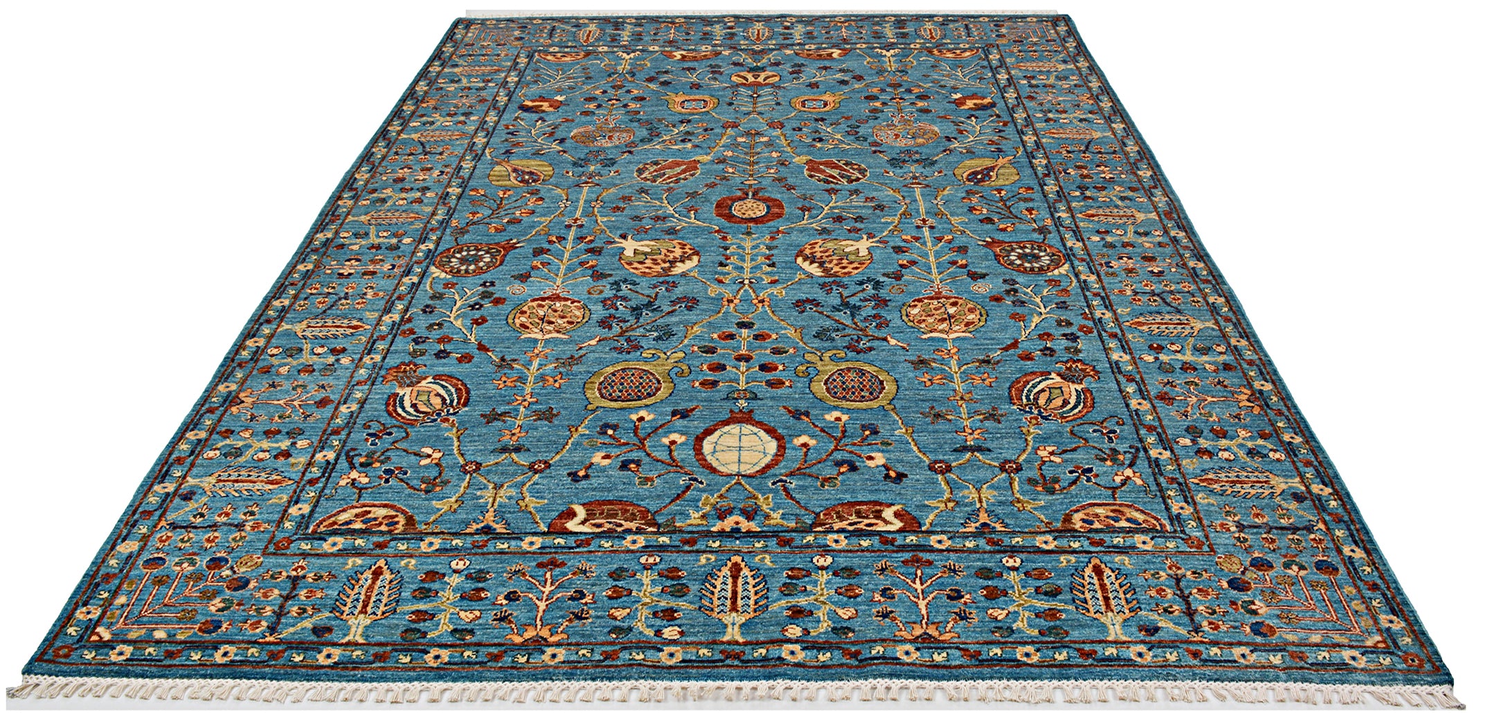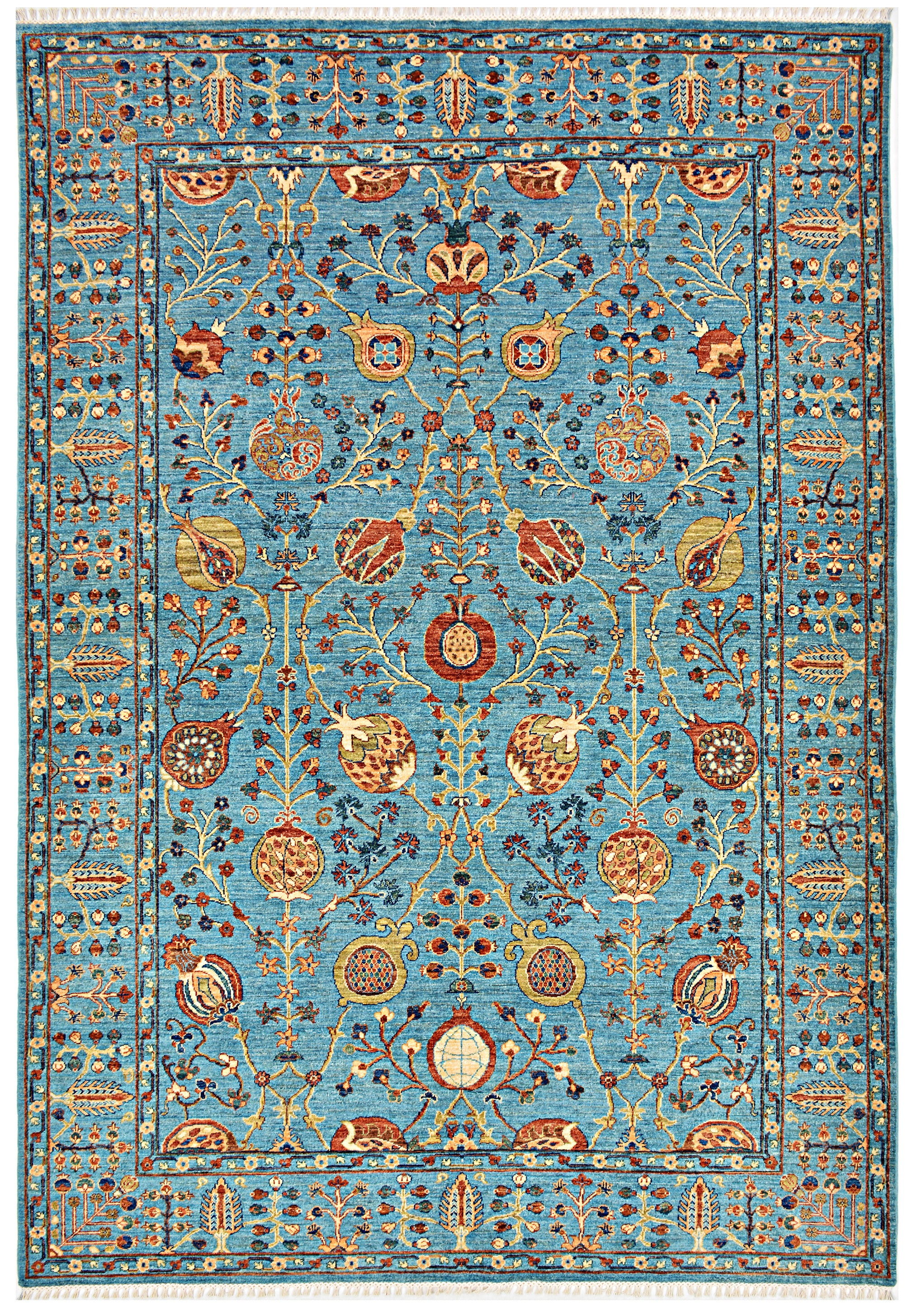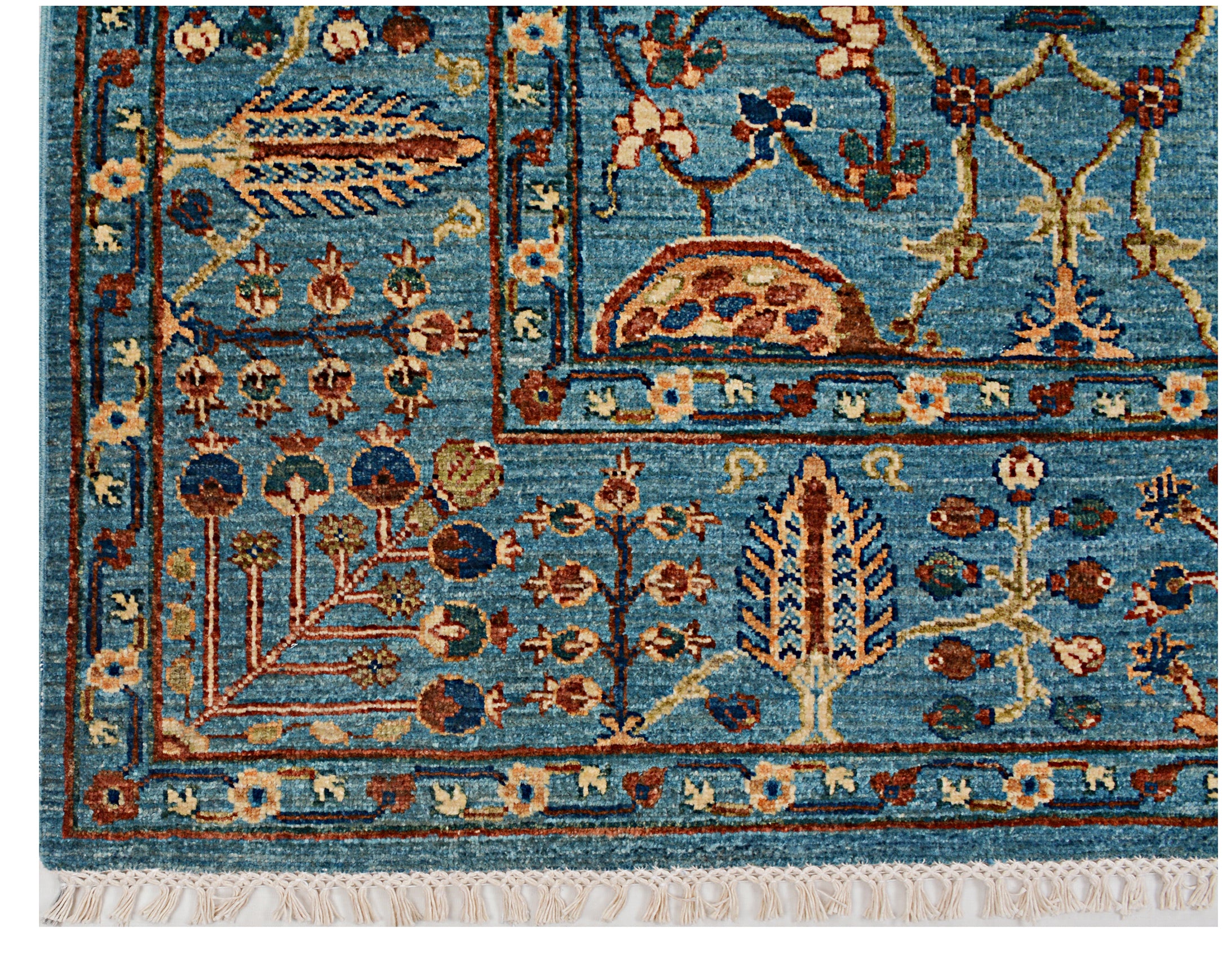 This rug has been woven with a tightly packed knot structure, giving it a fine, durable finish and allowing for greater detail in the design. The wool is hand-spun using traditional methods and selected for its quality, softness, and natural strength. It holds onto its lanolin, which gives the rug a silky sheen and that smooth, velvety feel underfoot.