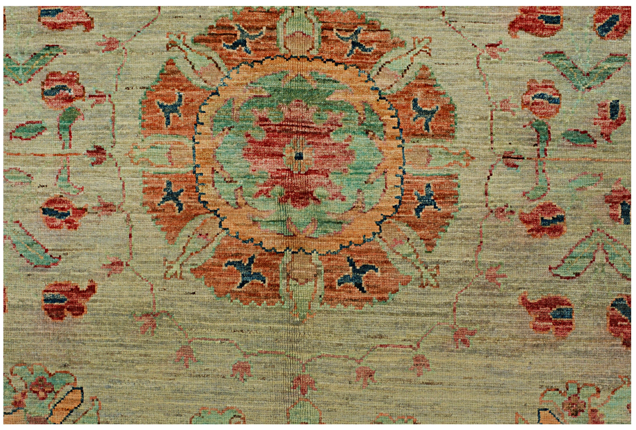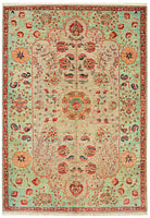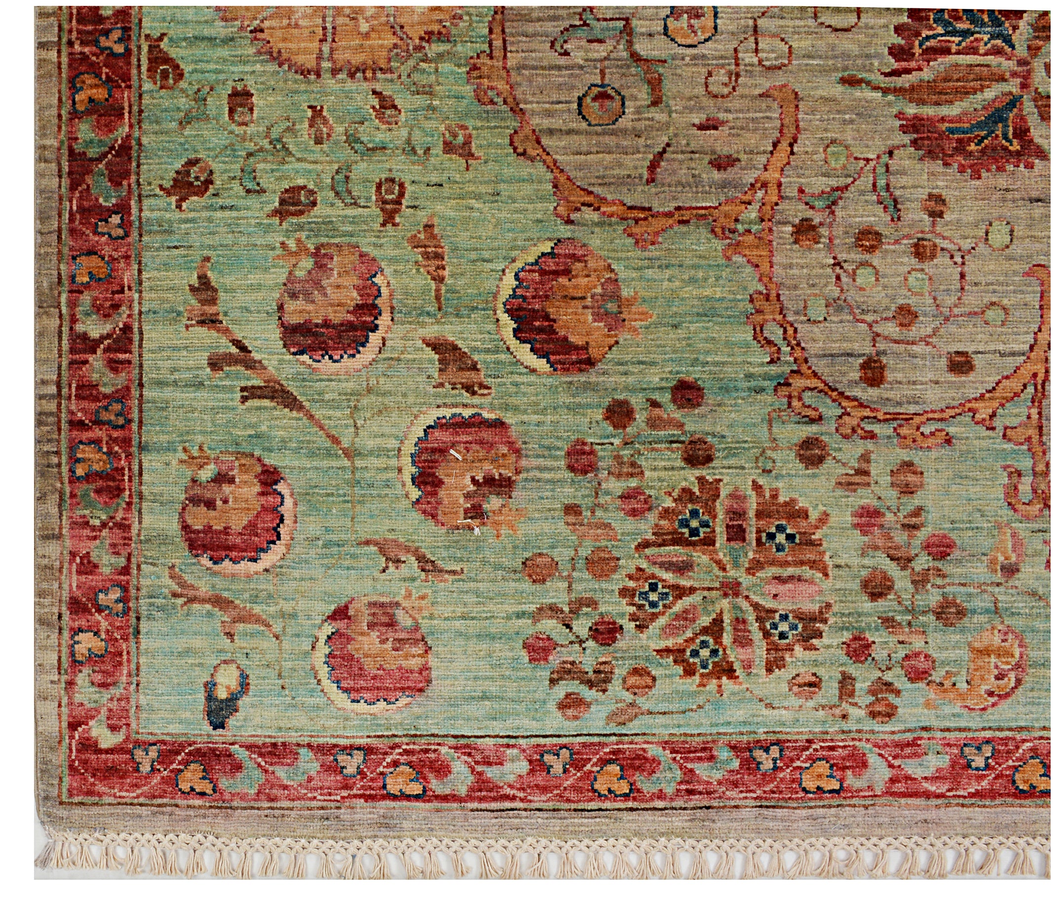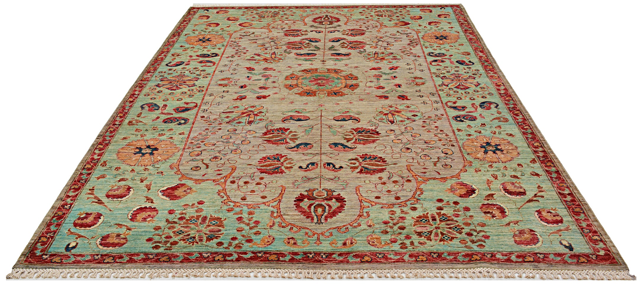 This rug has been woven with a tightly packed knot structure, giving it a fine, durable finish and allowing for greater detail in the design. The wool is hand-spun using traditional methods and selected for its quality, softness, and natural strength. It holds onto its lanolin, which gives the rug a silky sheen and that smooth, velvety feel underfoot.
