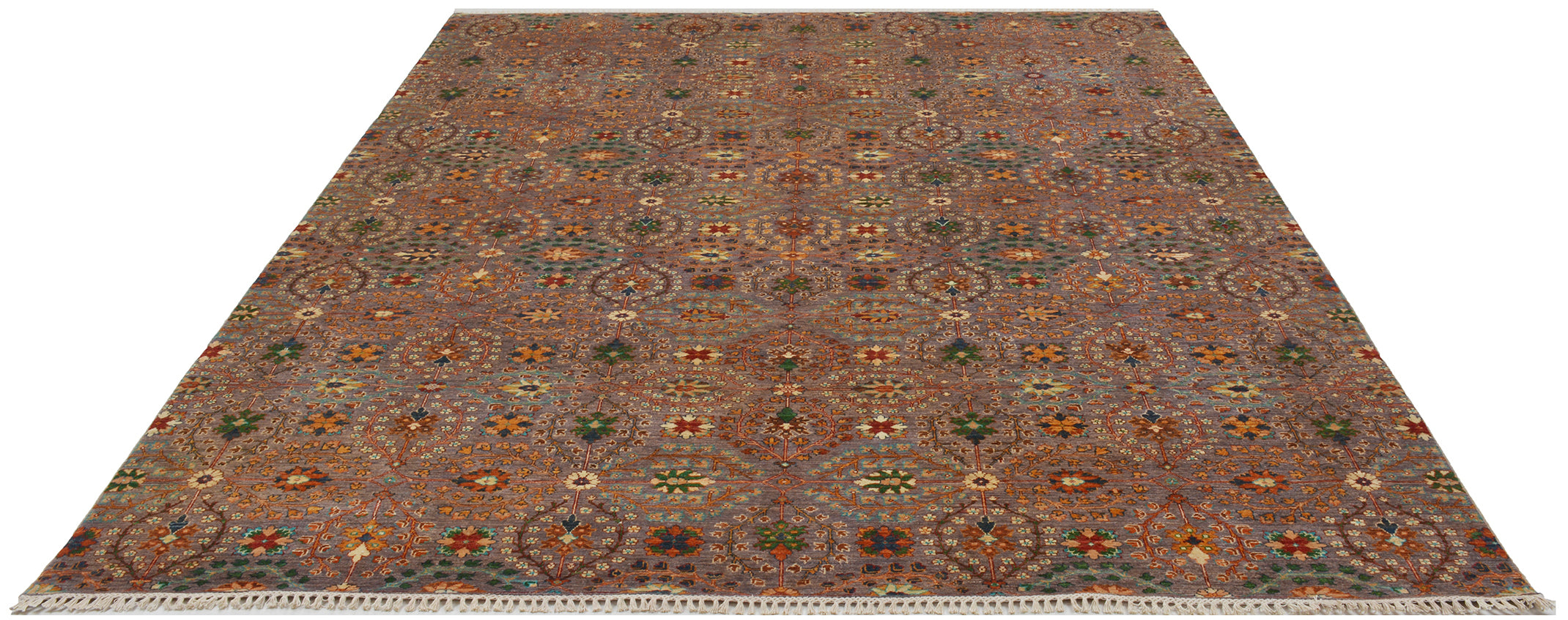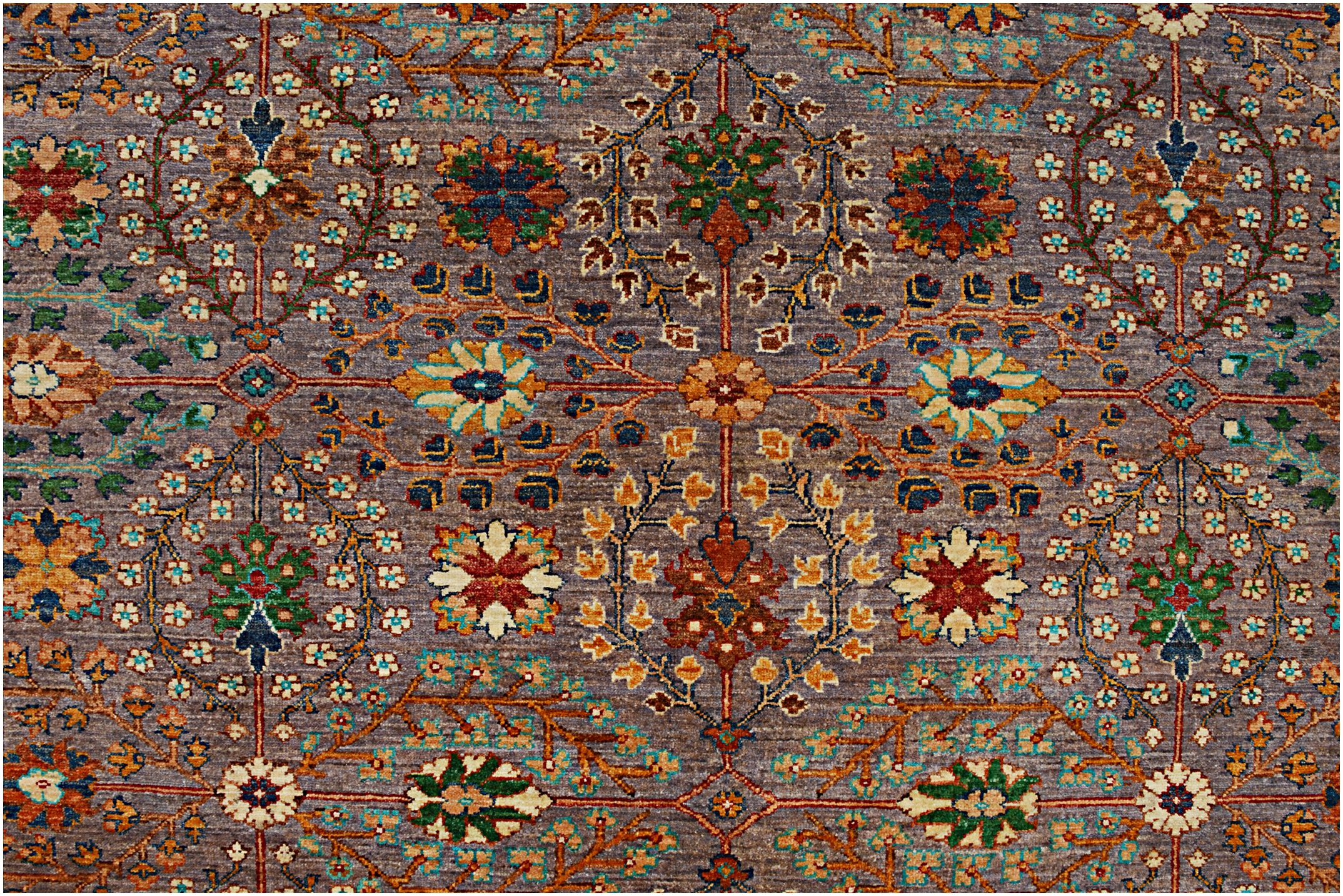 This rug has been woven with a tightly packed knot structure, giving it a fine, durable finish and allowing for greater detail in the design. The wool is hand-spun using traditional methods and selected for its quality, softness, and natural strength. It holds onto its lanolin, which gives the rug a silky sheen and that smooth, velvety feel underfoot.