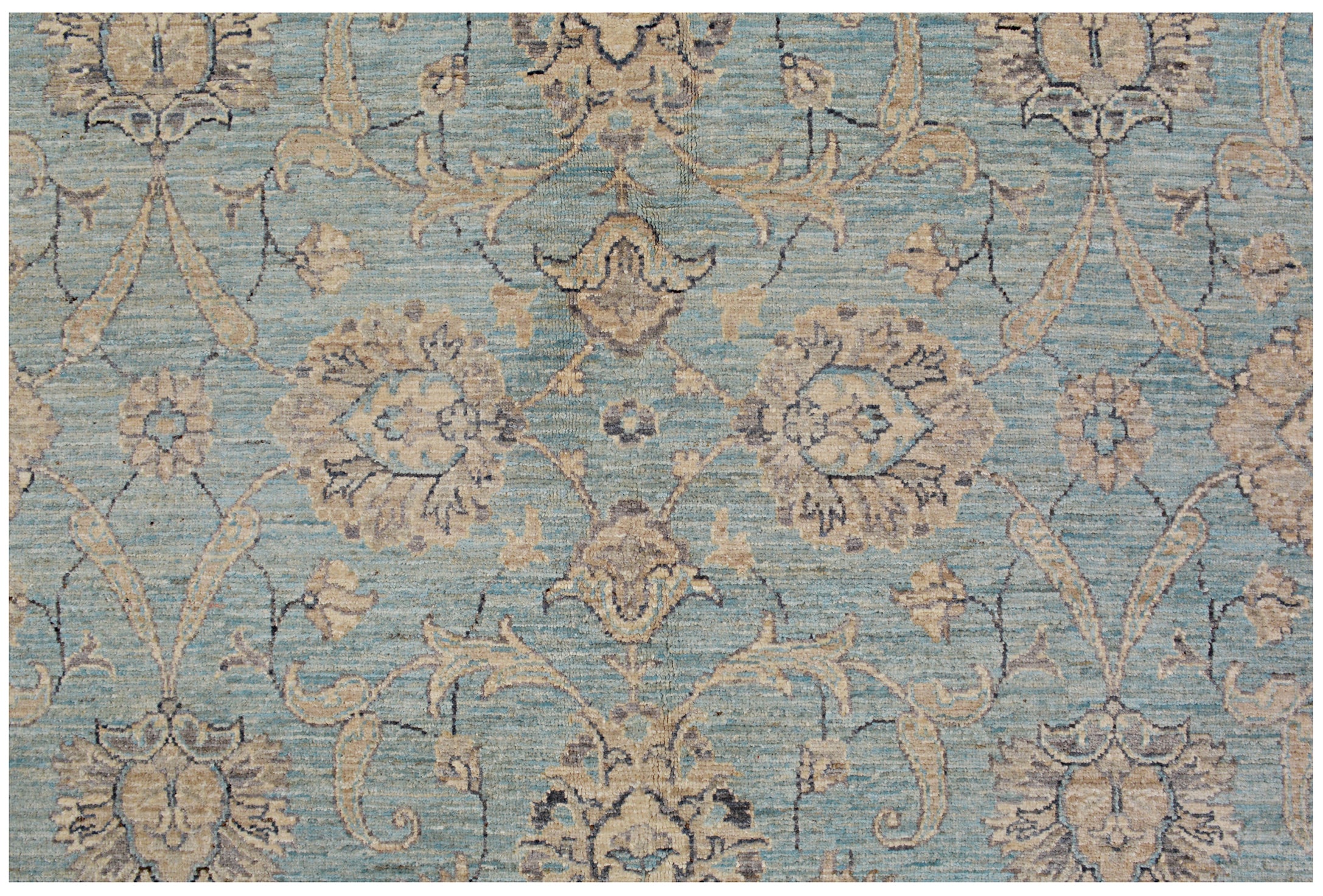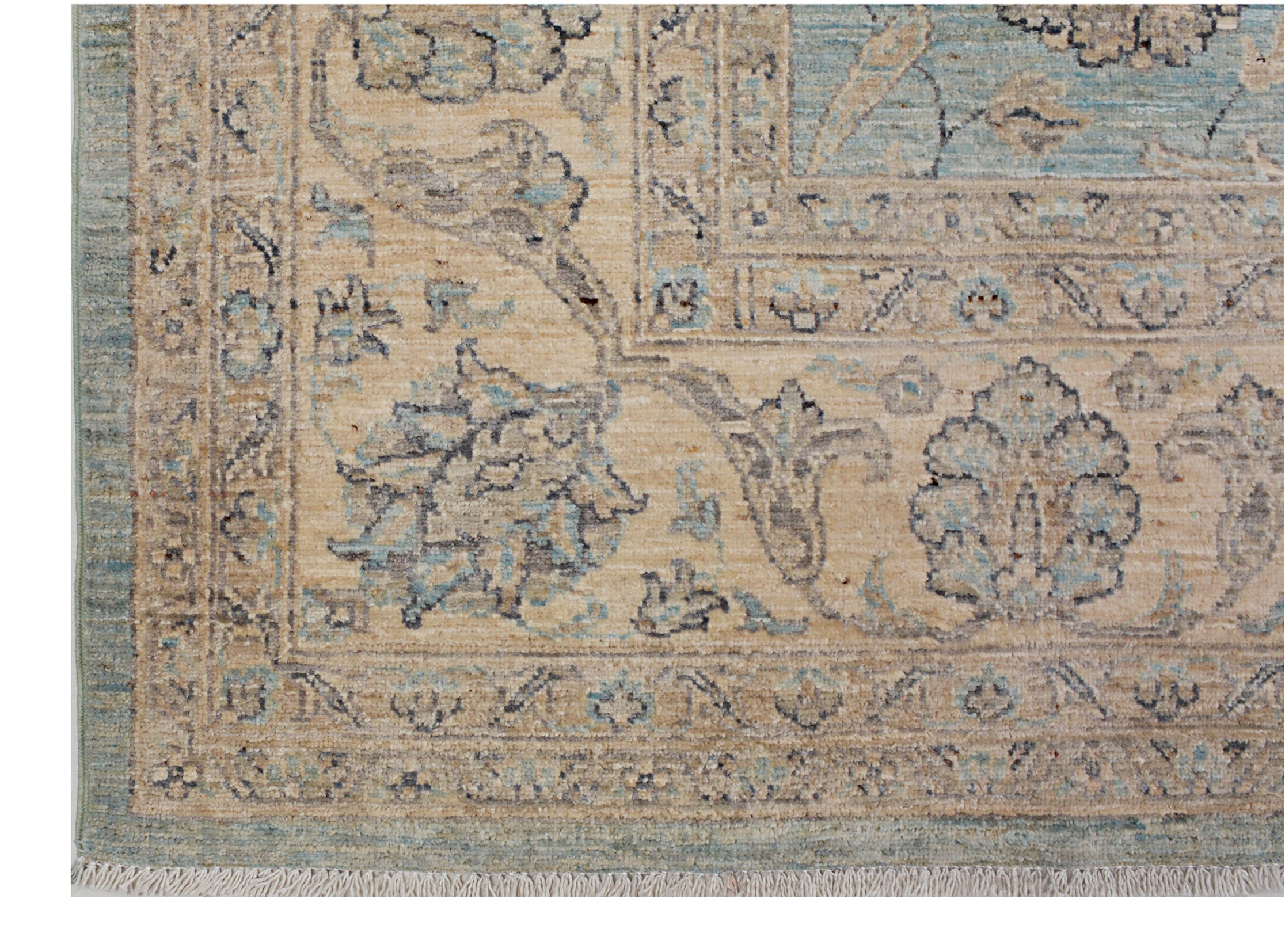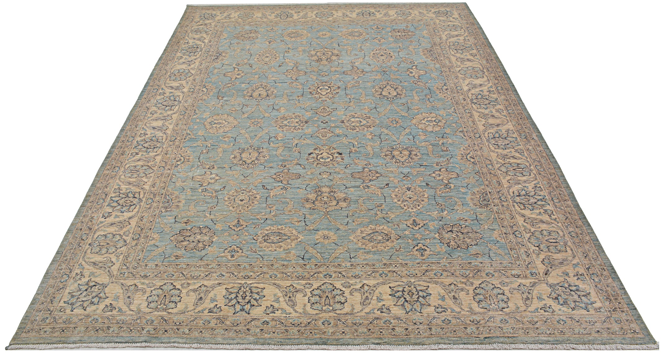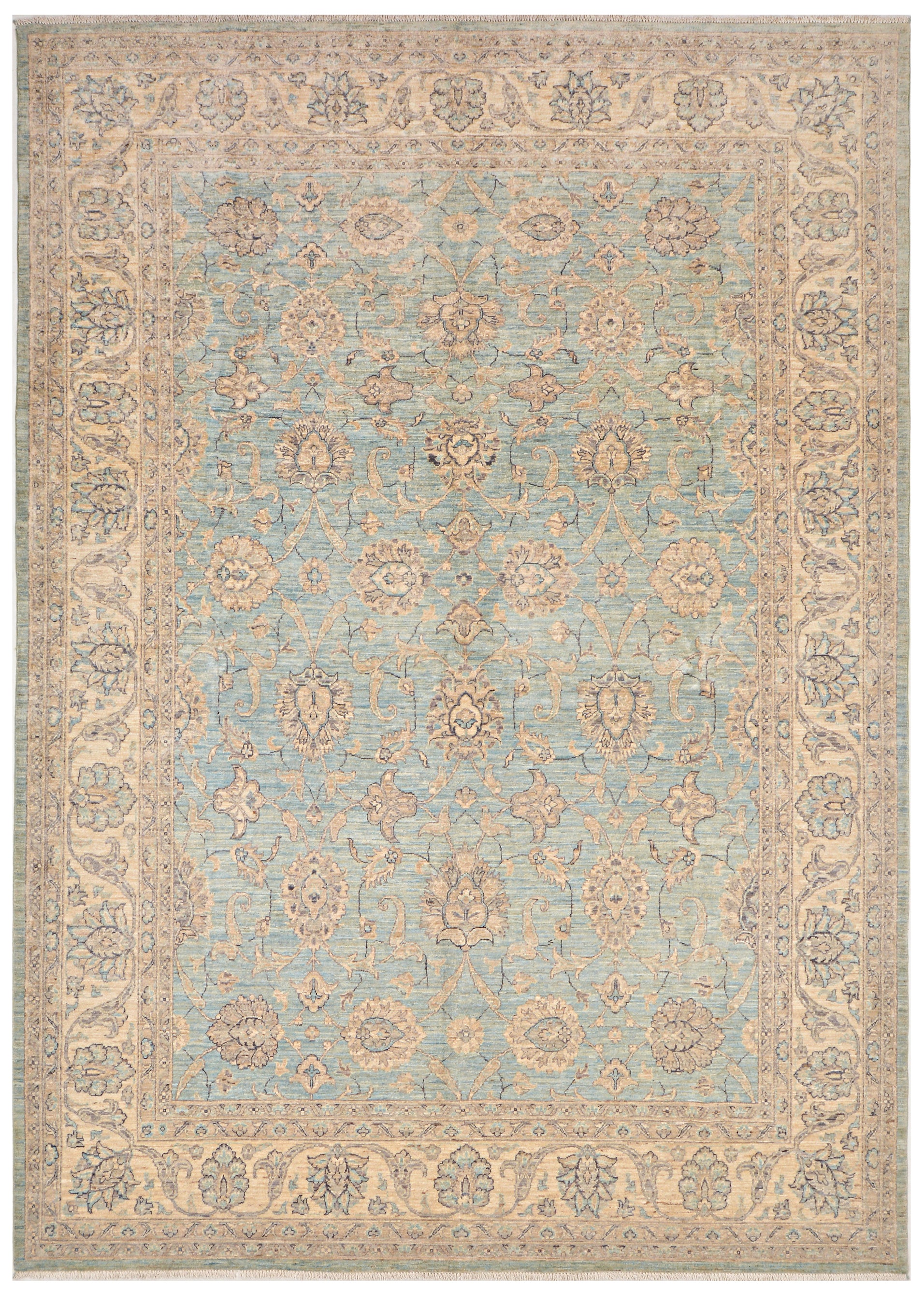 This rug has been woven with a tightly packed knot structure, giving it a fine, durable finish and allowing for greater detail in the design. The wool is hand-spun using traditional methods and selected for its quality, softness, and natural strength. It holds onto its lanolin, which gives the rug a silky sheen and that smooth, velvety feel underfoot.