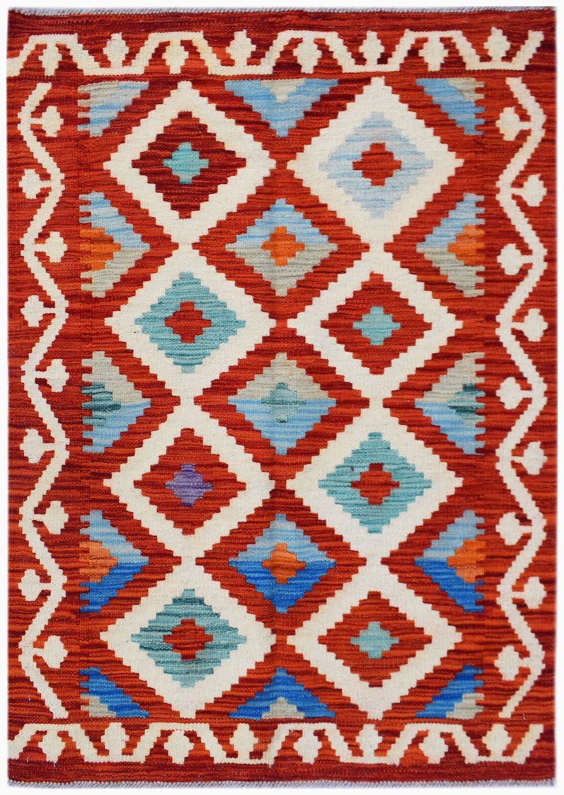 Style: Kilims are woven with a different technique from rugs and are without a pile which allows you to use both sides, this versatility is functional and practical making you get the most out of your handmade item. Kilims are known for it's geometrical patterns, rich colours and flatware texture. This kilim has been handwoven in Maimana, Northern Afghanistan from 100% wool. Handmade to last, this kilim won't disappoint you!