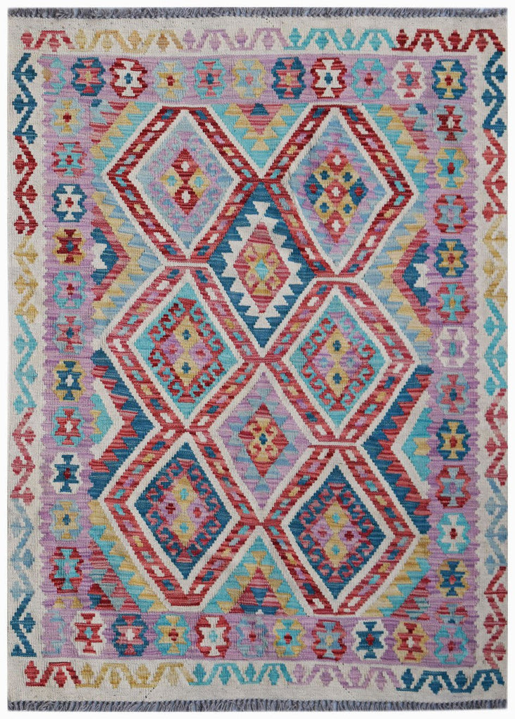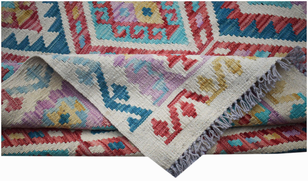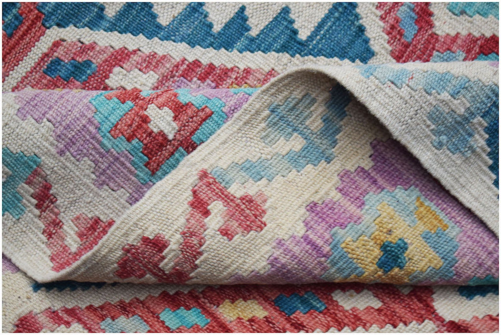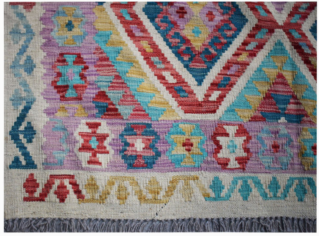 Style: Kilims are woven with a different technique from rugs and are without a pile which allows you to use both sides, this versatility is functional and practical making you get the most out of your handmade item. Kilims are known for it's geometrical patterns, rich colours and flatware texture. This kilim has been handwoven in Maimana, Northern Afghanistan from 100% wool. Handmade to last, this kilim won't disappoint you!