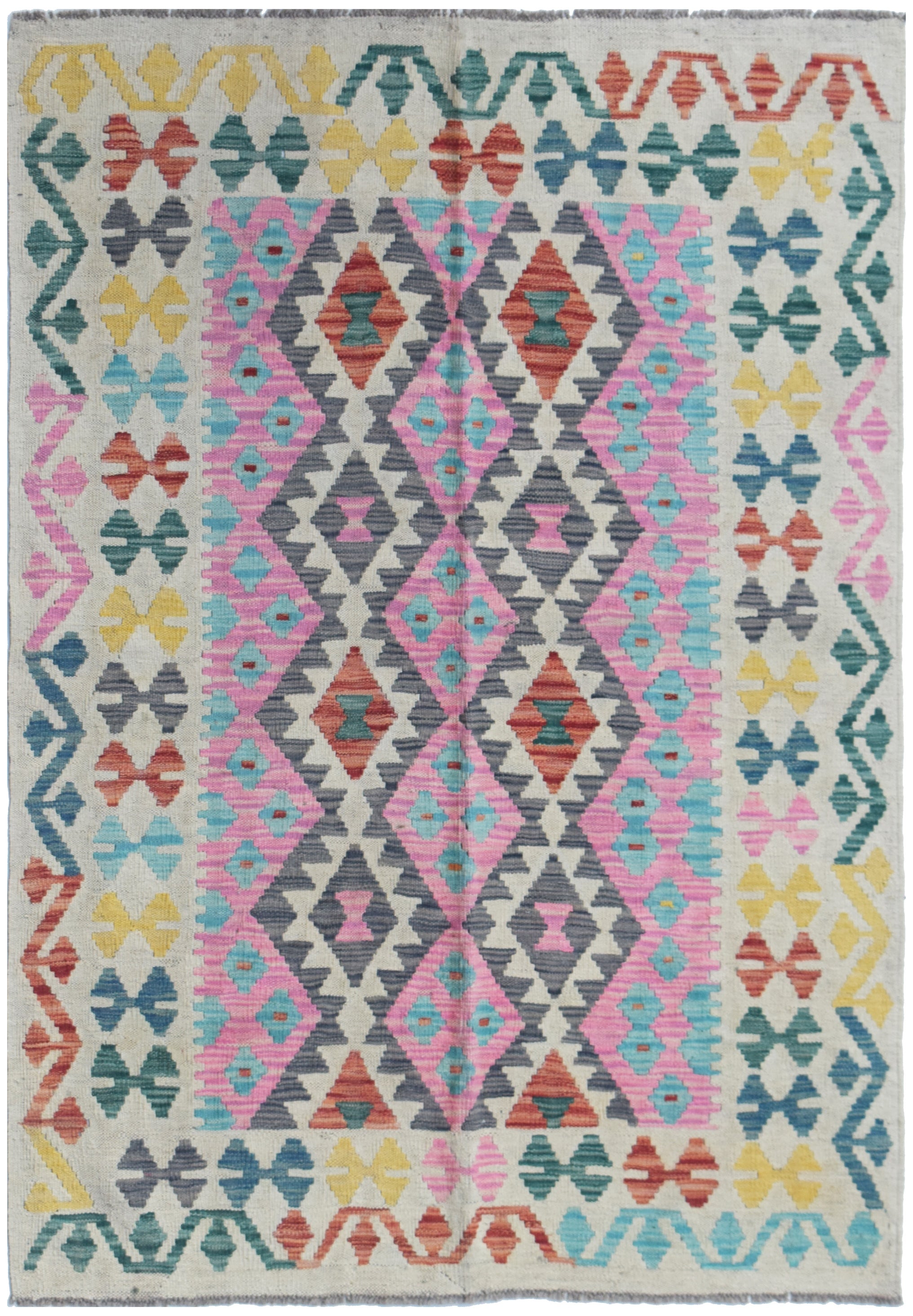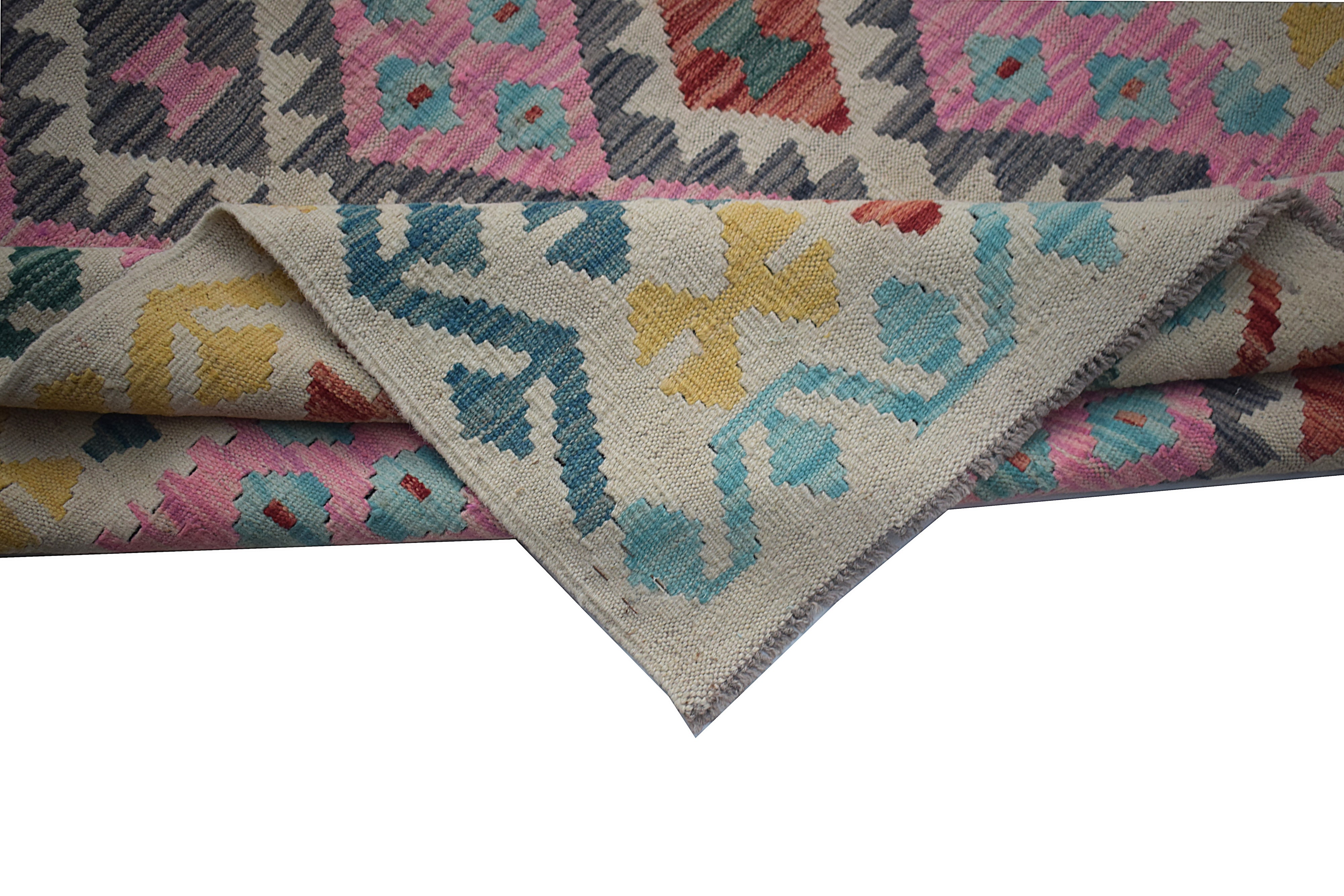 Maimana kilims are a proud product of the Frayab province in northern Afghanistan, with their name derived from the historic city of Maimana, a key trading hub along the ancient Silk Road. These kilims reflect centuries-old weaving traditions passed down through generations of tribal artisans. Their distinctive geometric patterns and bold designs are influenced by the nomadic lifestyle of the region, where practicality meets artistry in textile creation. The Maimana region is known for its semi-arid landscapes, where the weavers source high-quality wool from local sheep, spin it by hand, and dye it using natural substances, often inspired by the earthy hues of their surroundings. These kilims are flatwoven without a pile, a technique that makes them lightweight, reversible, and perfect for diverse applications, from floor coverings to wall hangings.