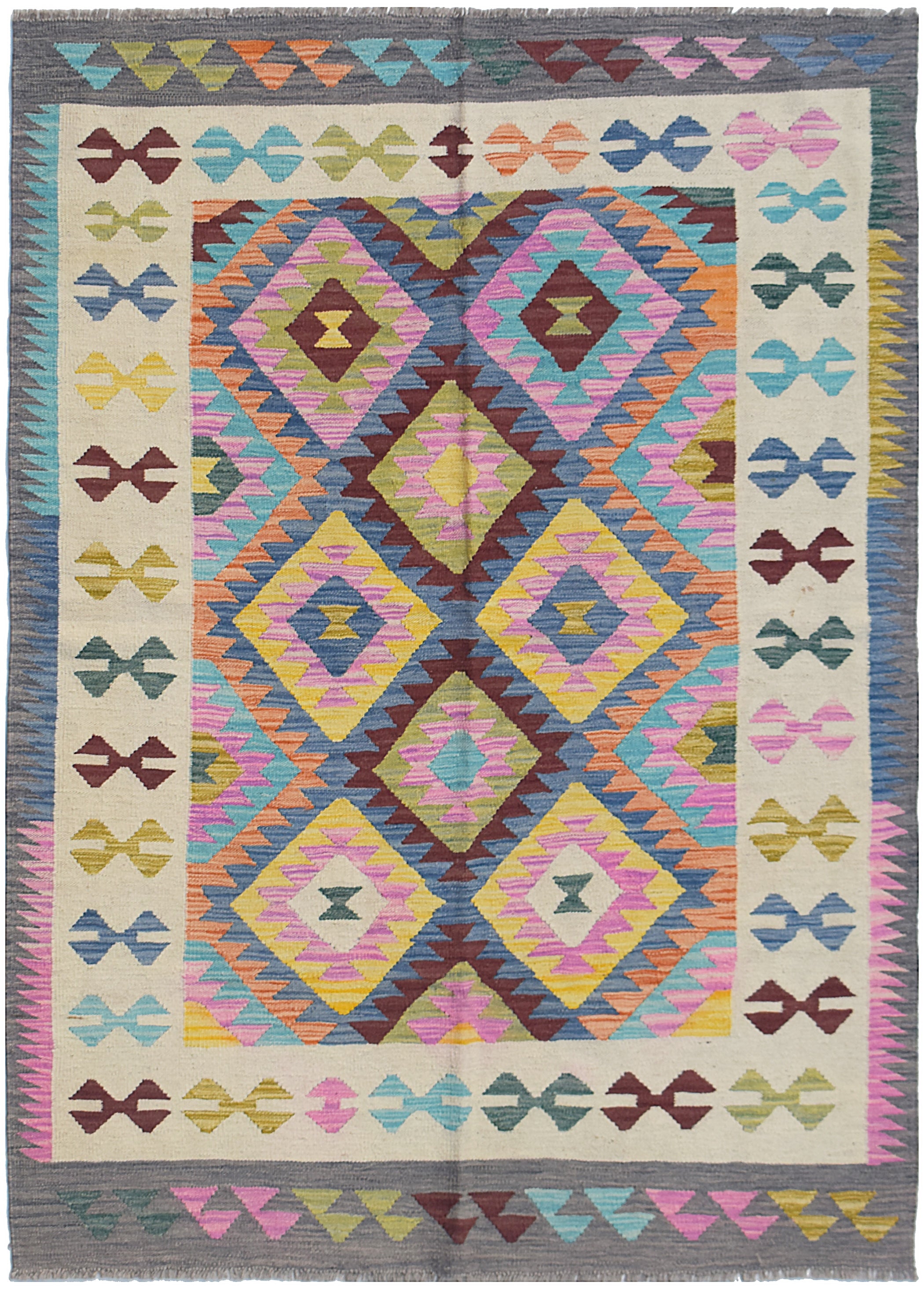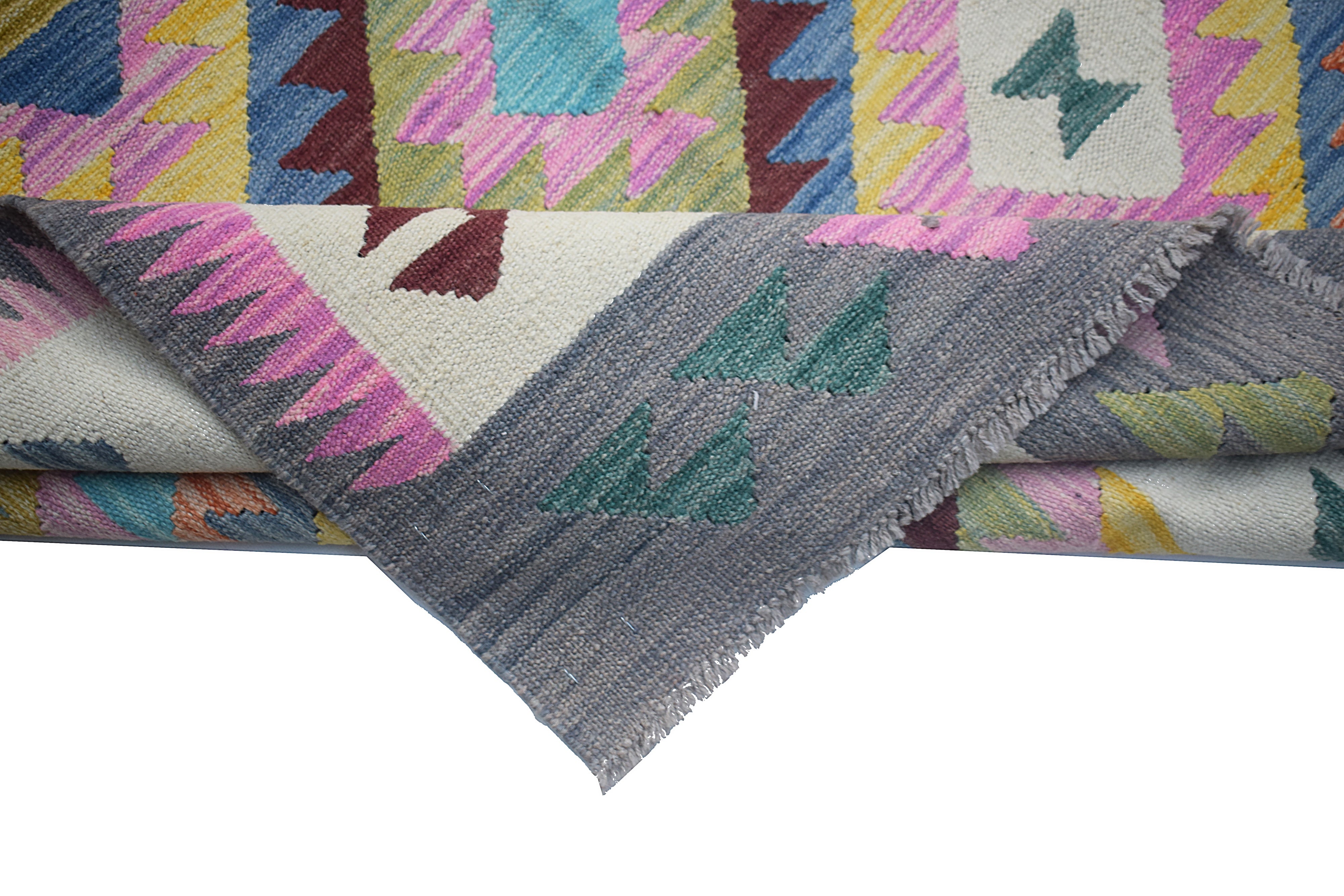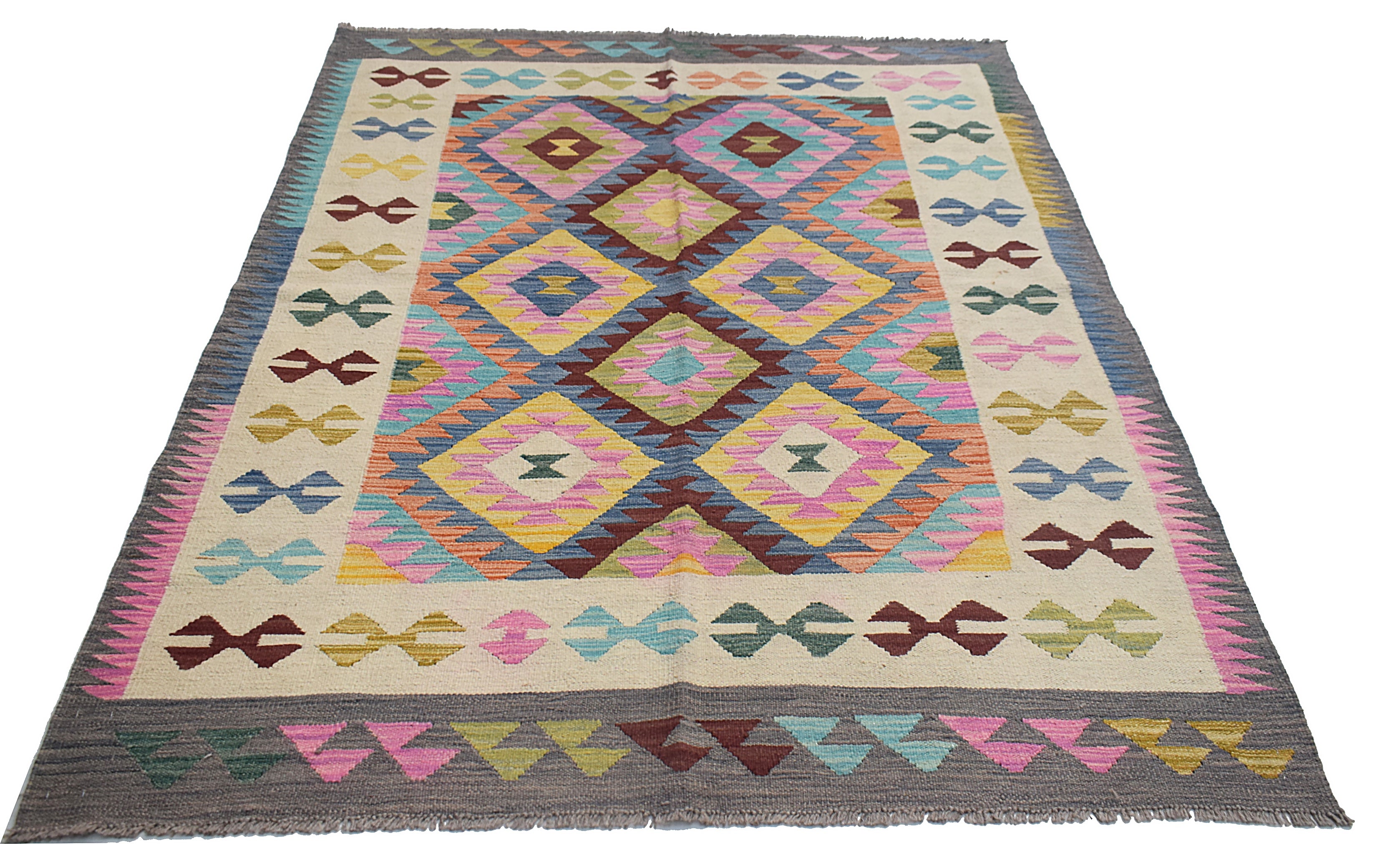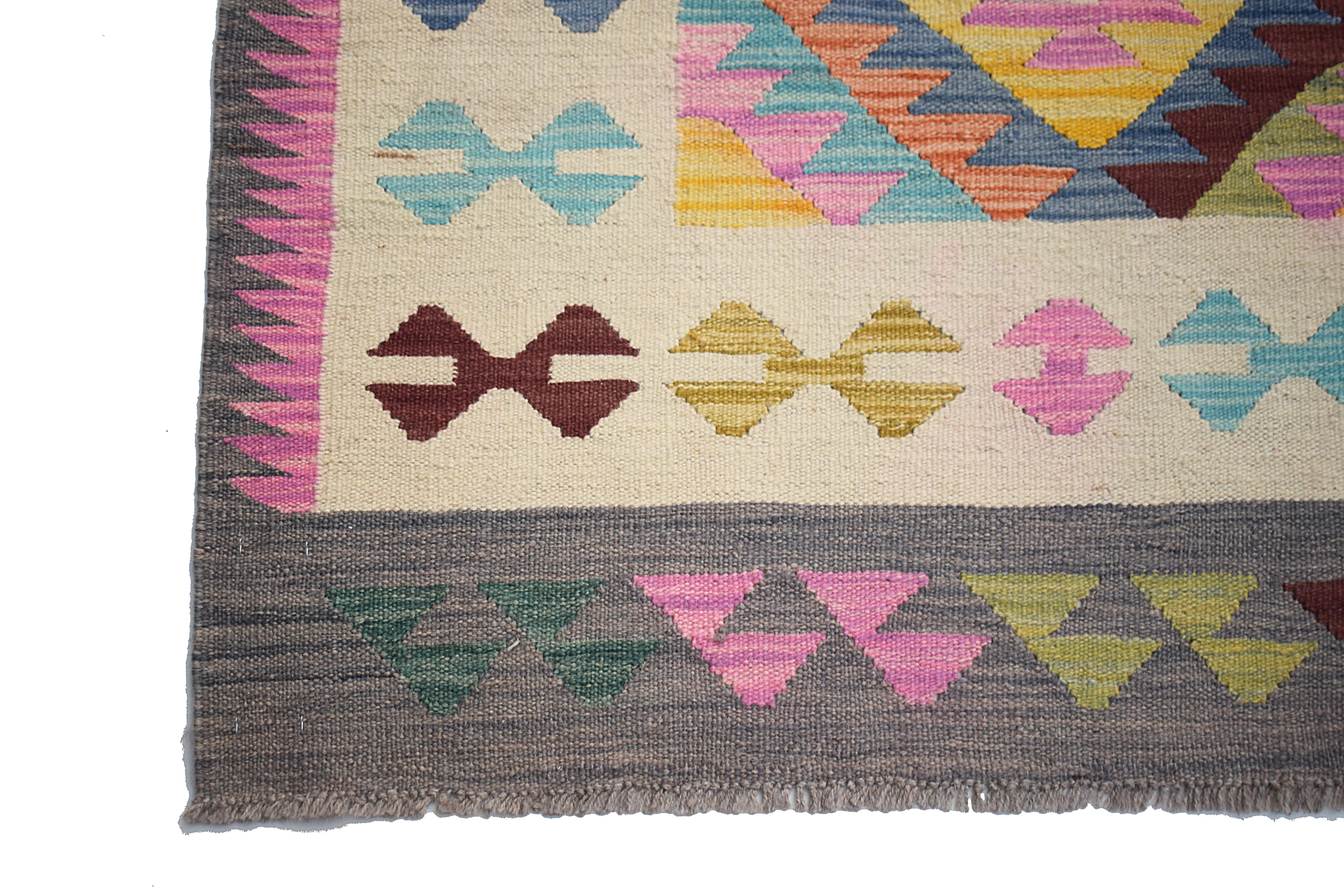 Maimana kilims are a proud product of the Frayab province in northern Afghanistan, with their name derived from the historic city of Maimana, a key trading hub along the ancient Silk Road. These kilims reflect centuries-old weaving traditions passed down through generations of tribal artisans. Their distinctive geometric patterns and bold designs are influenced by the nomadic lifestyle of the region, where practicality meets artistry in textile creation. The Maimana region is known for its semi-arid landscapes, where the weavers source high-quality wool from local sheep, spin it by hand, and dye it using natural substances, often inspired by the earthy hues of their surroundings. These kilims are flatwoven without a pile, a technique that makes them lightweight, reversible, and perfect for diverse applications, from floor coverings to wall hangings.