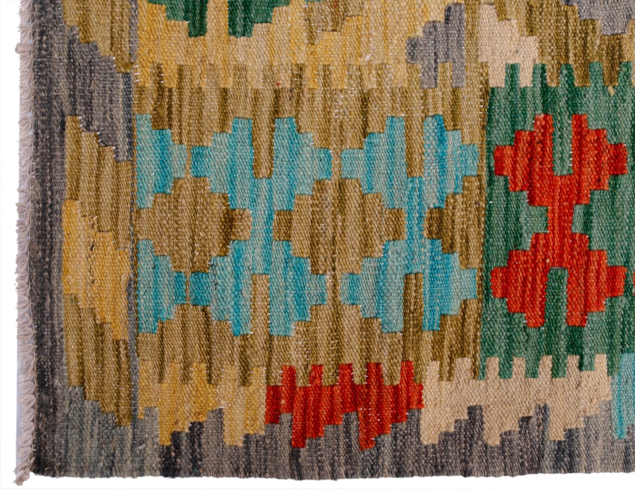 Style: Kilims are woven with a different technique from rugs and are without a pile which allows you to use both sides, this versatility is functional and practical making you get the most out of your handmade item. Kilims are known for it's geometrical patterns, rich colours and flatware texture. This kilim has been handwoven in Maimana, Northern Afghanistan from 100% wool. Handmade to last, this kilim won't disappoint you!