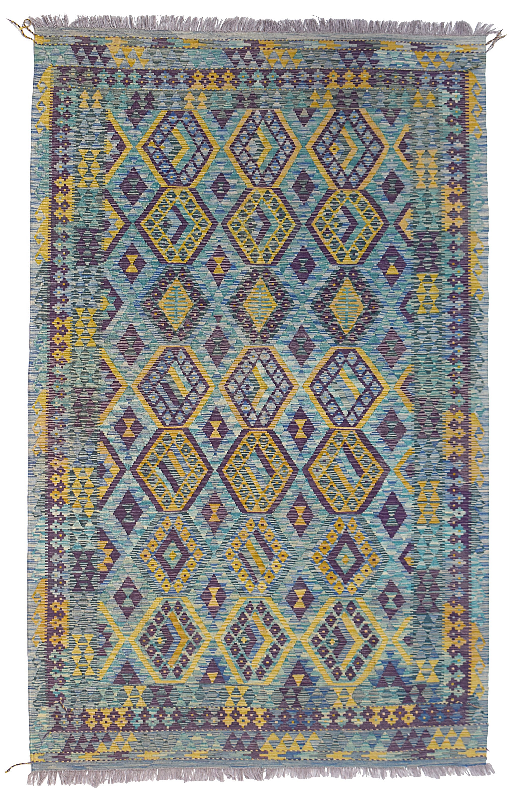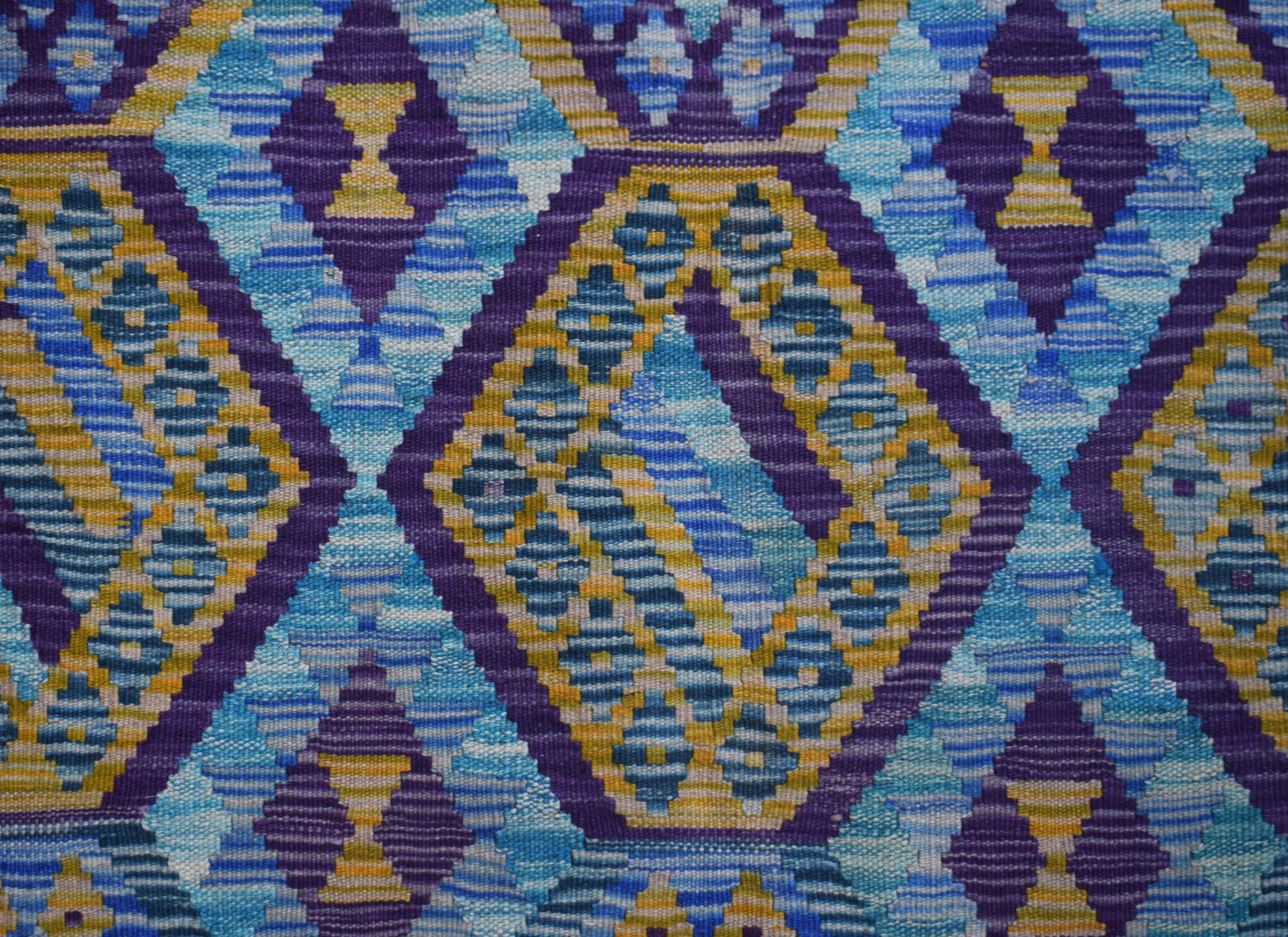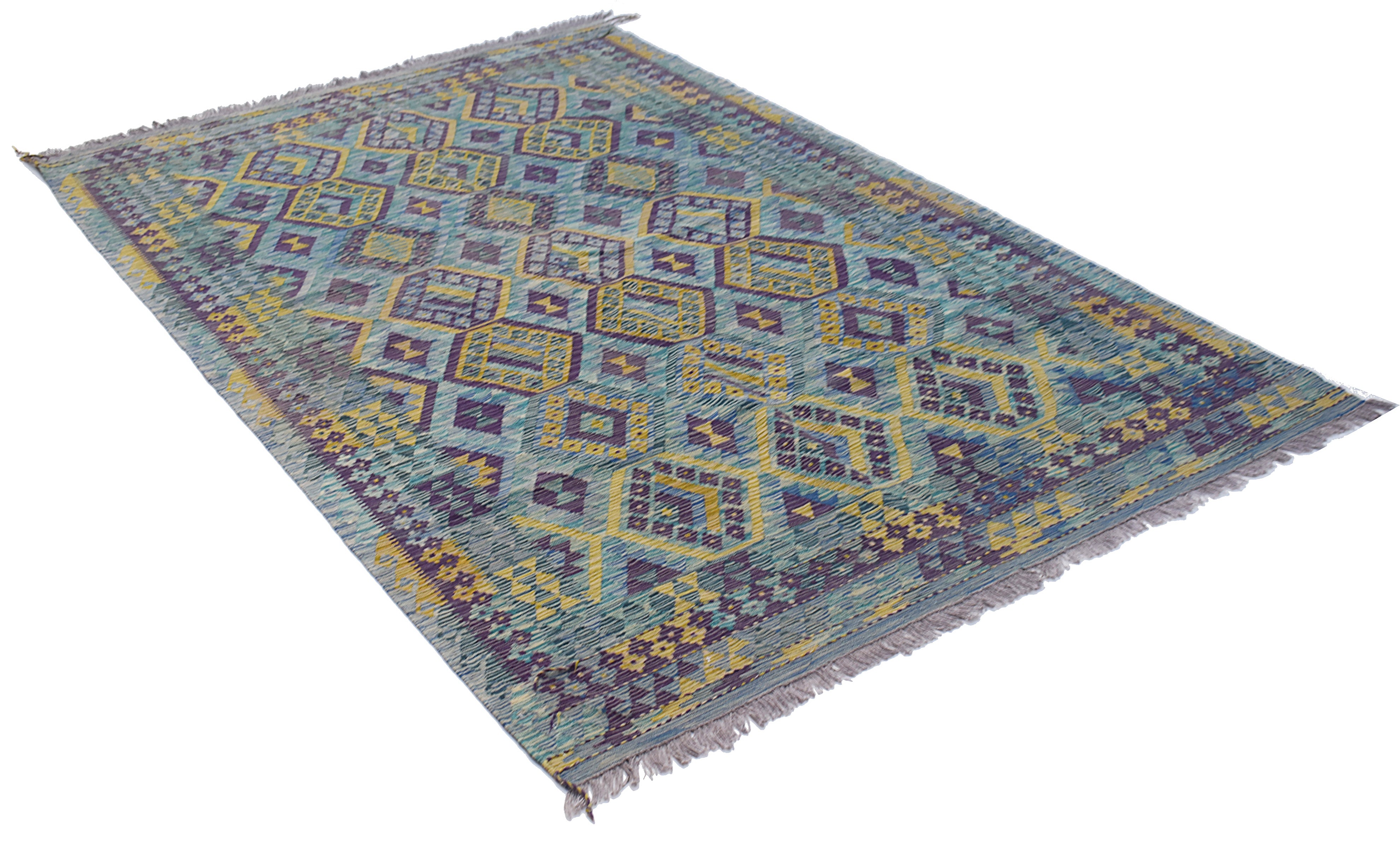 Maimana kilims are a proud product of the Frayab province in northern Afghanistan, with their name derived from the historic city of Maimana, a key trading hub along the ancient Silk Road. These kilims reflect centuries-old weaving traditions passed down through generations of tribal artisans. Their distinctive geometric patterns and bold designs are influenced by the nomadic lifestyle of the region, where practicality meets artistry in textile creation. The Maimana region is known for its semi-arid landscapes, where the weavers source high-quality wool from local sheep, spin it by hand, and dye it using natural substances, often inspired by the earthy hues of their surroundings. These kilims are flatwoven without a pile, a technique that makes them lightweight, reversible, and perfect for diverse applications, from floor coverings to wall hangings.