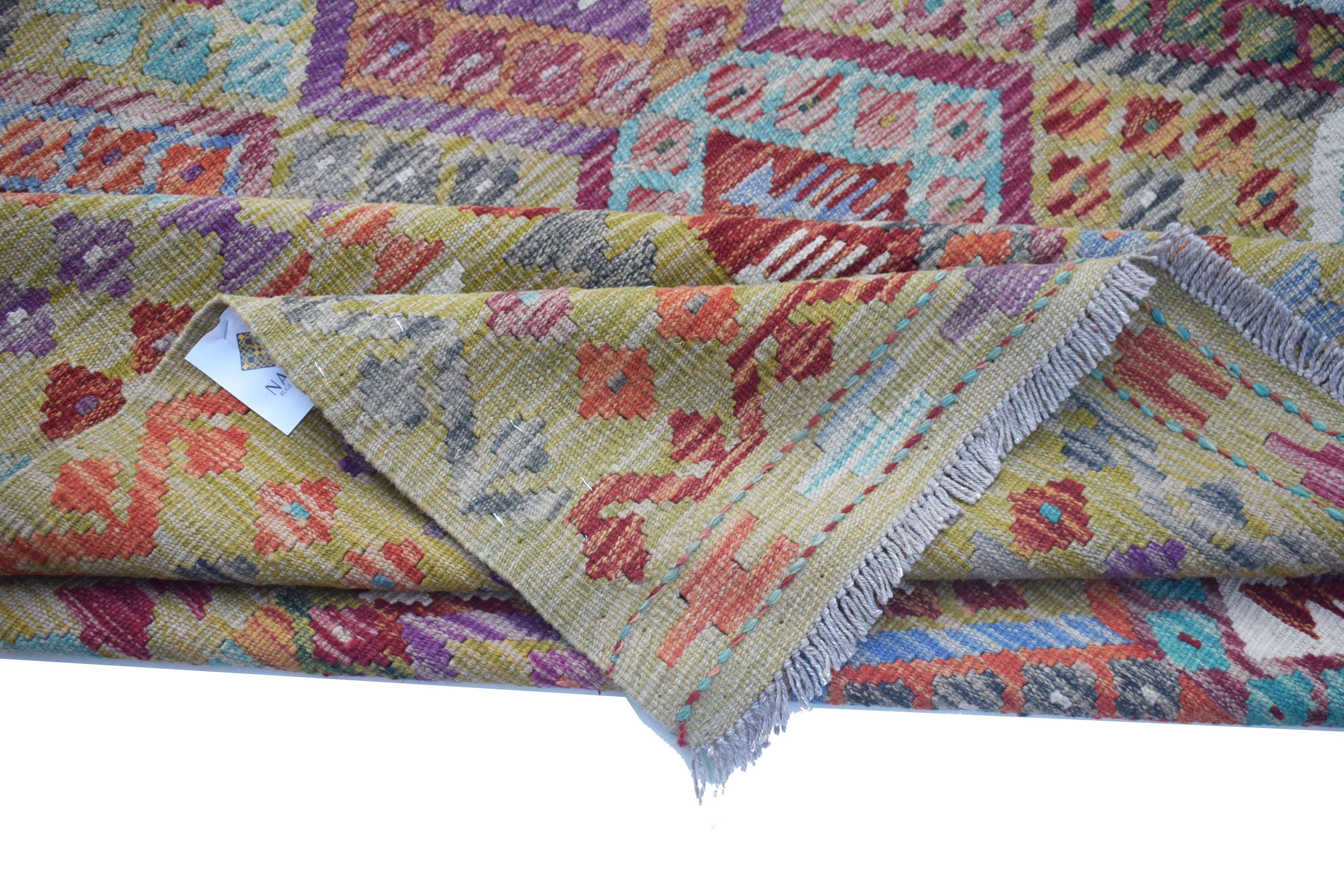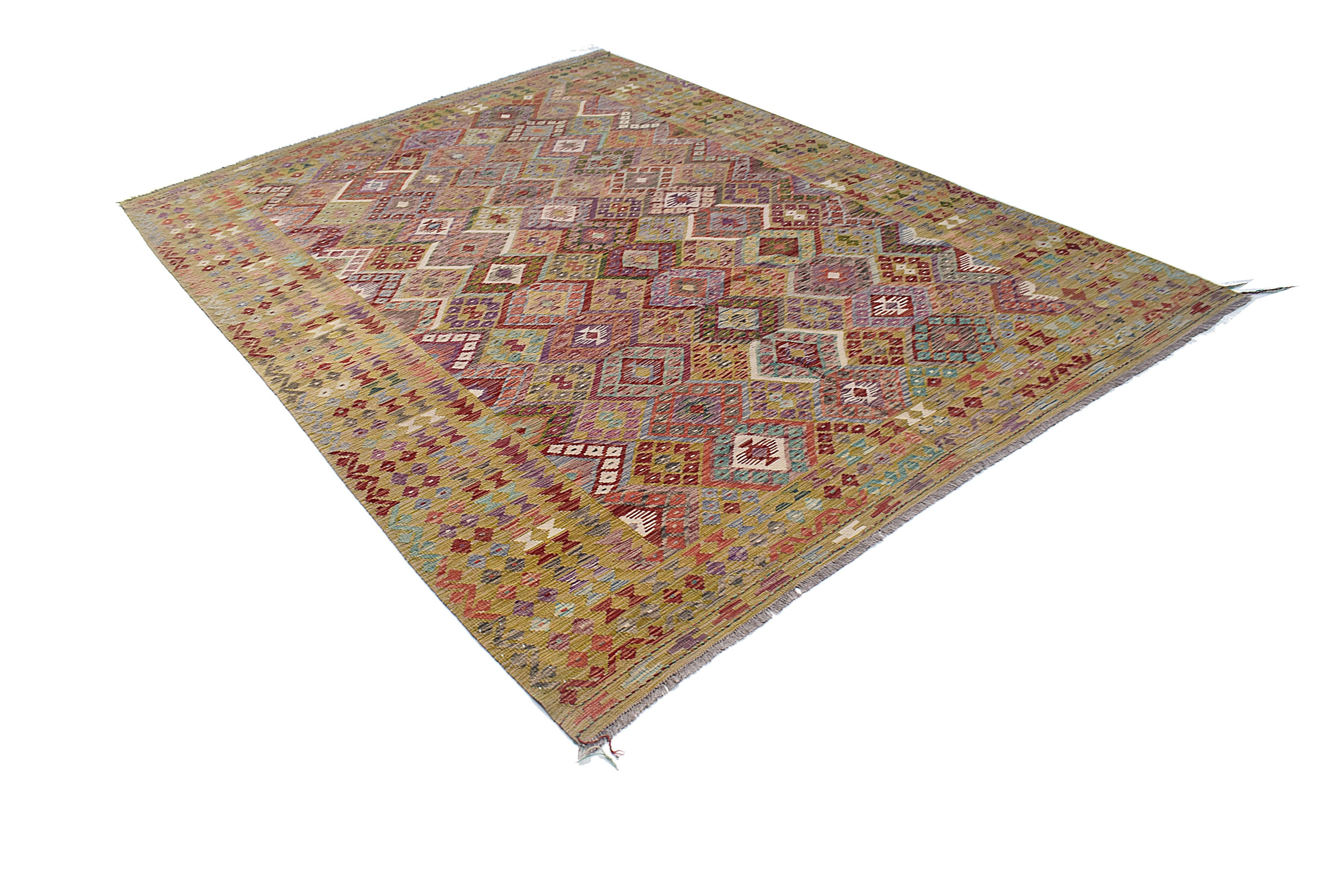 Maimana kilims are a proud product of the Frayab province in northern Afghanistan, with their name derived from the historic city of Maimana, a key trading hub along the ancient Silk Road. These kilims reflect centuries-old weaving traditions passed down through generations of tribal artisans. Their distinctive geometric patterns and bold designs are influenced by the nomadic lifestyle of the region, where practicality meets artistry in textile creation. The Maimana region is known for its semi-arid landscapes, where the weavers source high-quality wool from local sheep, spin it by hand, and dye it using natural substances, often inspired by the earthy hues of their surroundings. These kilims are flatwoven without a pile, a technique that makes them lightweight, reversible, and perfect for diverse applications, from floor coverings to wall hangings.