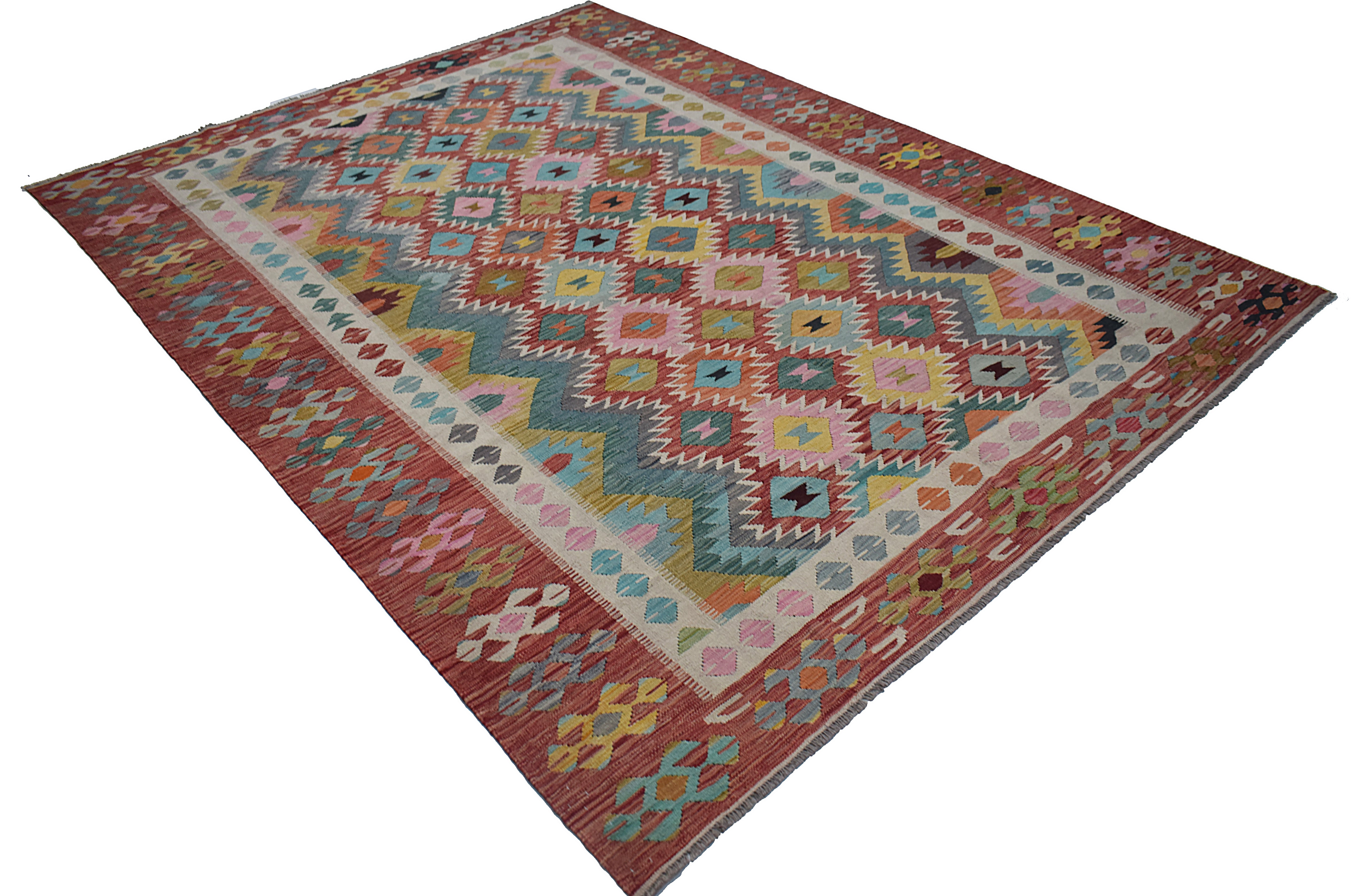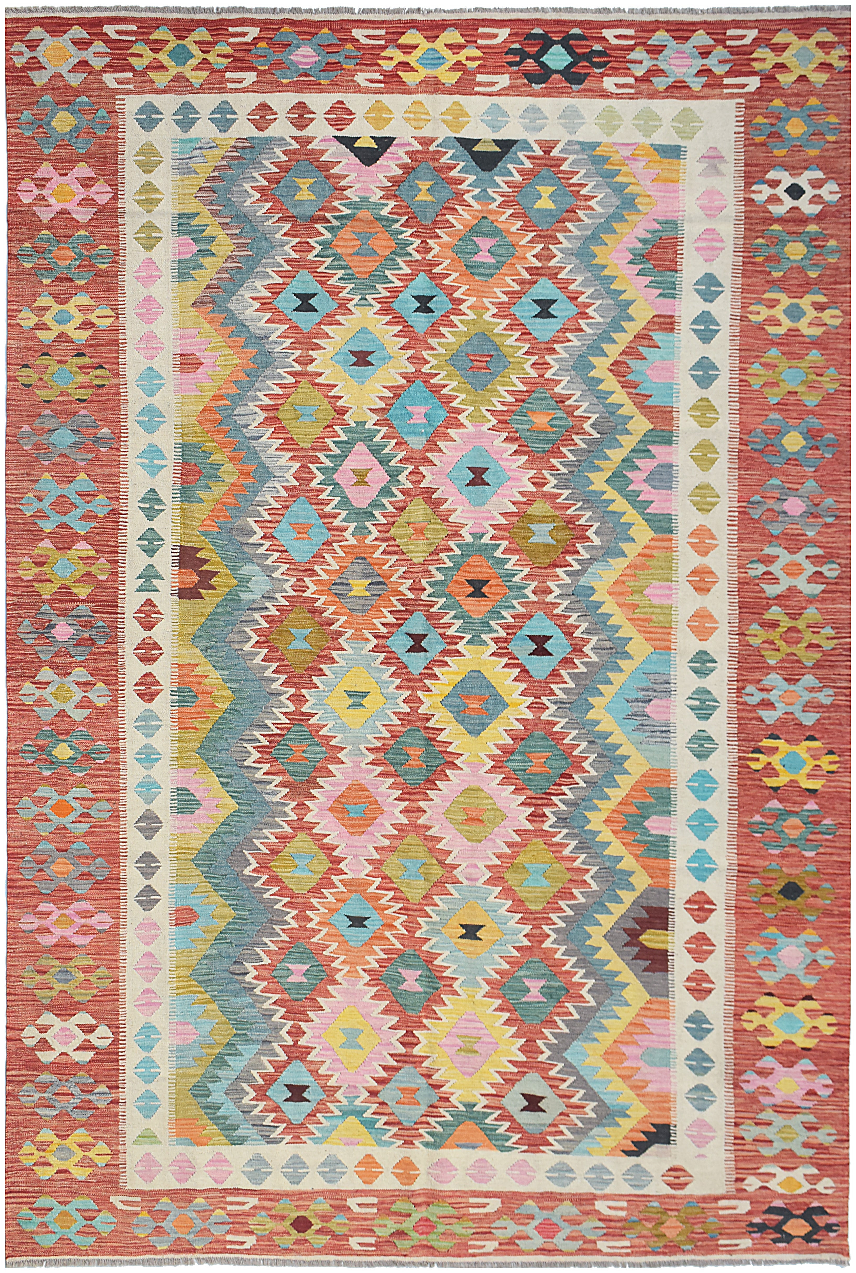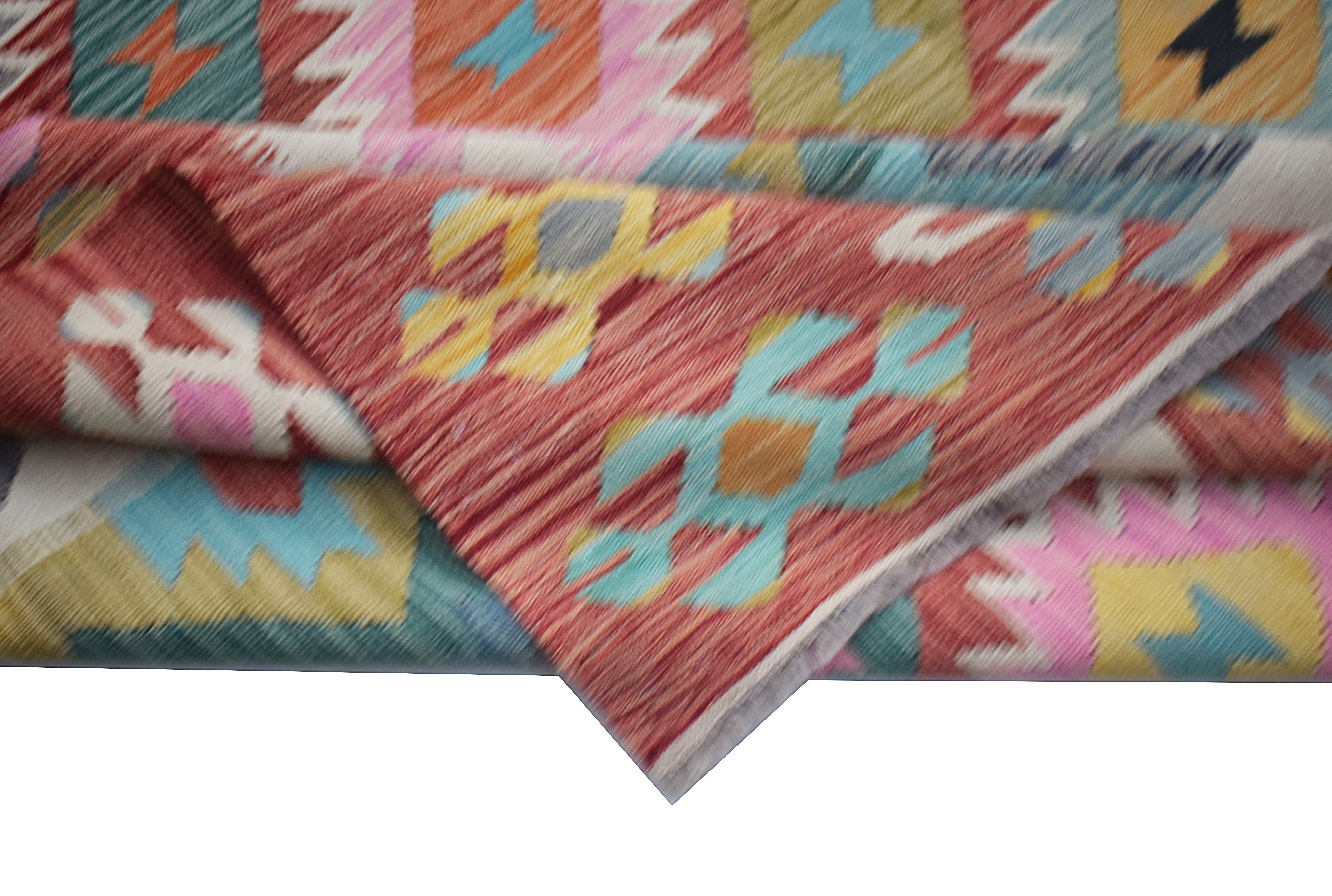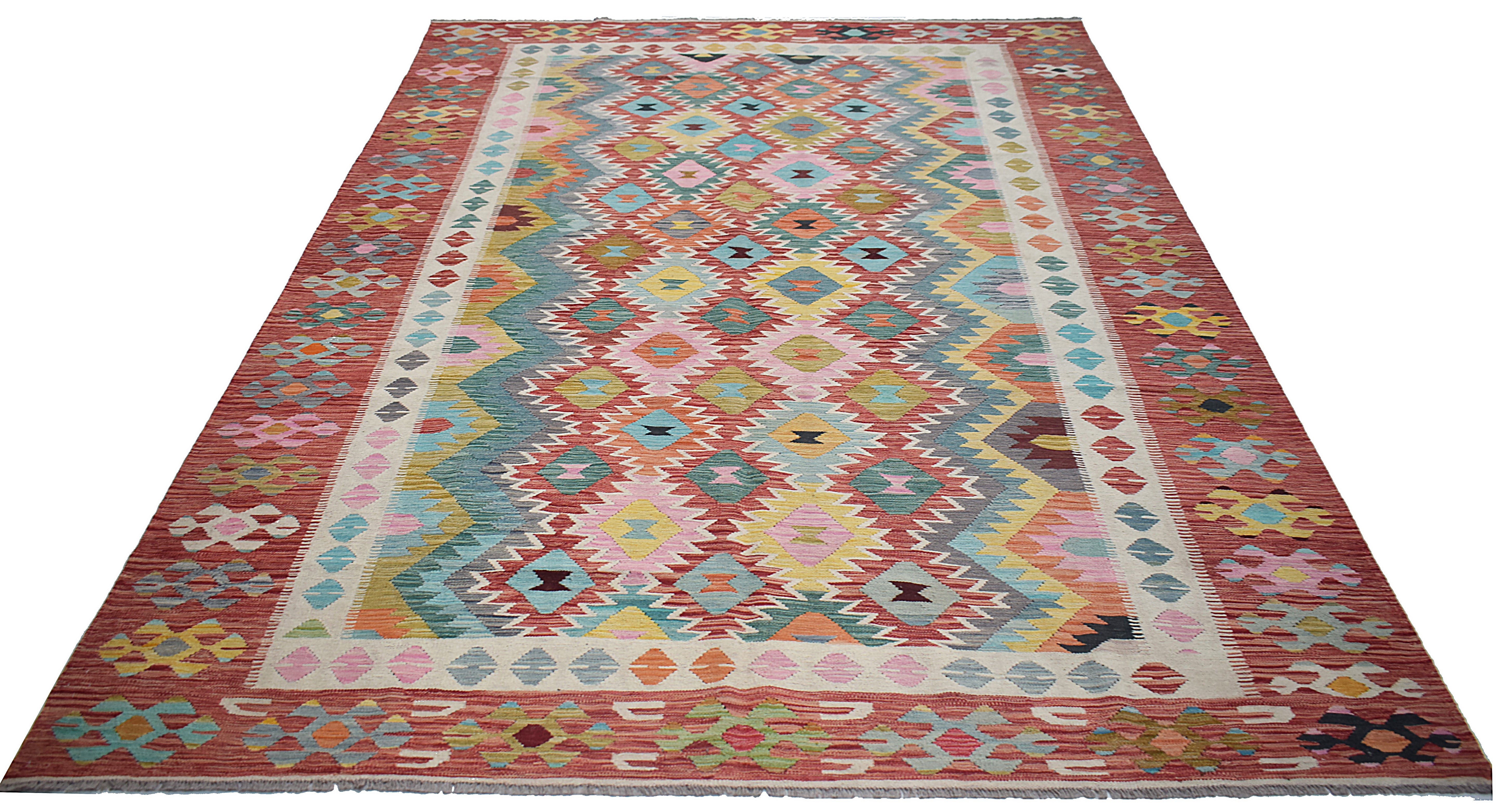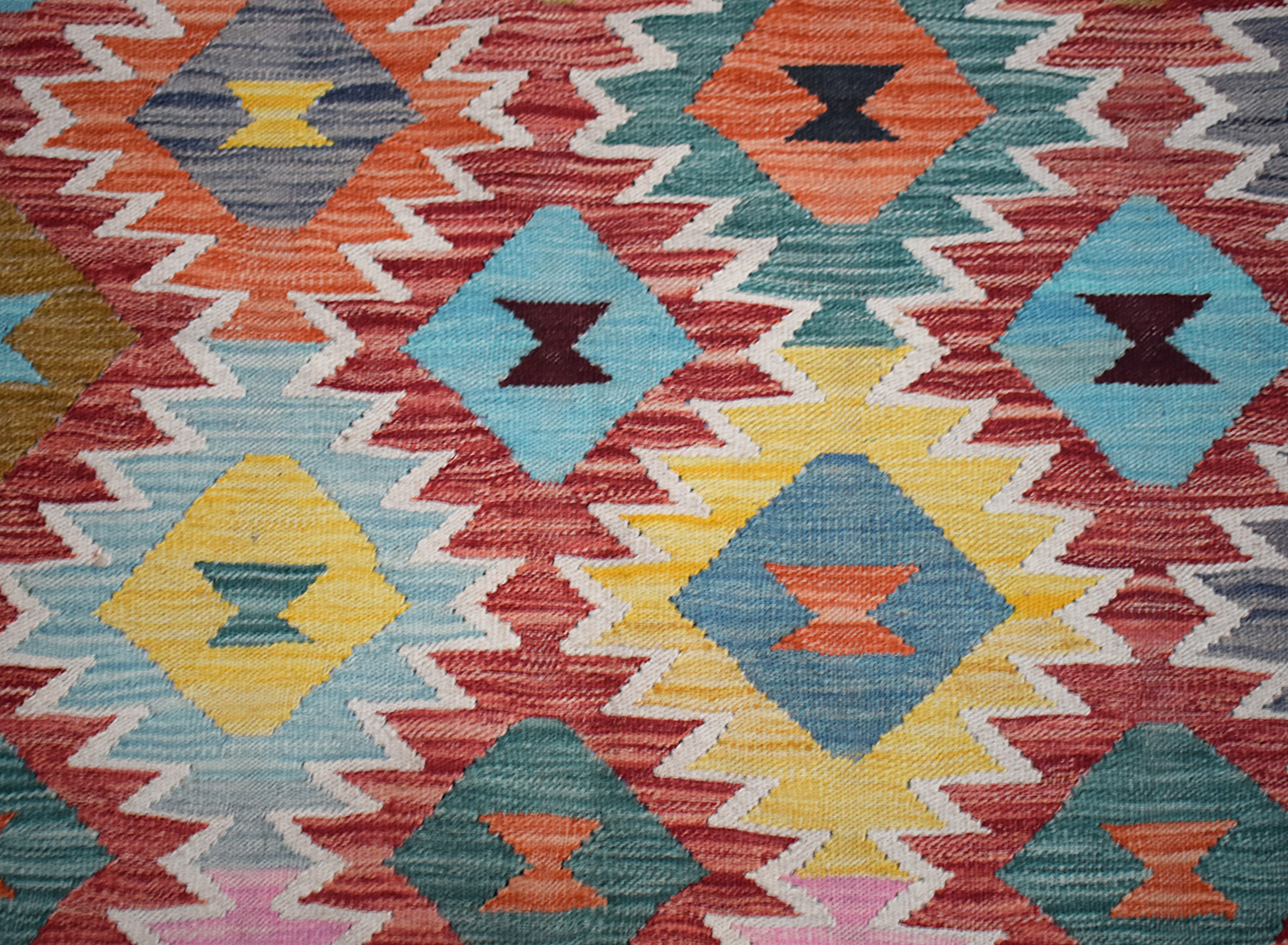 Maimana kilims are a proud product of the Frayab province in northern Afghanistan, with their name derived from the historic city of Maimana, a key trading hub along the ancient Silk Road. These kilims reflect centuries-old weaving traditions passed down through generations of tribal artisans. Their distinctive geometric patterns and bold designs are influenced by the nomadic lifestyle of the region, where practicality meets artistry in textile creation. The Maimana region is known for its semi-arid landscapes, where the weavers source high-quality wool from local sheep, spin it by hand, and dye it using natural substances, often inspired by the earthy hues of their surroundings. These kilims are flatwoven without a pile, a technique that makes them lightweight, reversible, and perfect for diverse applications, from floor coverings to wall hangings.