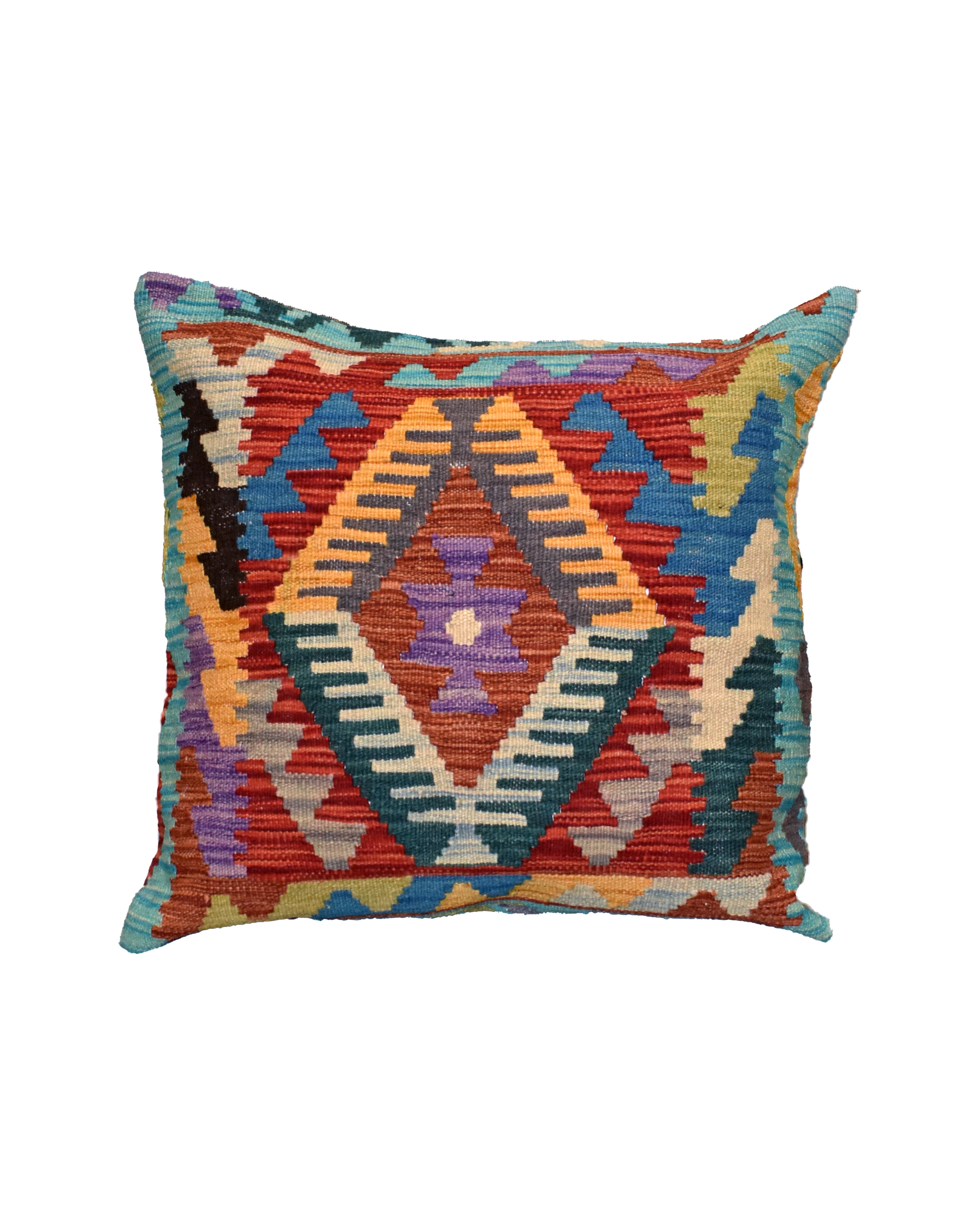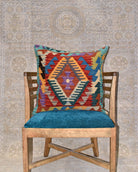 Afghan Maimana kilim cushions feature traditional flat-weave construction with bold geometric patterns in bright and earthy tones.