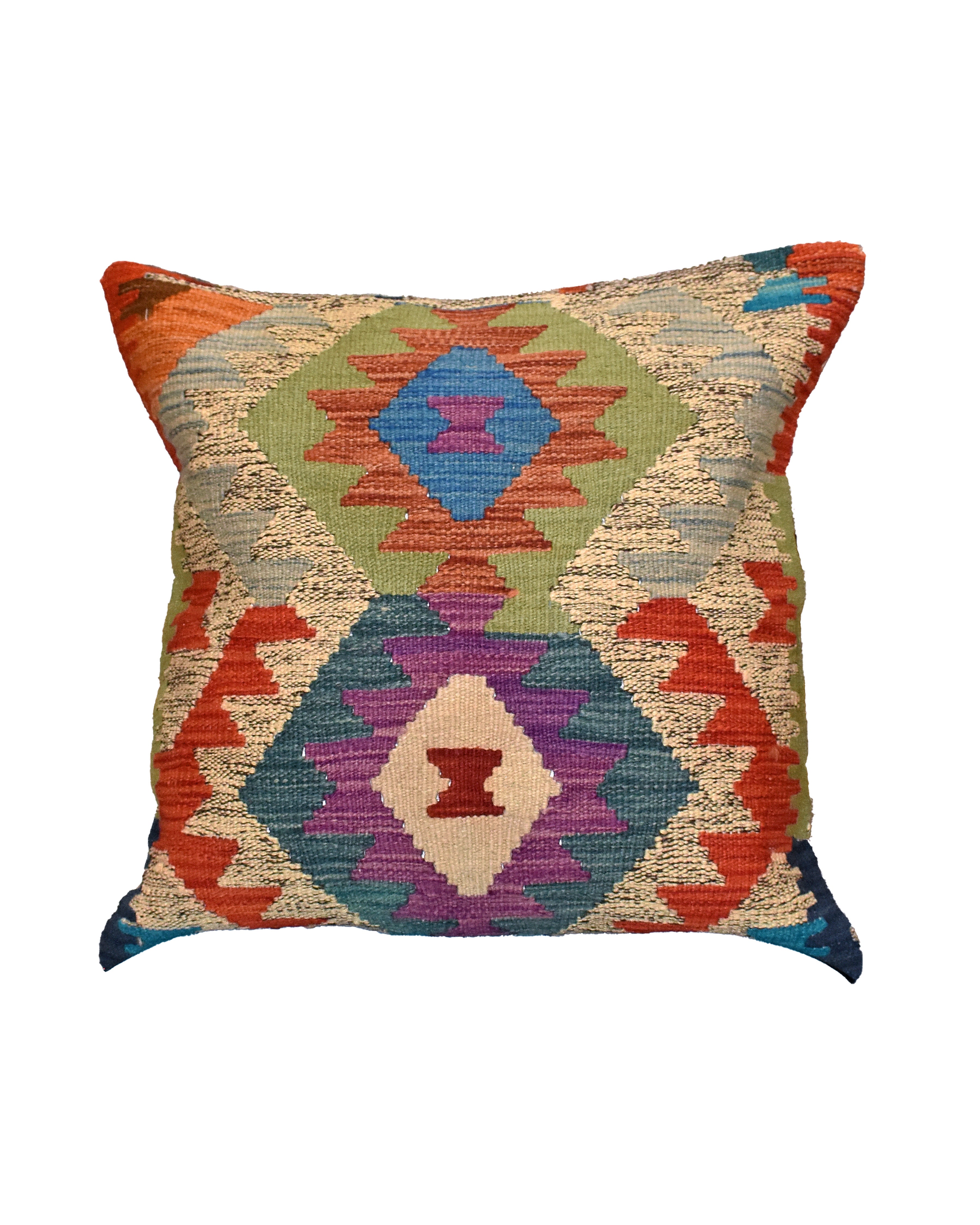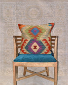 Afghan Maimana kilim cushions feature traditional flat-weave construction with bold geometric patterns in bright and earthy tones.