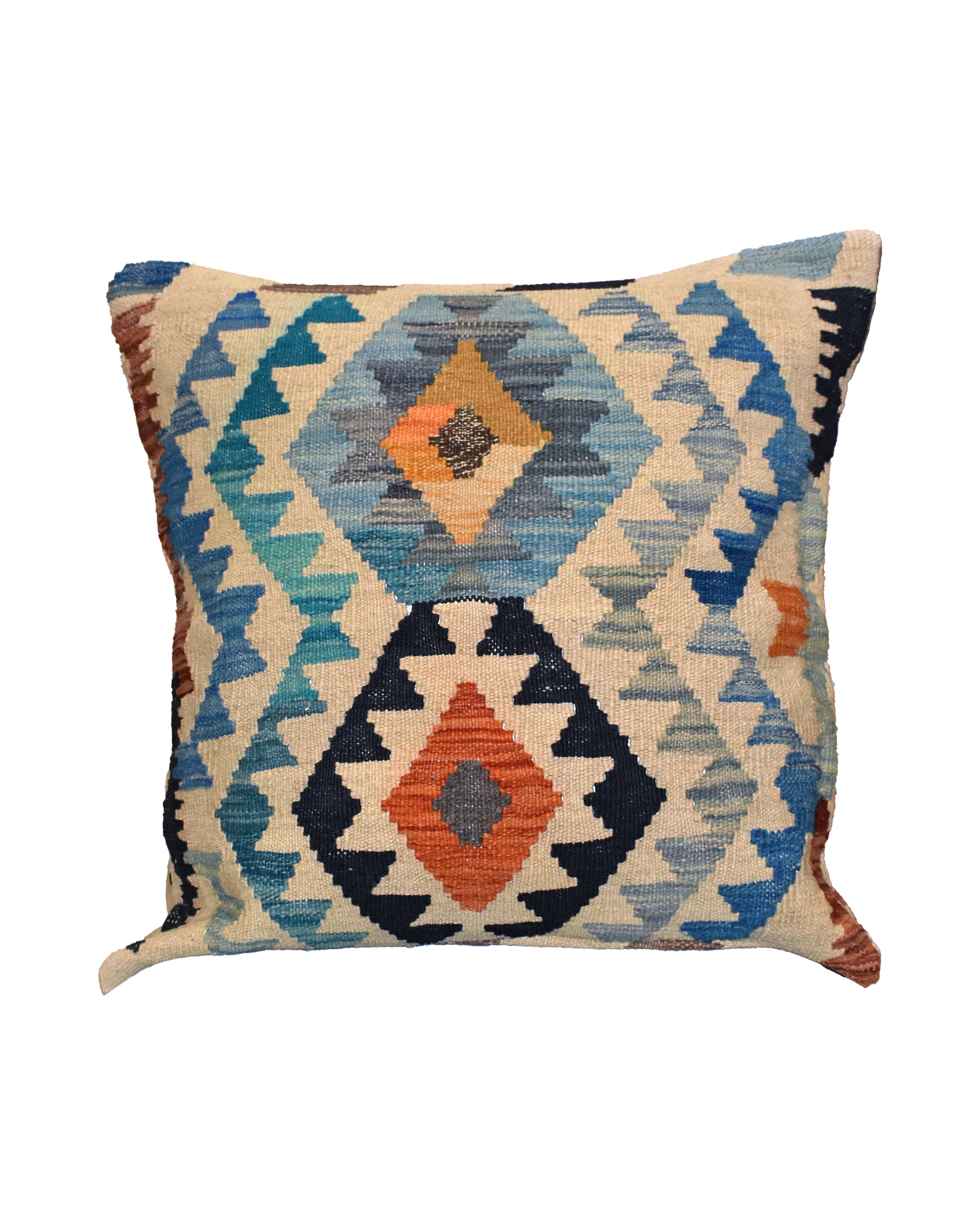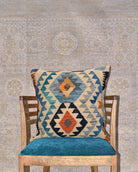 Afghan Maimana kilim cushions feature traditional flat-weave construction with bold geometric patterns in bright and earthy tones.