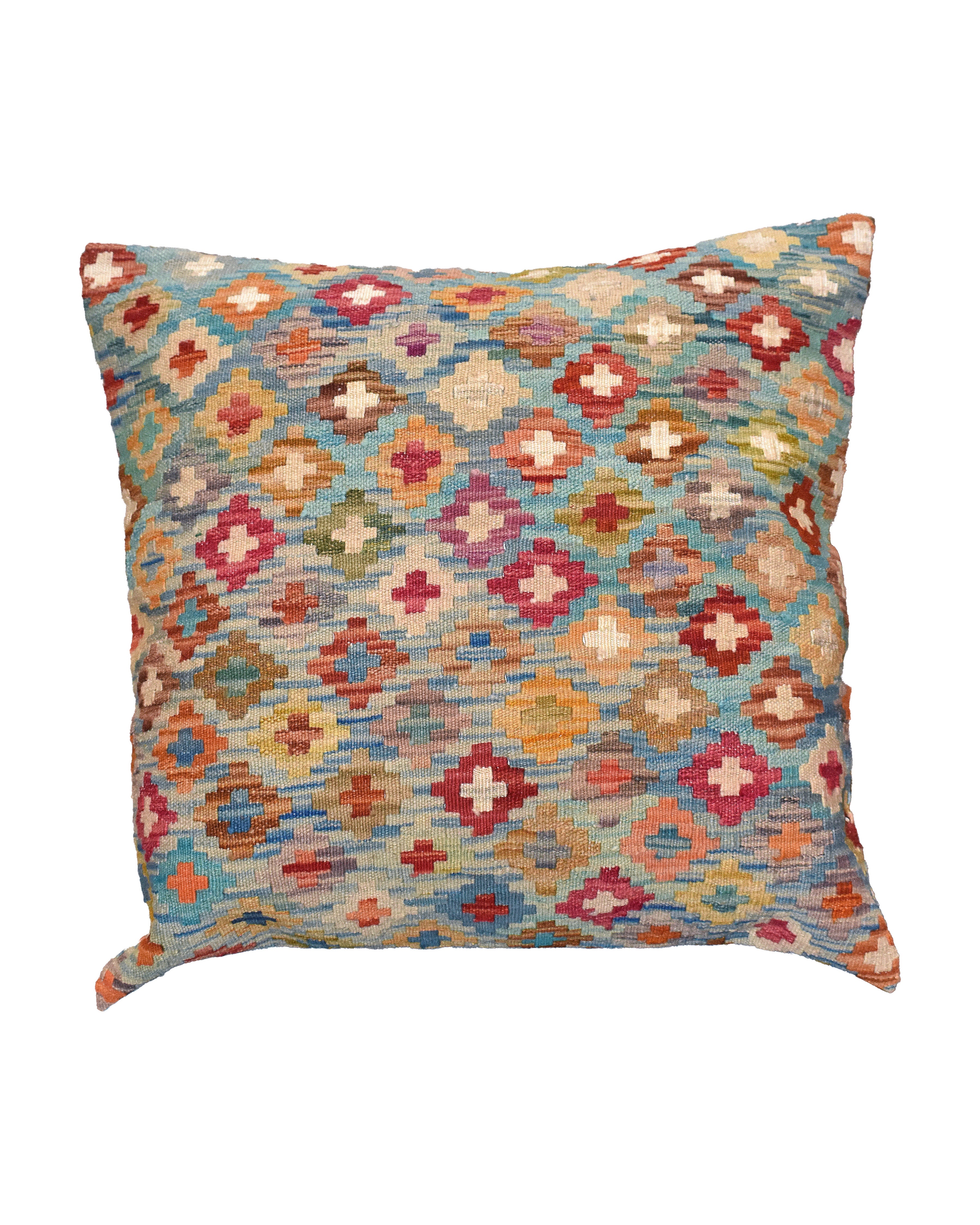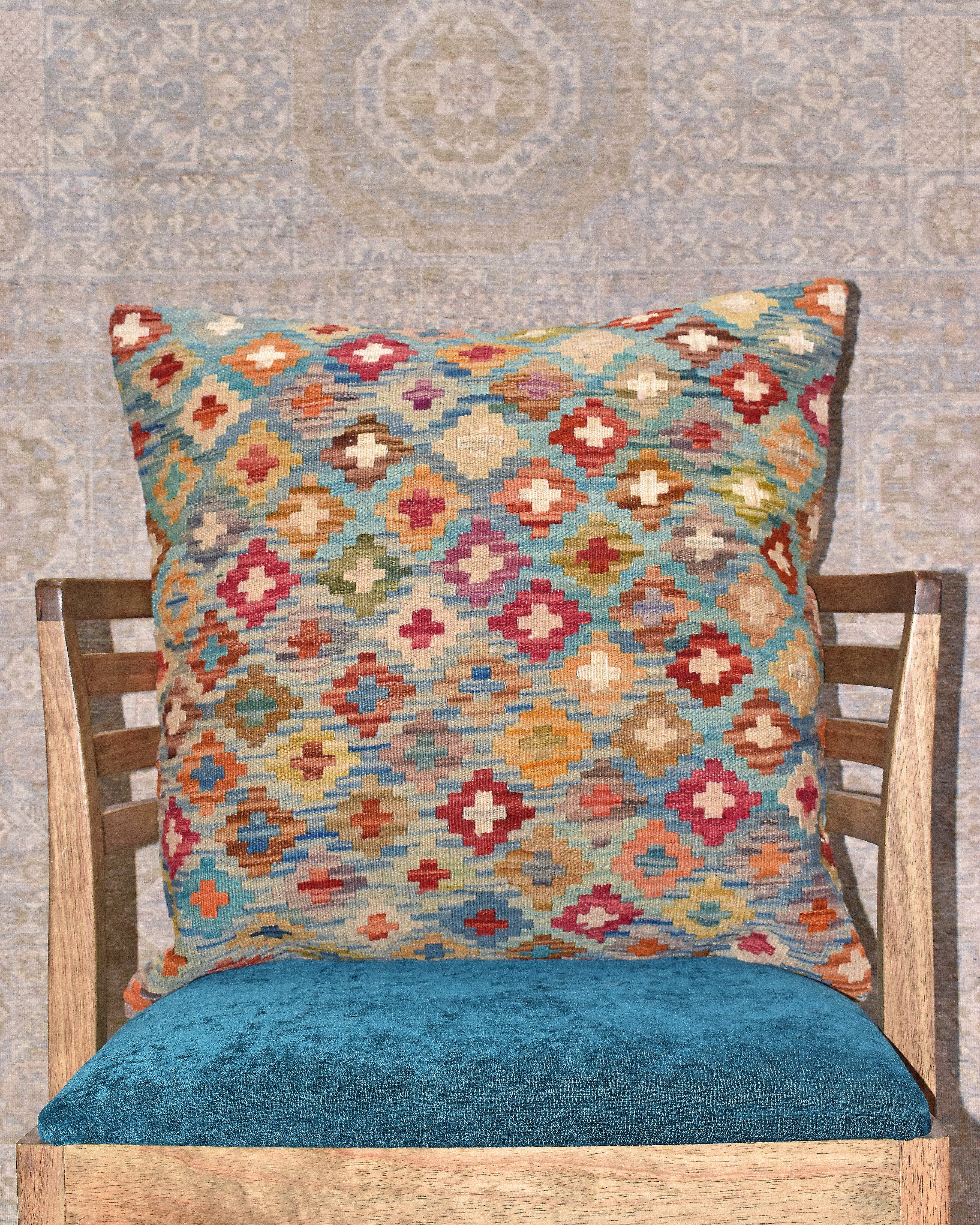 Afghan Maimana kilim cushions feature traditional flat-weave construction with bold geometric patterns in bright and earthy tones.