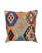 Afghan Maimana kilim cushions feature traditional flat-weave construction with bold geometric patterns in bright and earthy tones.