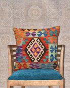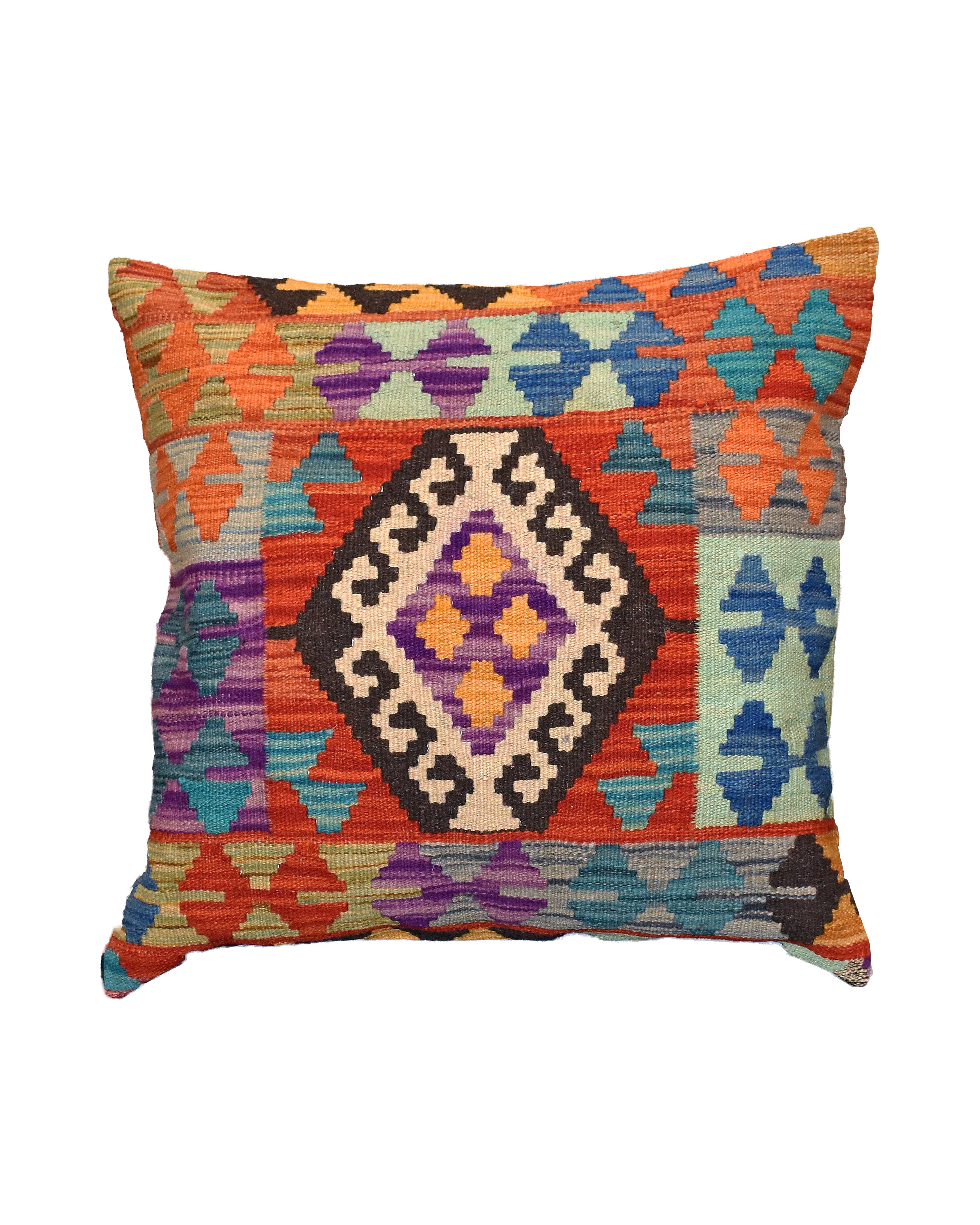 Afghan Maimana kilim cushions feature traditional flat-weave construction with bold geometric patterns in bright and earthy tones.
