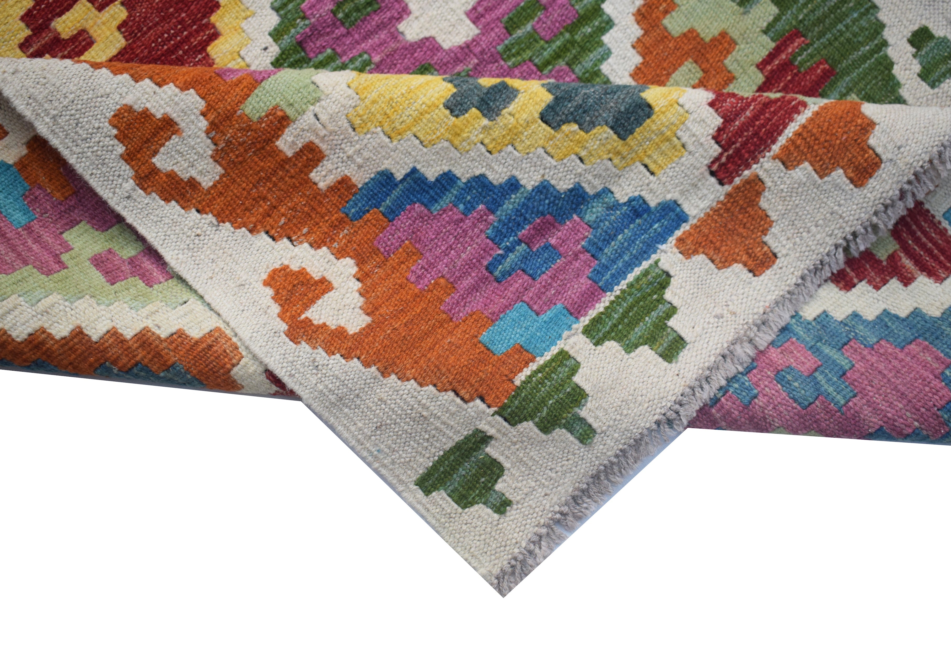 Maimana kilims are a proud product of the Frayab province in northern Afghanistan, with their name derived from the historic city of Maimana, a key trading hub along the ancient Silk Road. These kilims reflect centuries-old weaving traditions passed down through generations of tribal artisans. Their distinctive geometric patterns and bold designs are influenced by the nomadic lifestyle of the region, where practicality meets artistry in textile creation. The Maimana region is known for its semi-arid landscapes, where the weavers source high-quality wool from local sheep, spin it by hand, and dye it using natural substances, often inspired by the earthy hues of their surroundings. These kilims are flatwoven without a pile, a technique that makes them lightweight, reversible, and perfect for diverse applications, from floor coverings to wall hangings.