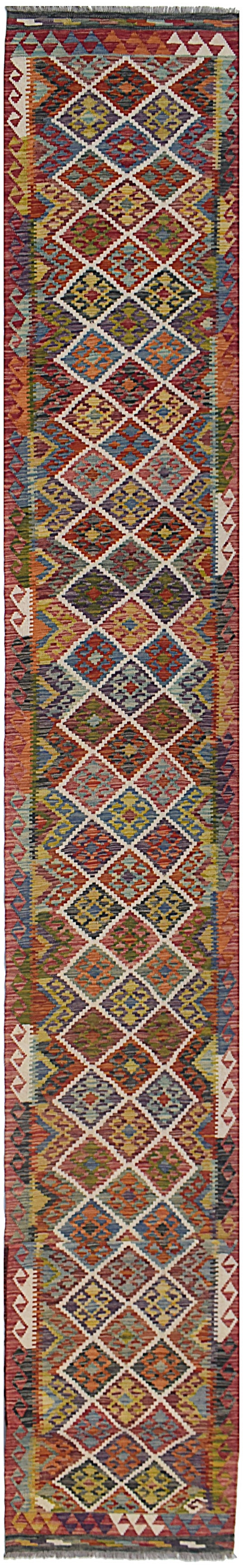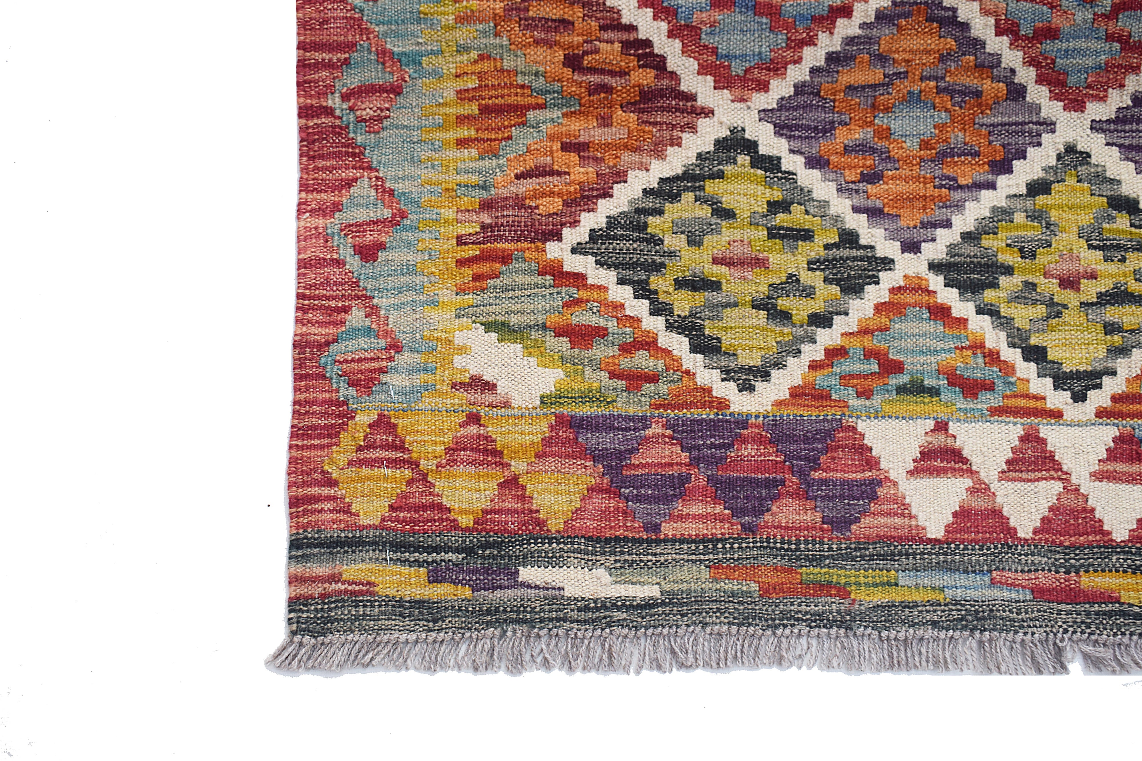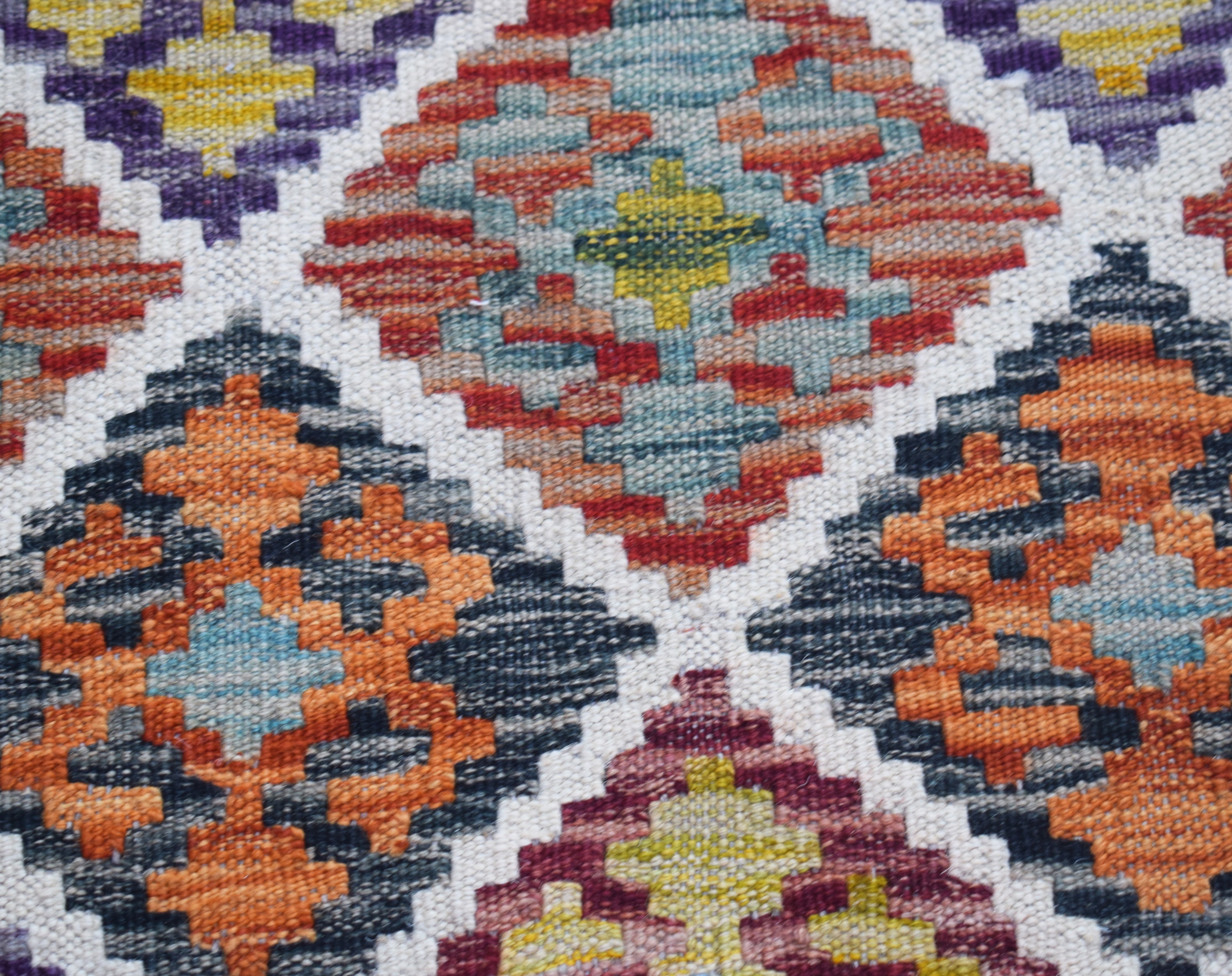 Maimana kilims are a proud product of the Frayab province in northern Afghanistan, with their name derived from the historic city of Maimana, a key trading hub along the ancient Silk Road. These kilims reflect centuries-old weaving traditions passed down through generations of tribal artisans. Their distinctive geometric patterns and bold designs are influenced by the nomadic lifestyle of the region, where practicality meets artistry in textile creation. The Maimana region is known for its semi-arid landscapes, where the weavers source high-quality wool from local sheep, spin it by hand, and dye it using natural substances, often inspired by the earthy hues of their surroundings. These kilims are flatwoven without a pile, a technique that makes them lightweight, reversible, and perfect for diverse applications, from floor coverings to wall hangings.