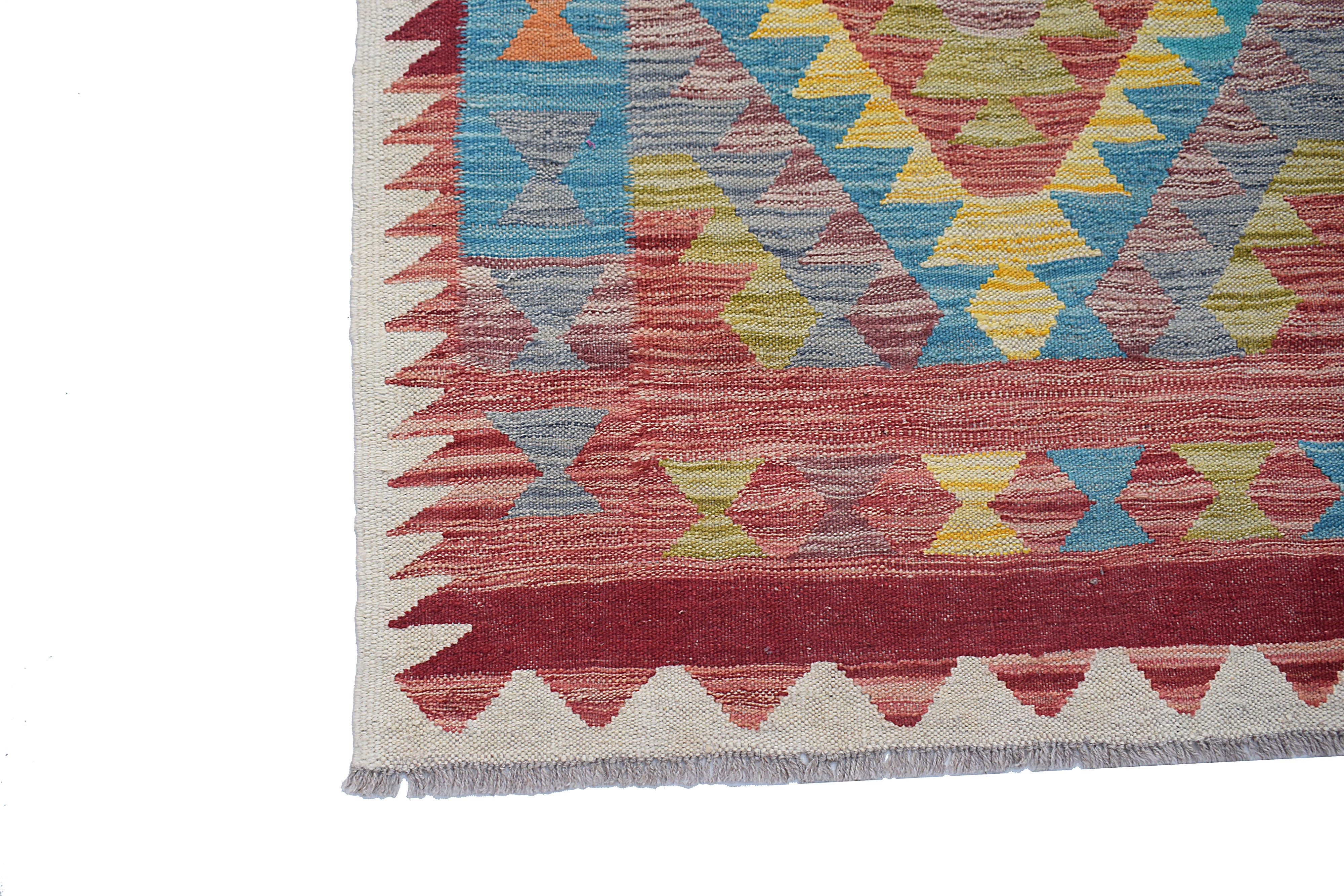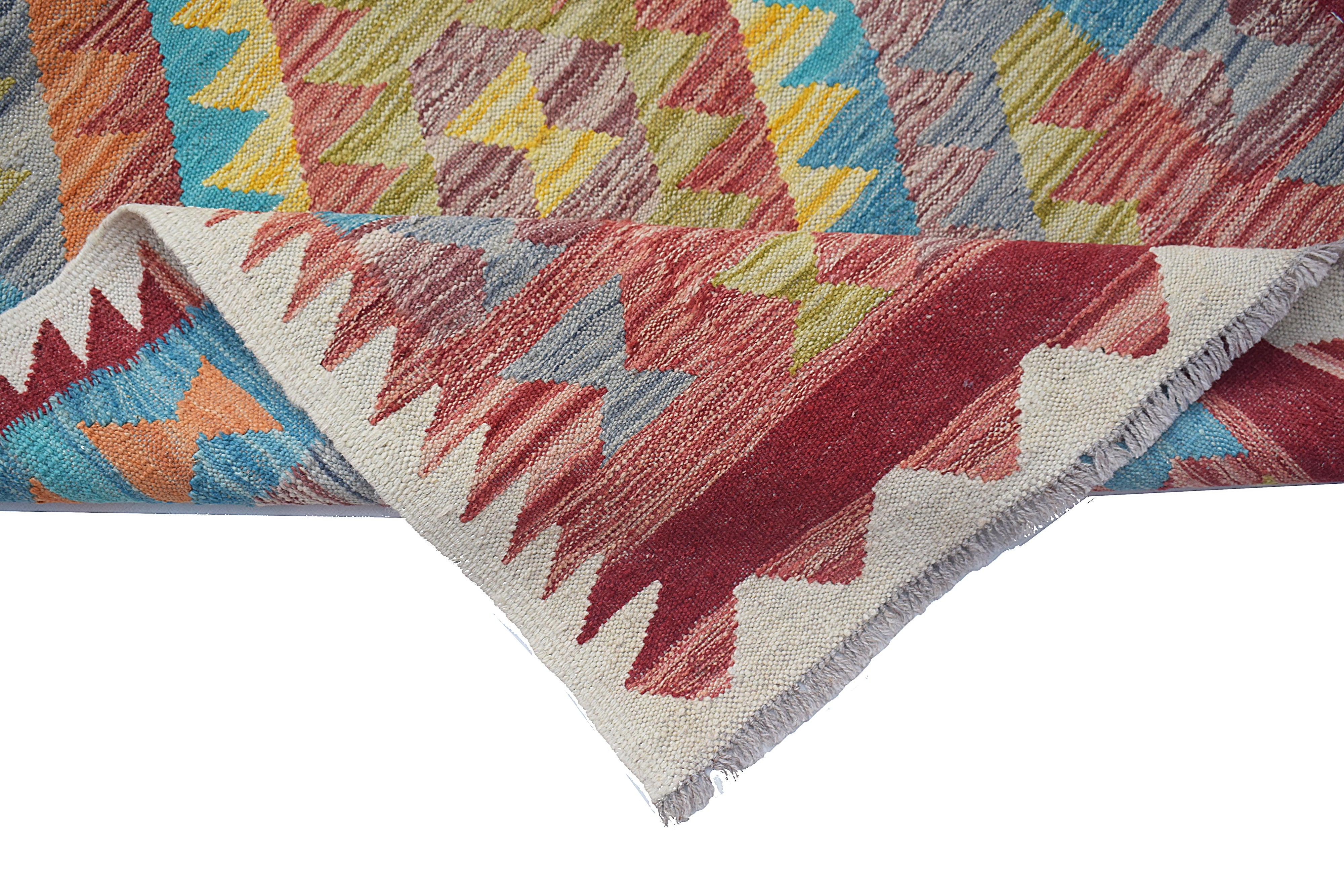 Maimana kilims are a proud product of the Frayab province in northern Afghanistan, with their name derived from the historic city of Maimana, a key trading hub along the ancient Silk Road. These kilims reflect centuries-old weaving traditions passed down through generations of tribal artisans. Their distinctive geometric patterns and bold designs are influenced by the nomadic lifestyle of the region, where practicality meets artistry in textile creation. The Maimana region is known for its semi-arid landscapes, where the weavers source high-quality wool from local sheep, spin it by hand, and dye it using natural substances, often inspired by the earthy hues of their surroundings. These kilims are flatwoven without a pile, a technique that makes them lightweight, reversible, and perfect for diverse applications, from floor coverings to wall hangings.