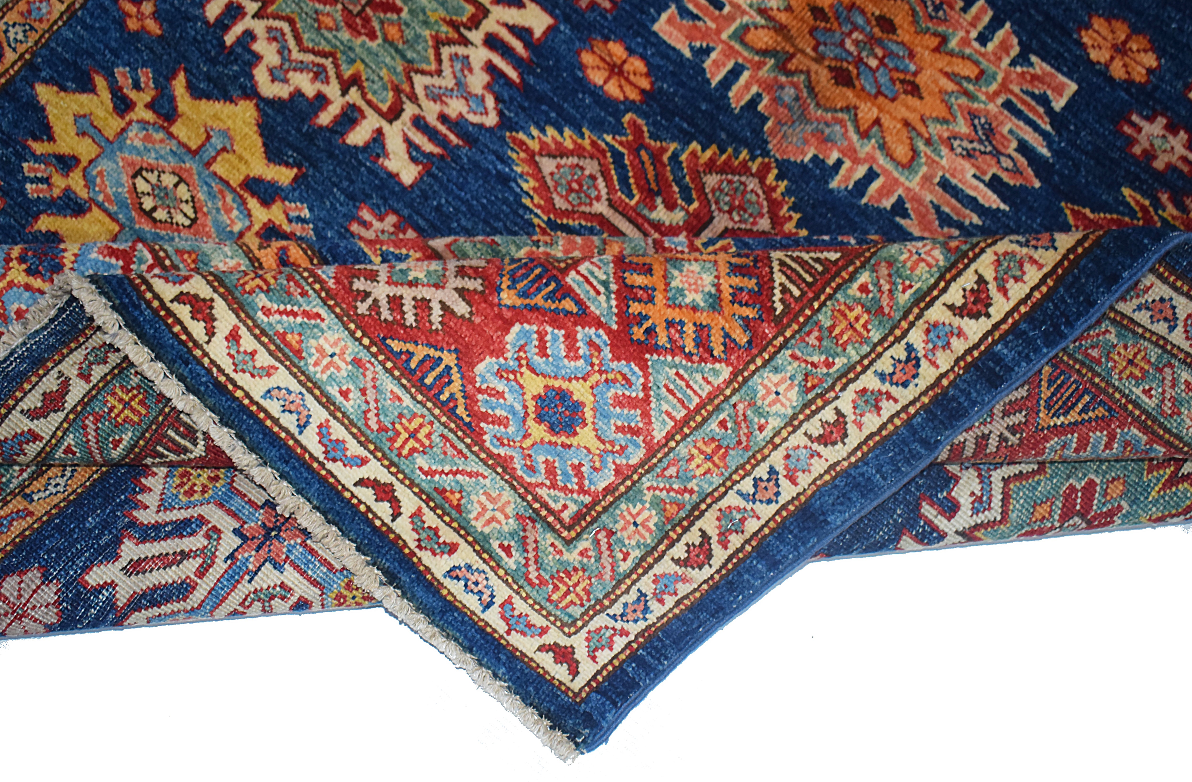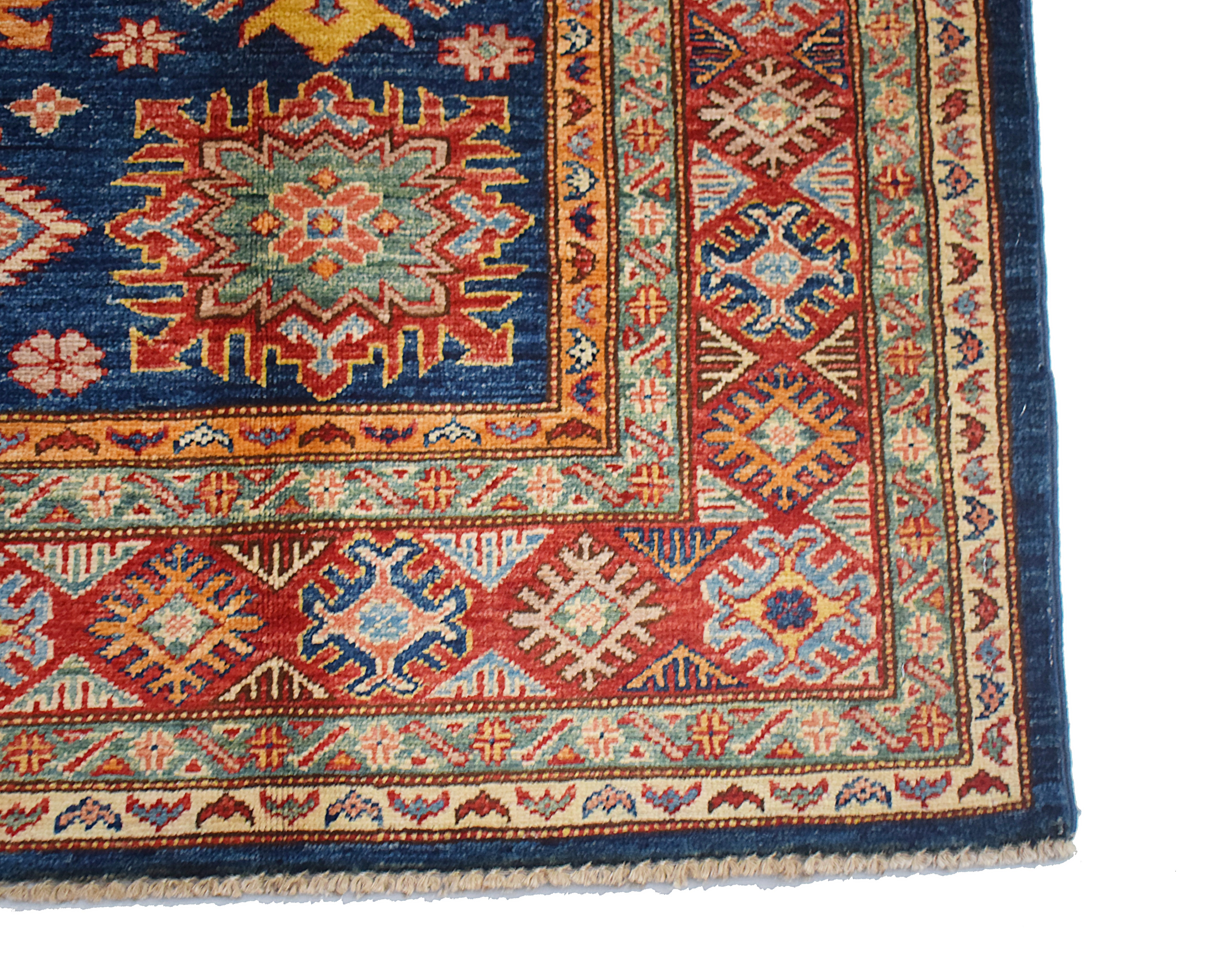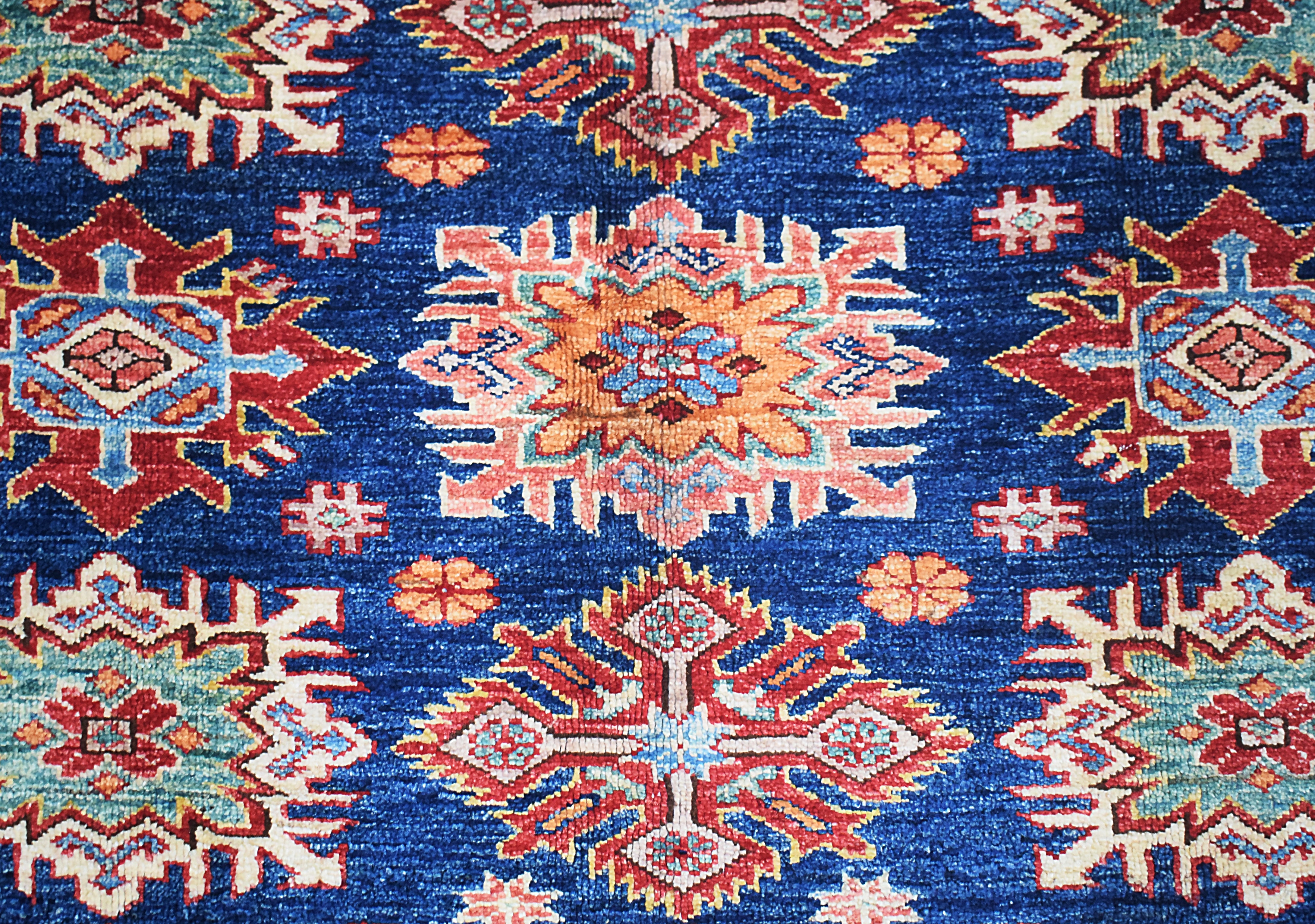 A Super Kazakh rug is a masterpiece of craftsmanship, woven by talented Hazara weavers who carry forward a rich tradition of artistry and skill. Known for their bold geometric patterns and striking colour combinations, these rugs draw inspiration from traditional Caucasian designs, featuring intricate motifs such as medallions, rosettes, and tribal symbols that reflect centuries of cultural heritage. Handwoven from high-quality wool with a dense weave, Super Kazakh rugs are not only visually stunning but also exceptionally durable, perfect for high-traffic areas or as statement pieces in your home. The vibrant palette—often showcasing rich reds, deep blues, and golden yellows—infuses warmth and character into any space. Each rug is a testament to the craftsmanship and dedication of Hazara artisans, blending heritage with modern appeal to complement any décor.