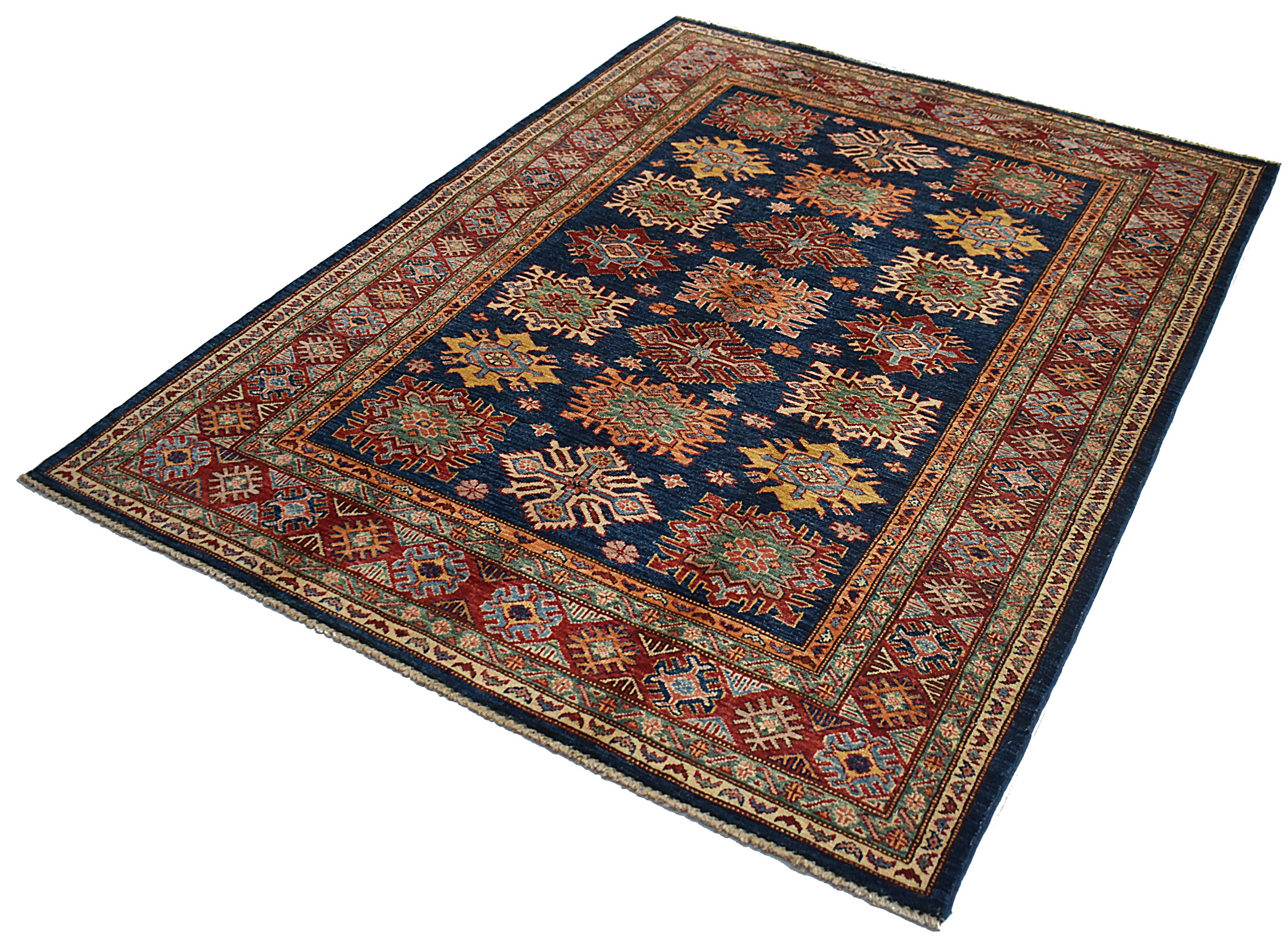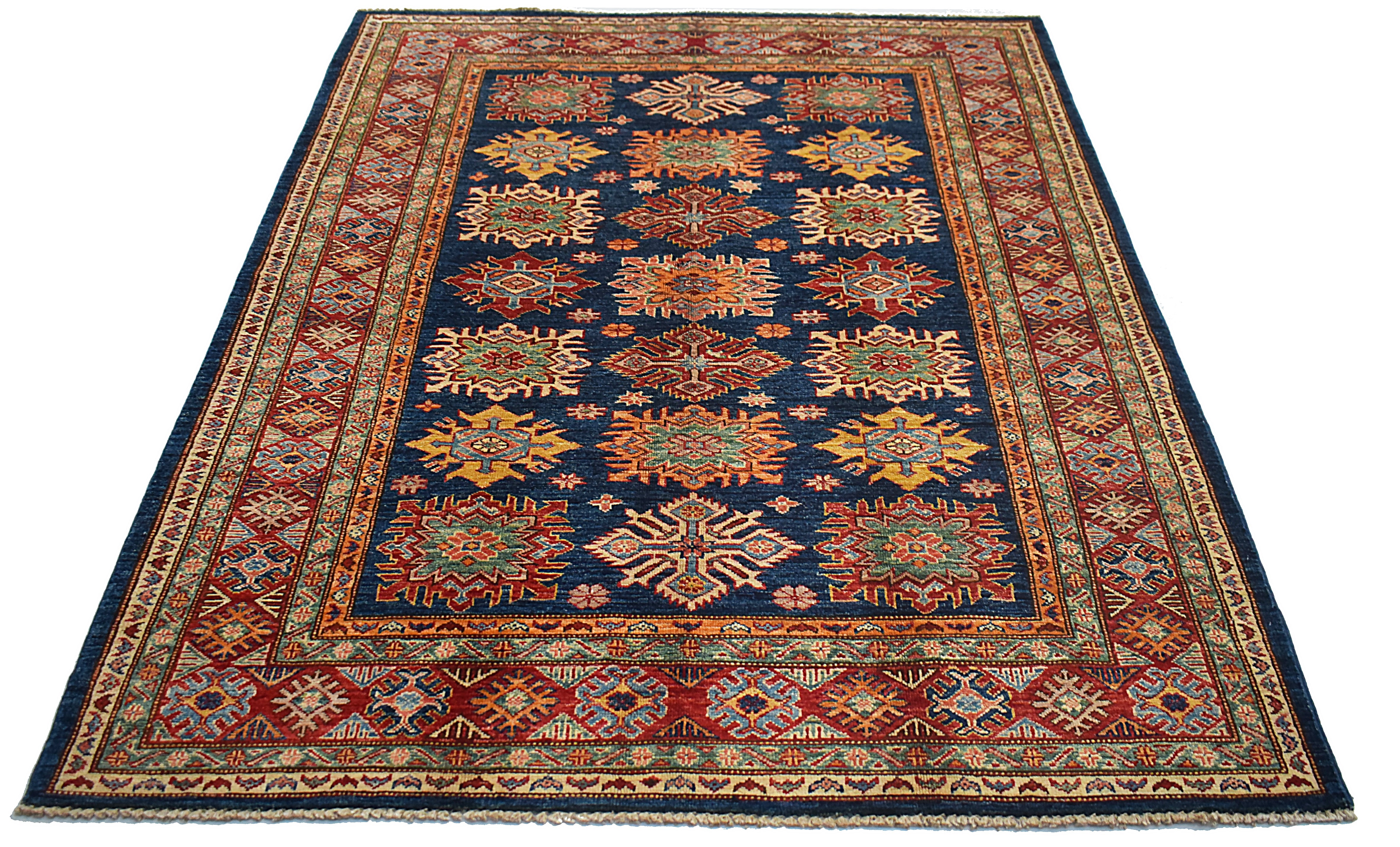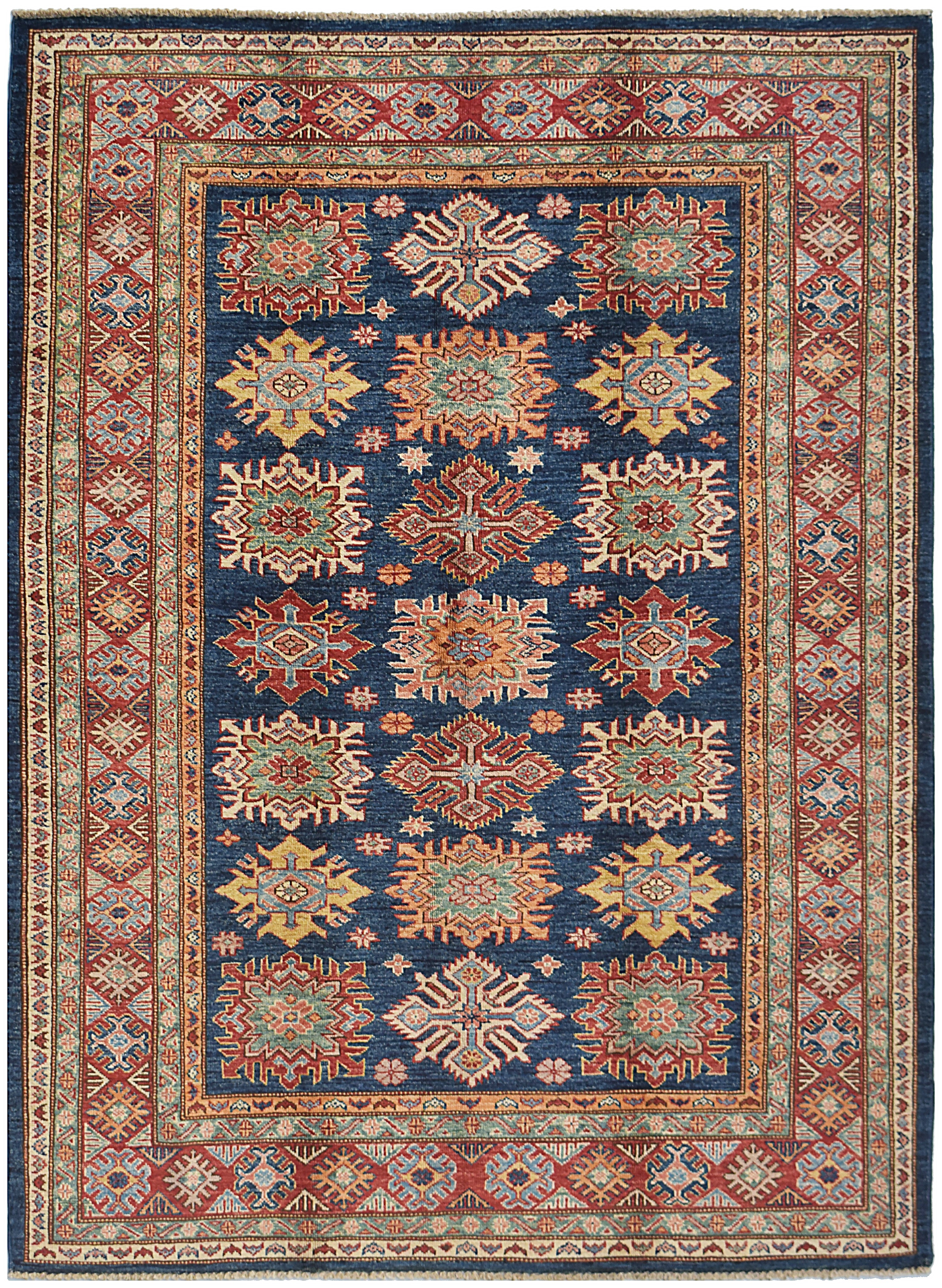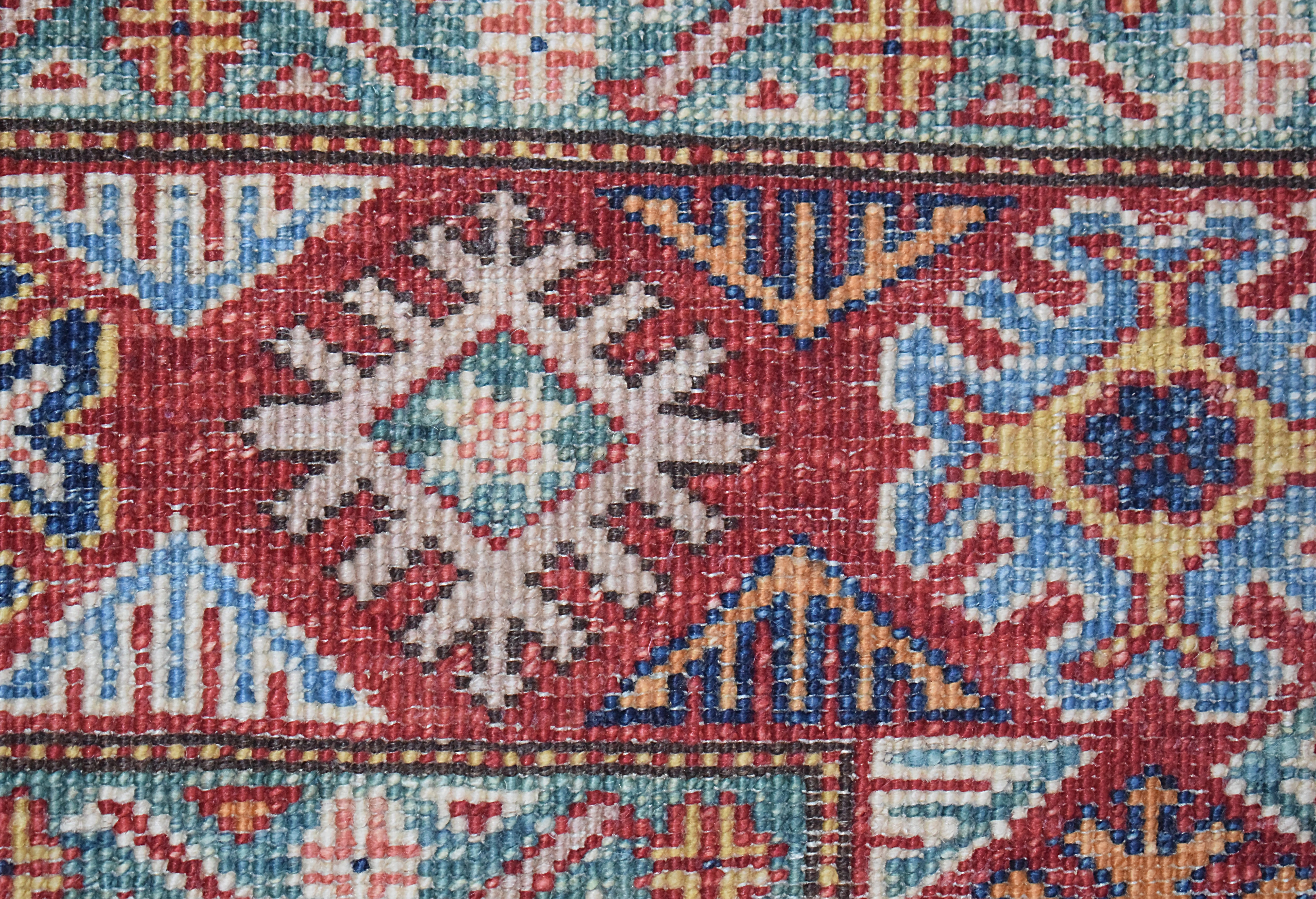 A Super Kazakh rug is a masterpiece of craftsmanship, woven by talented Hazara weavers who carry forward a rich tradition of artistry and skill. Known for their bold geometric patterns and striking colour combinations, these rugs draw inspiration from traditional Caucasian designs, featuring intricate motifs such as medallions, rosettes, and tribal symbols that reflect centuries of cultural heritage. Handwoven from high-quality wool with a dense weave, Super Kazakh rugs are not only visually stunning but also exceptionally durable, perfect for high-traffic areas or as statement pieces in your home. The vibrant palette—often showcasing rich reds, deep blues, and golden yellows—infuses warmth and character into any space. Each rug is a testament to the craftsmanship and dedication of Hazara artisans, blending heritage with modern appeal to complement any décor.