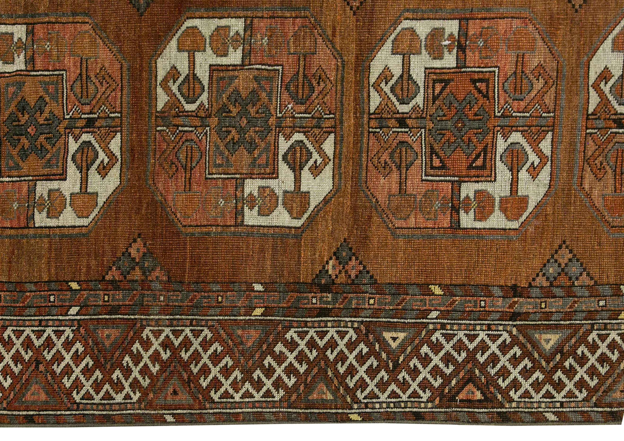 This 100-year-old Elephant's Foot Turkmen rug is a truly unique masterpiece, distinguished by its striking and uncommon colour palette of green and orange hues. These vibrant tones, derived from natural dyes, have aged gracefully over the decades, creating a rich, harmonious blend that sets this rug apart from more traditional colour schemes. The green evokes a sense of earthy vitality, while the orange adds warmth and depth, making the rug a captivating focal point.