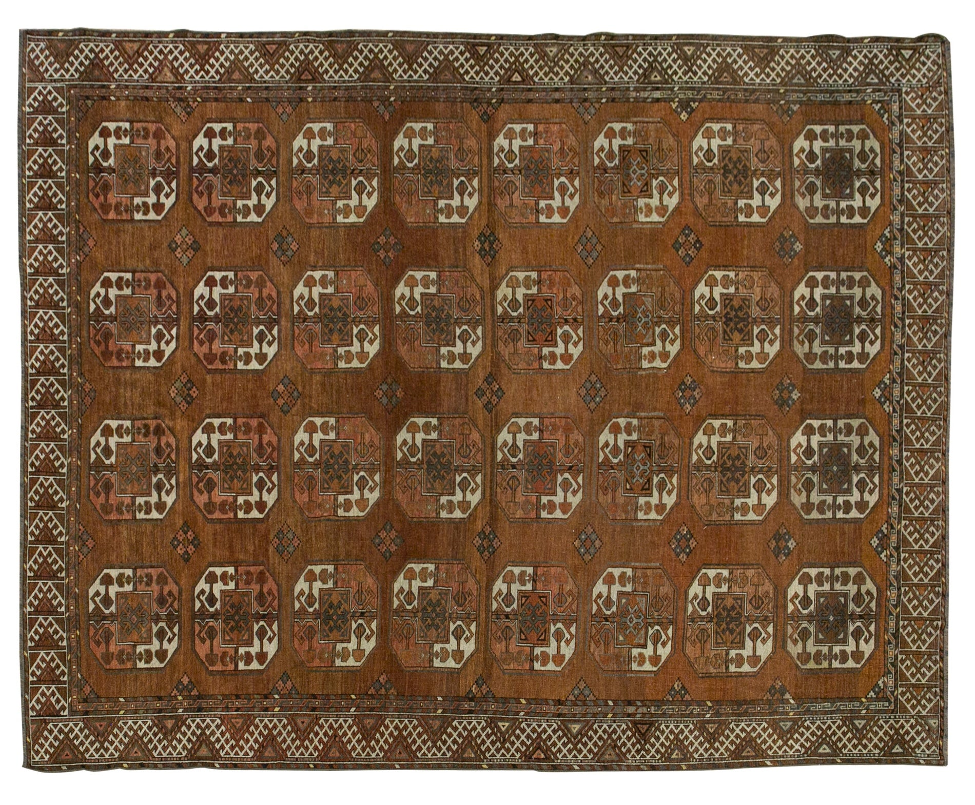 The iconic "elephant's foot" motif, rendered in these distinctive colours, stands out boldly against the rug's field, showcasing the artistry and skill of Turkmen weavers. Each geometric pattern and tribal symbol is meticulously crafted, telling a story of nomadic heritage and cultural pride. The rug's age is evident in its soft, weathered texture and subtle signs of use, which only enhance its authenticity and character.