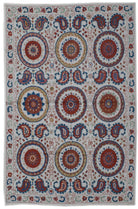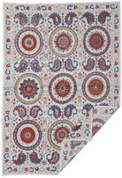 These beautiful suzanis are a cloth that holds multiple uses, such as wall hanging, bed cover, table cloth and even just as a throw. This suzani has a cotton fabric base with silk embroidery. Popular motifs within Suzanis are sun and moon disks, flowers, leaves and fruits.