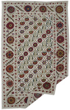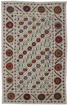 These beautiful suzanis are a cloth that holds multiple uses, such as wall hanging, bed cover, table cloth and even just as a throw. This suzani has a cotton fabric base with silk embroidery. Popular motifs within Suzanis are sun and moon disks, flowers, leaves and fruits.