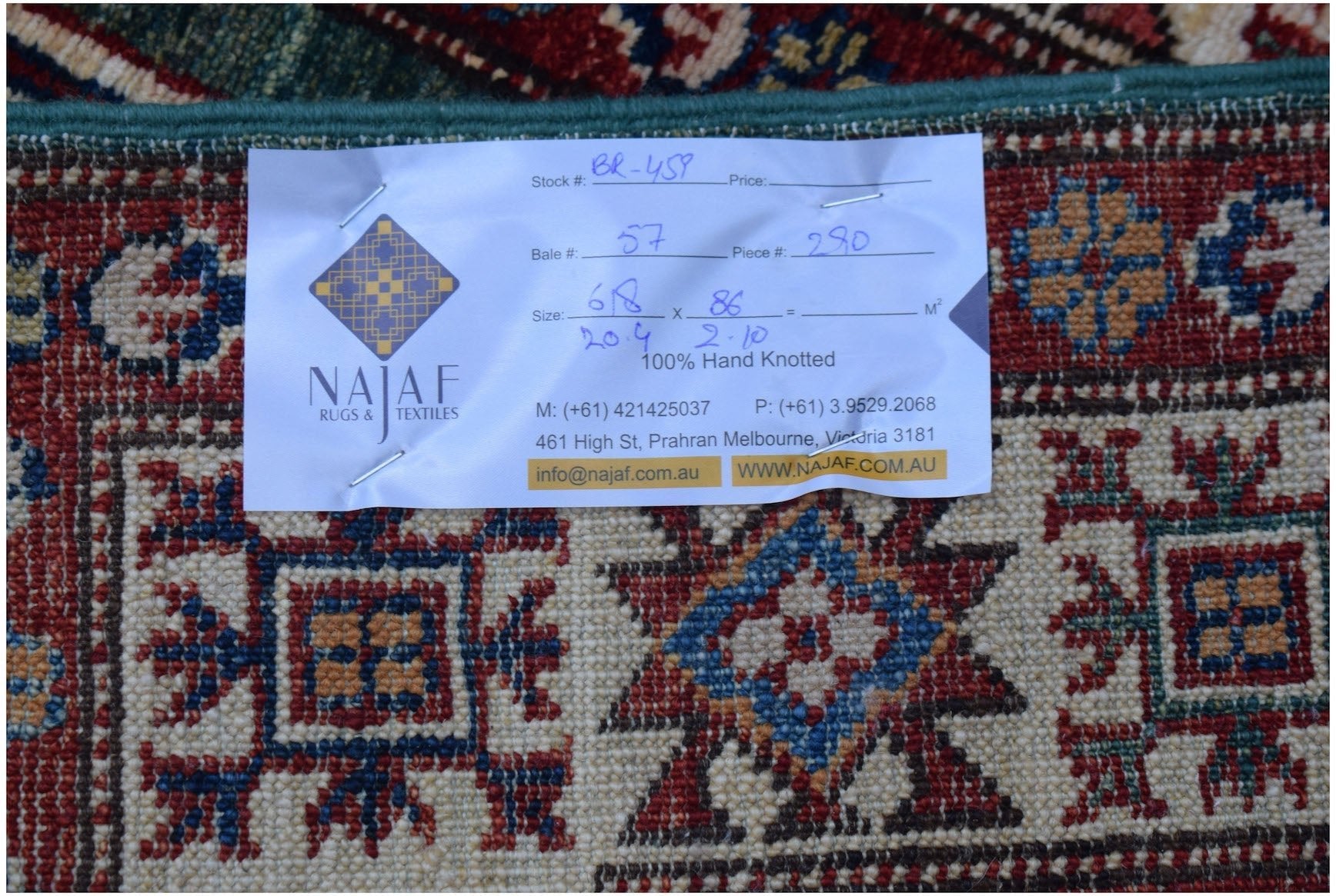 Handmade in Kabul, Afghanistan, this Super Kazakh rug is one the highest quality rugs available in our collection. Made from the finest wool and incredible woven craftsmanship, this rug is truly handmade to last.