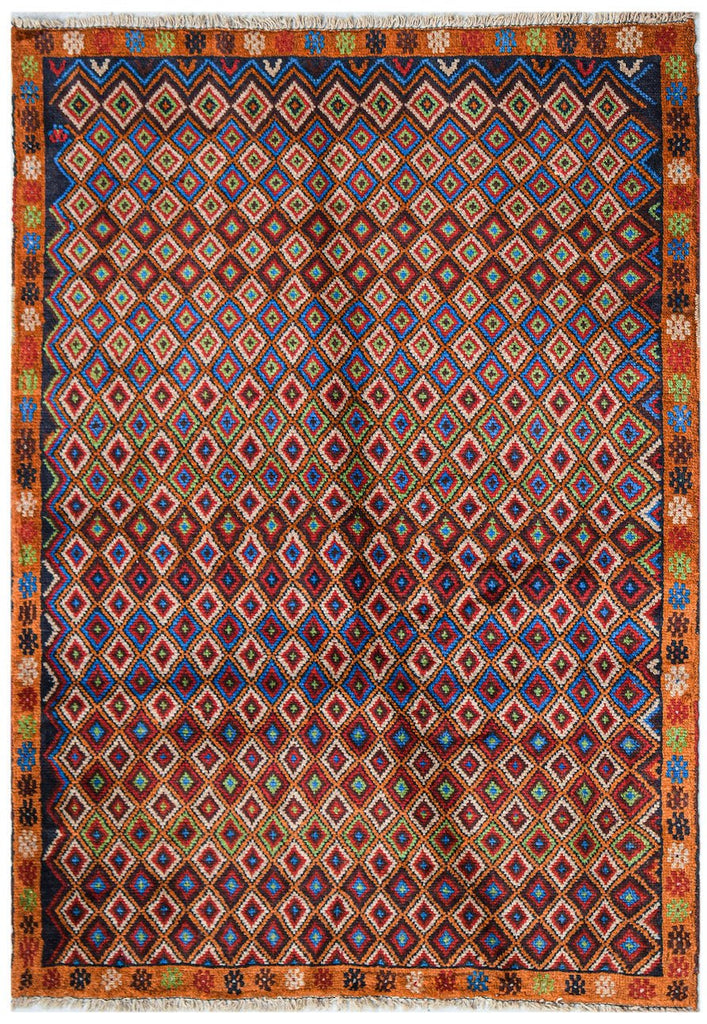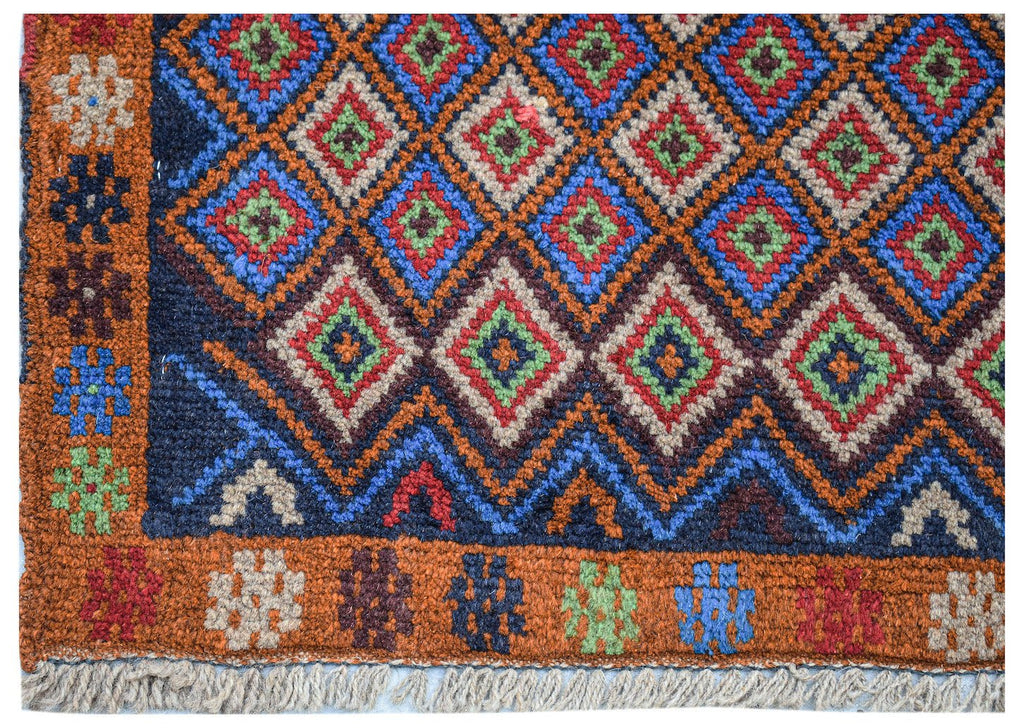 This tribal rug is from the Shindand town of the Herat Province in Afghanistan. Balouch rugs are world famous for dark reds, browns and blues with contrast of white or ivory