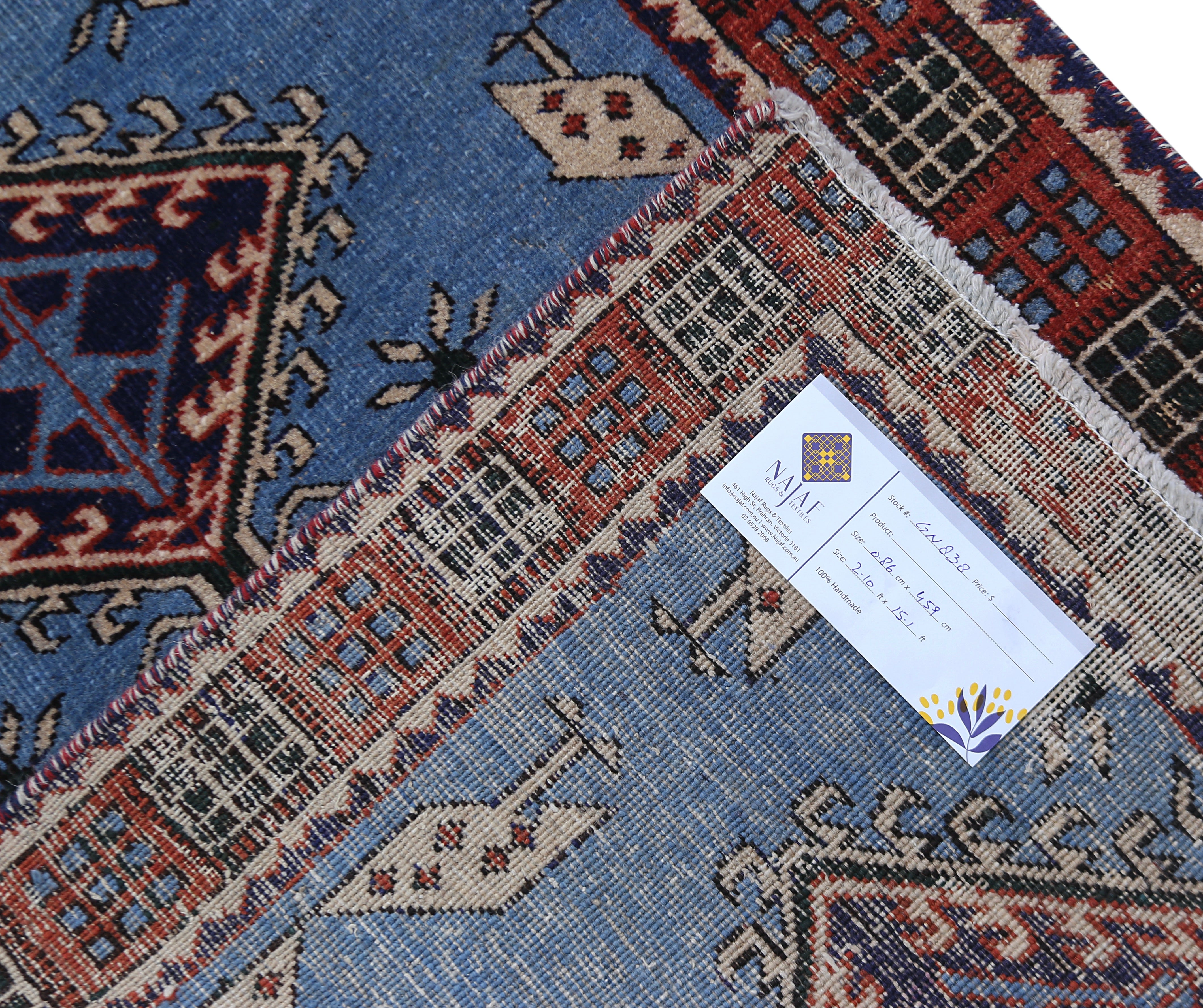 This vintage Caucasian rug is a stunning example of the artistry and craftsmanship of the Caucasus region, an area nestled between the Black Sea and the Caspian Sea, encompassing modern-day Armenia, Azerbaijan, Georgia, and parts of southern Russia. Known for their bold geometric patterns, symbolic tribal motifs, and vibrant colours, Caucasian rugs reflect the rich cultural heritage of the region. Hand-knotted using high-quality wool, this rug is as durable as it is beautiful. The palette of deep reds, blues, and ivory tones, paired with intricate designs, brings a unique and timeless charm to the piece. Each motif often holds cultural significance, making this rug not just a decorative item but a story woven into fibres.