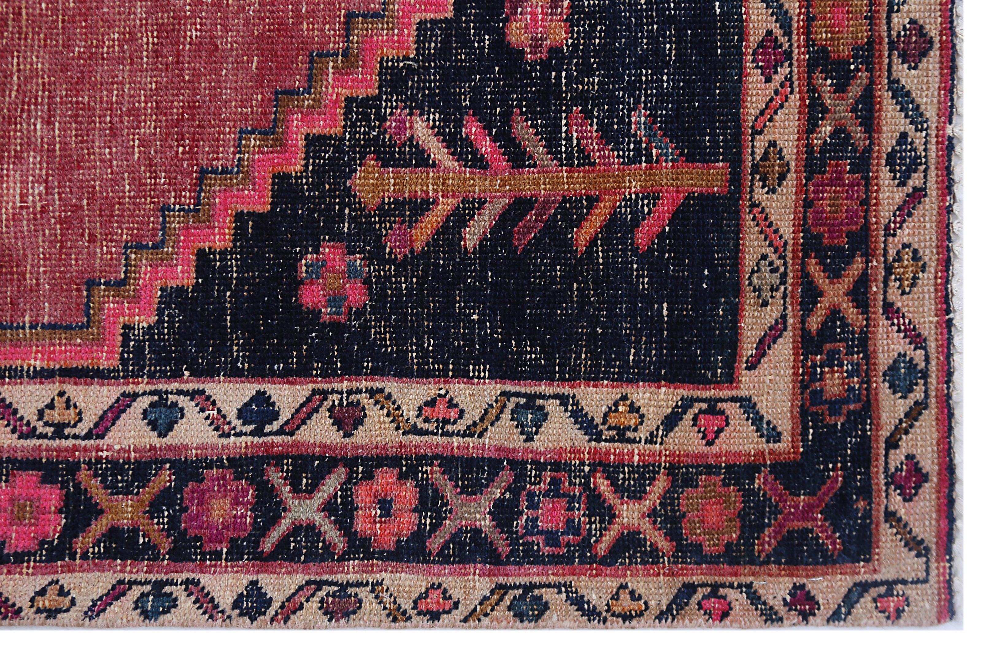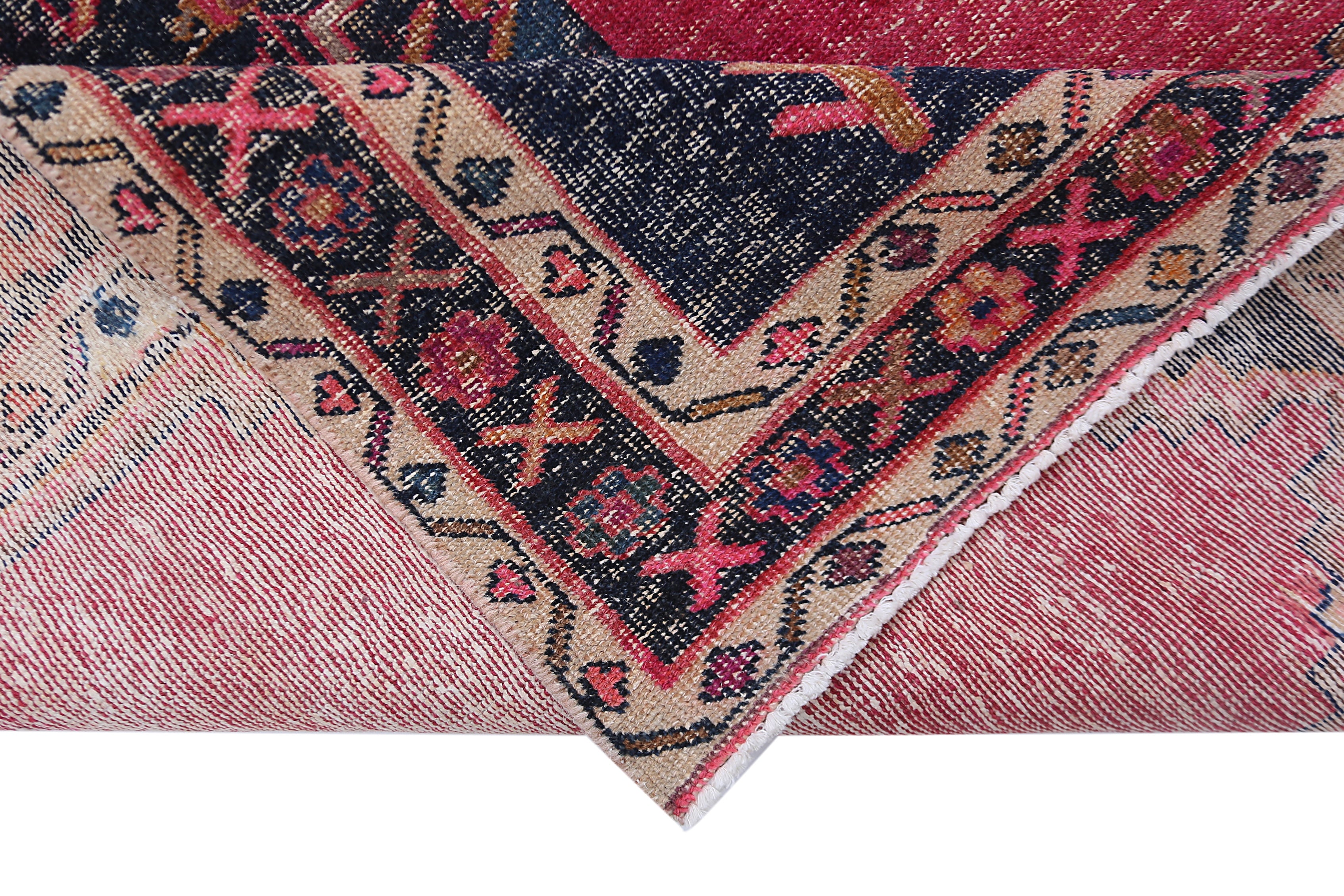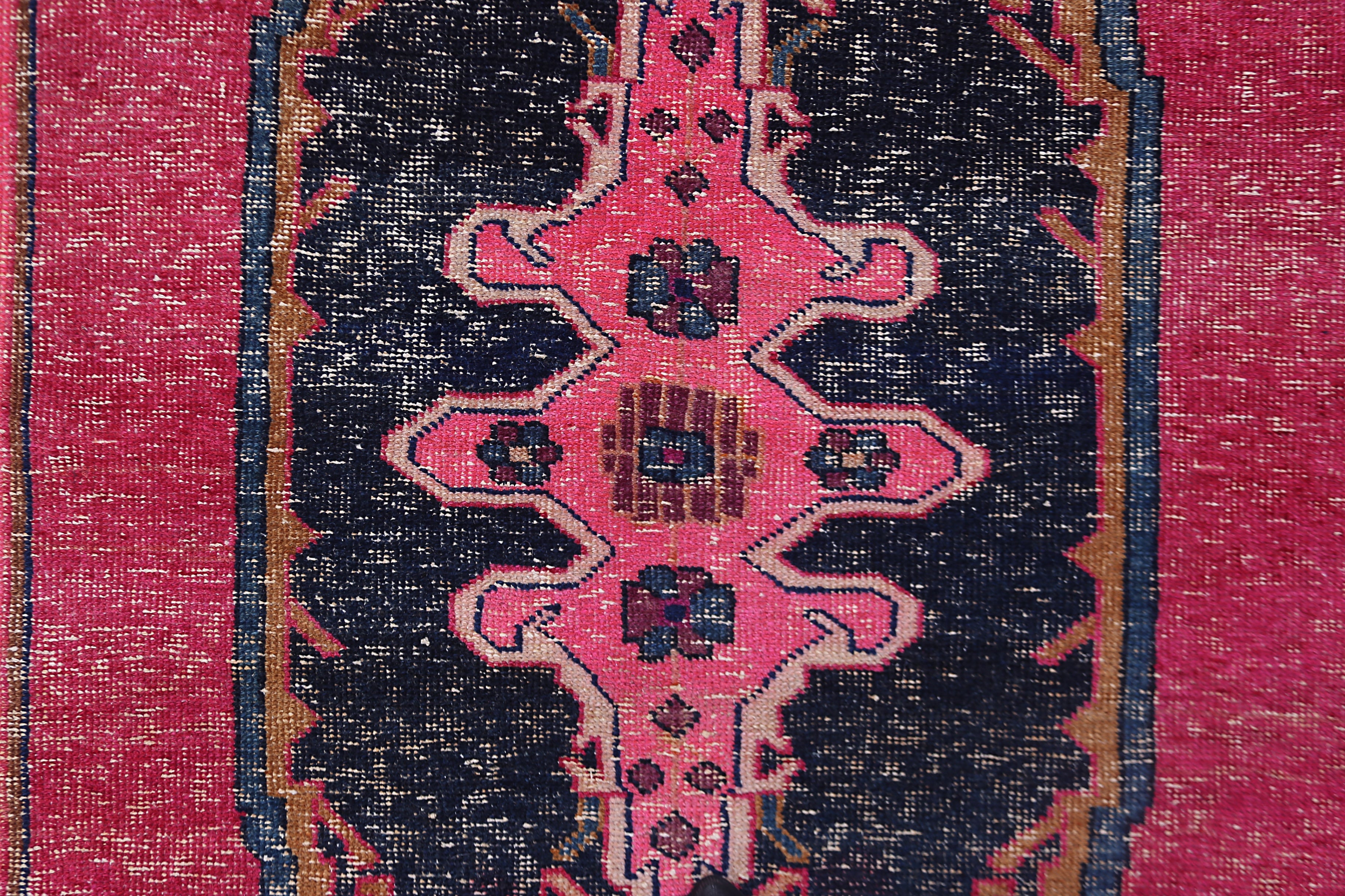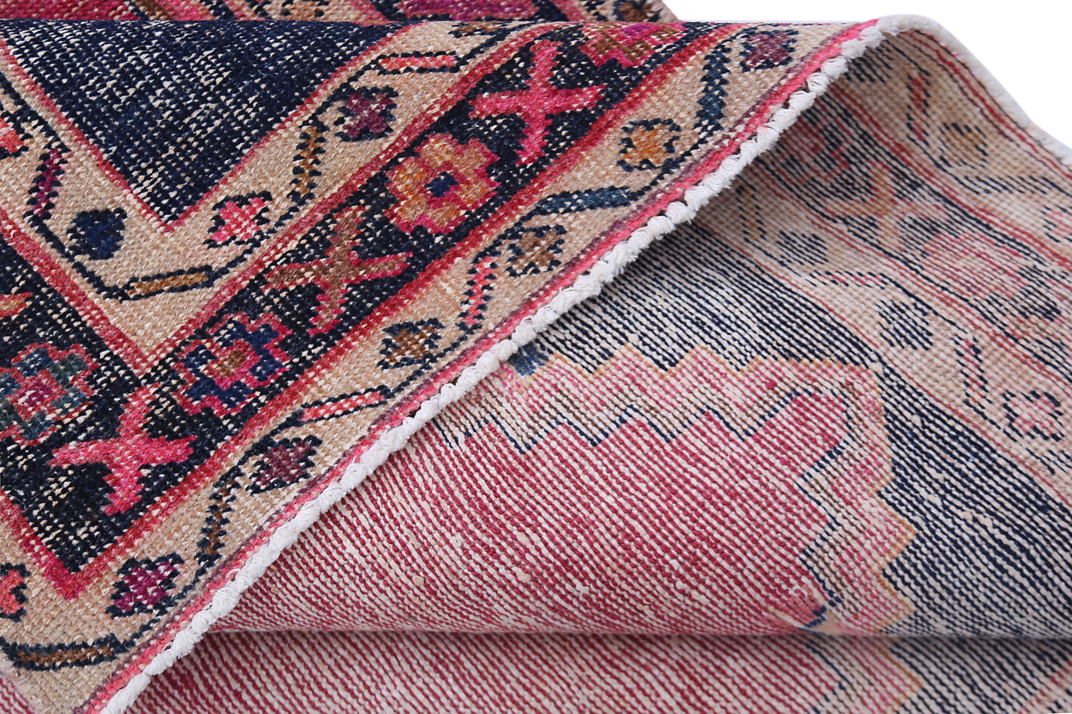 This vintage Persian rug showcases an elegant floral design, highlighted by its central medallion and framed by intricate borders. The warm base tones are beautifully complemented by vibrant pinks and blues, creating a striking yet harmonious colour palette. Hand-knotted with precision, this rug combines exceptional craftsmanship with a soft, durable texture. Its slightly worn finish enhances its vintage appeal, adding depth and character to the piece.