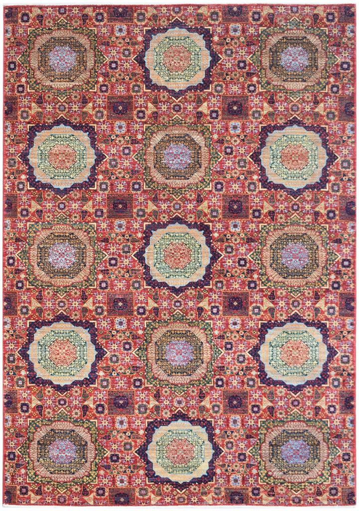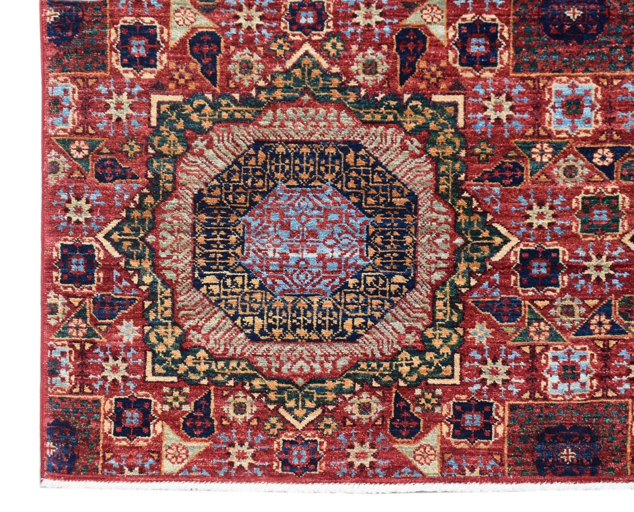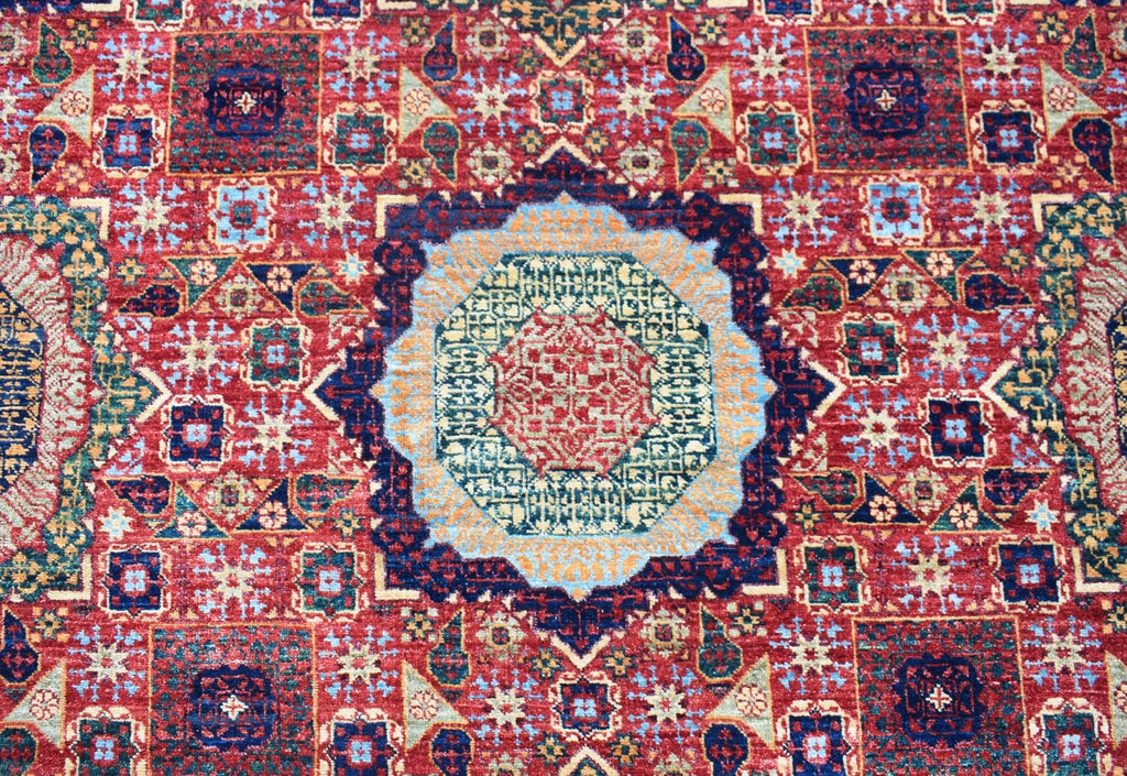 Mamluk is the name of the distinctive pattern on this rug. Mamluk rugs are very complex in pattern and always feature incredibly detailed medallions. Mamluk rugs originated from Egypt during the thirteenth century and continue to be in production to this day.